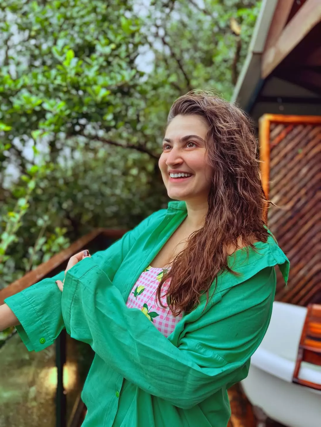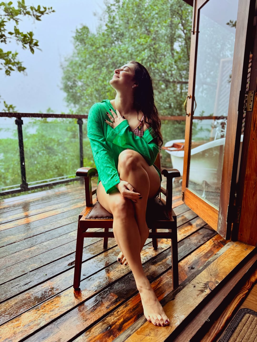 By: Tupaki Desk | 19 July 2025 10:11 AM ISTActress Shivaleeka Oberoi looks radiant and carefree in her latest photo dump, enjoying the monsoon magic in a lush green setting. Dressed in a light green oversized shirt over a checkered bikini, Shivaleeka exudes effortless charm and vacation-ready vibes. Her wet hair, natural glow, and wide smile perfectly complement the misty backdrop and wooden deck, making the frame feel like a postcard from paradise.