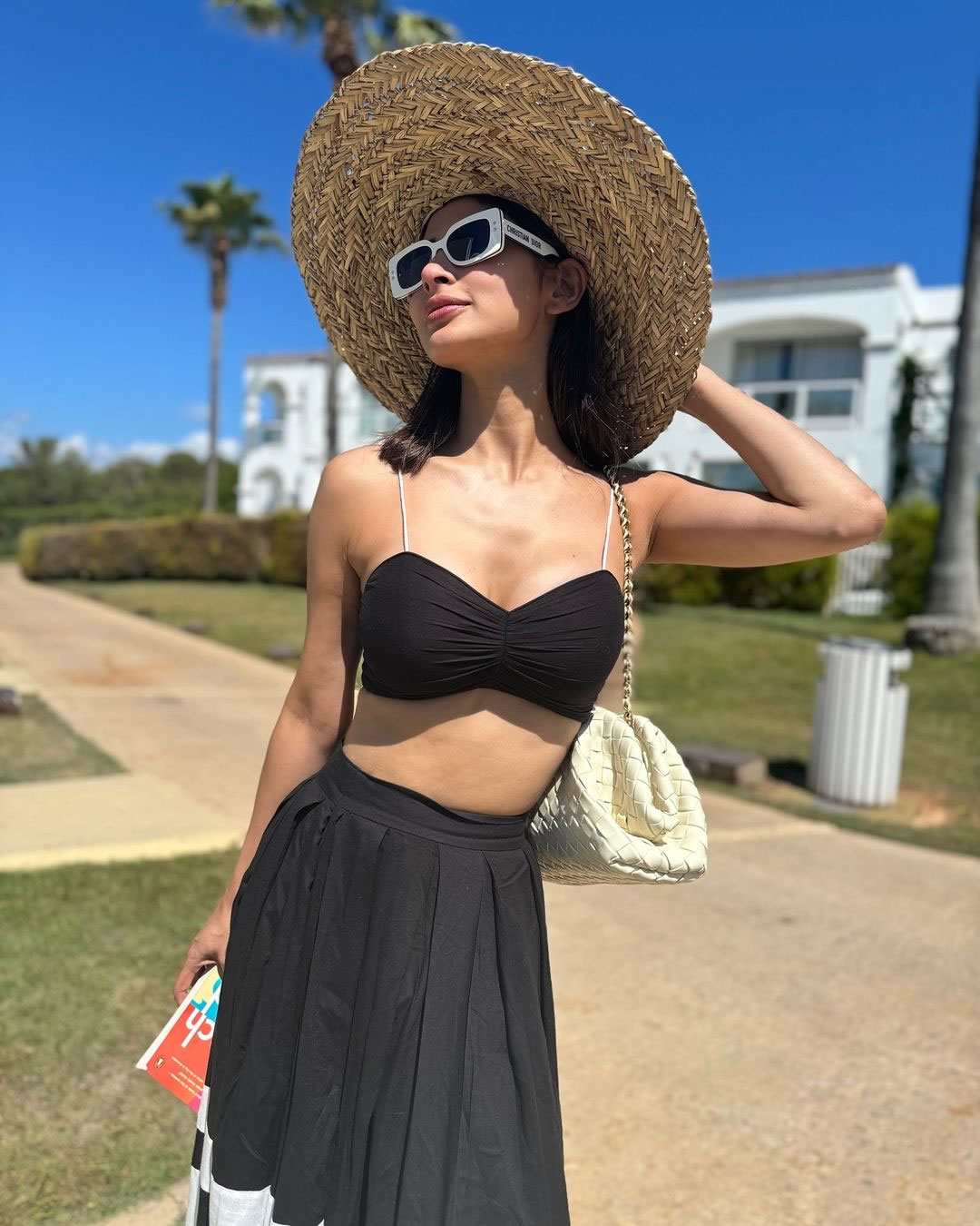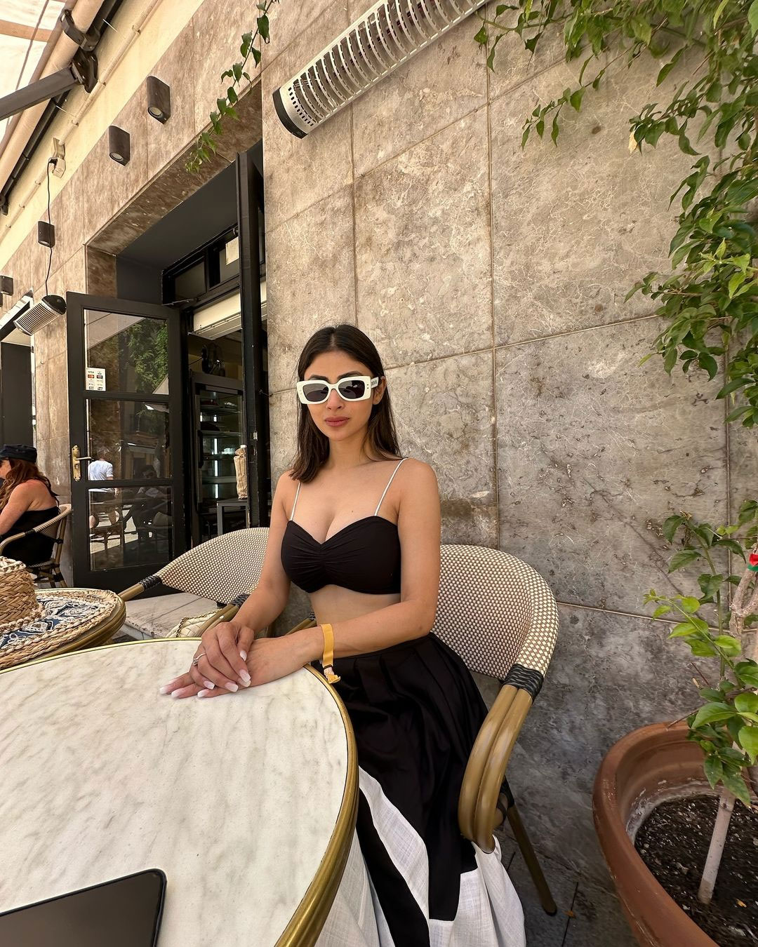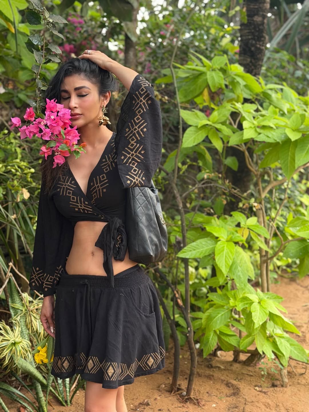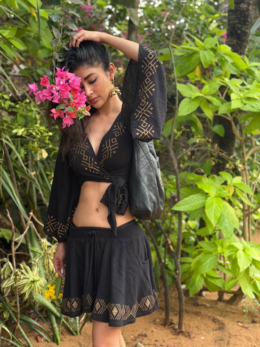 Mouni Roy, the enchanting actress celebrated for her captivating screen presence, continues to mesmerize fans with her latest photoshoots. In these stunning images, she blooms irrespective of the surroundings—radiating effortless grace amid lush greenery and vibrant blooms in one, and exuding poised elegance against rustic backdrops in another. Dressed in chic black ethnic fusion outfits with intricate gold patterns, deep necklines, and flowy silhouettes, Mouni poses confidently, her long wavy hair, bold makeup, and natural glow highlighting her timeless beauty and poise.
