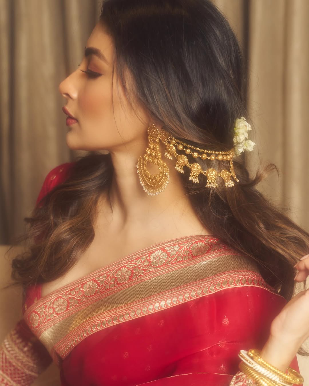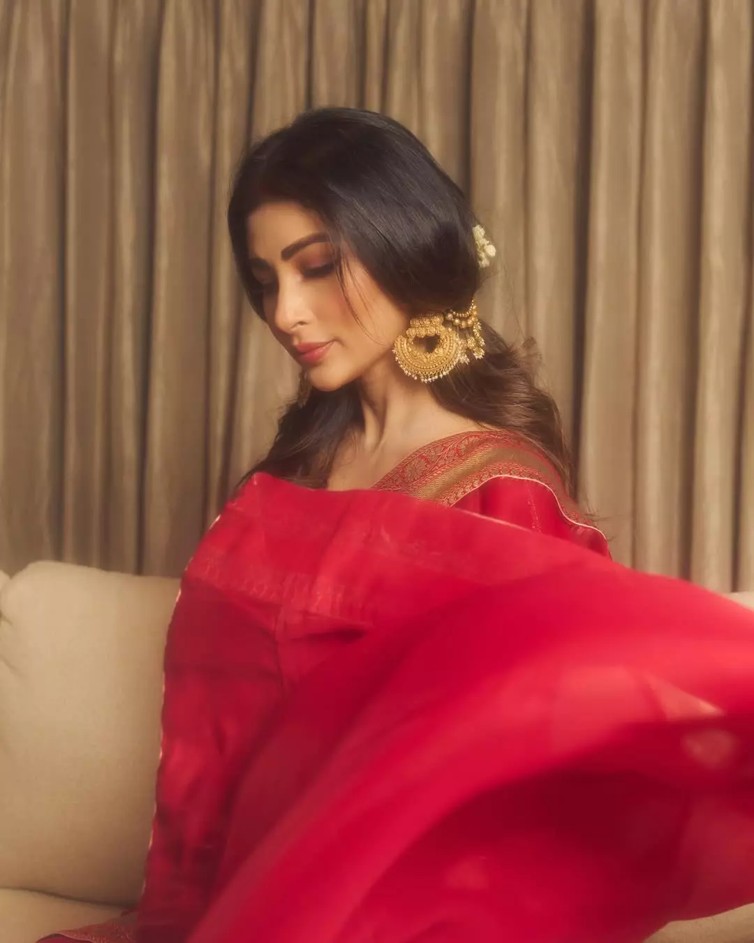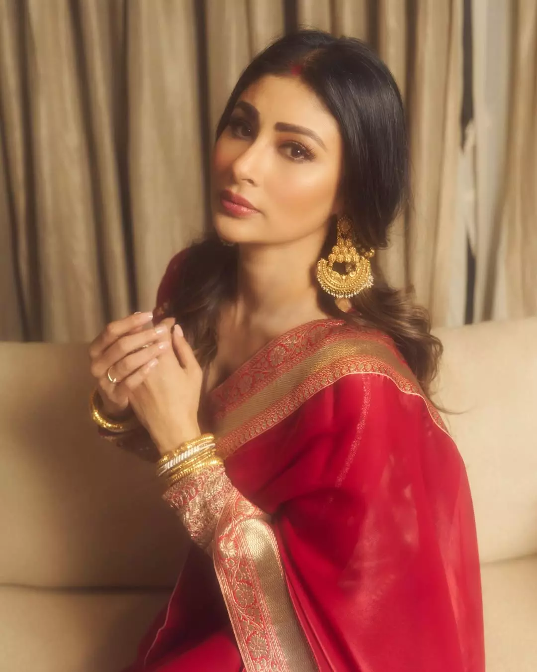 On the auspicious occasion of Maha Navami, Mouni Roy graced her Instagram followers with a serene and elegant image of herself draped in a Red saree. Accompanying the photo, she shared a heartfelt Bengali caption: