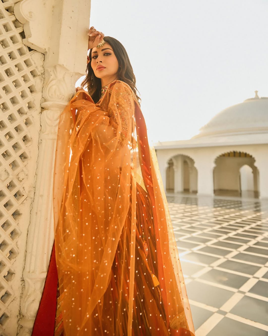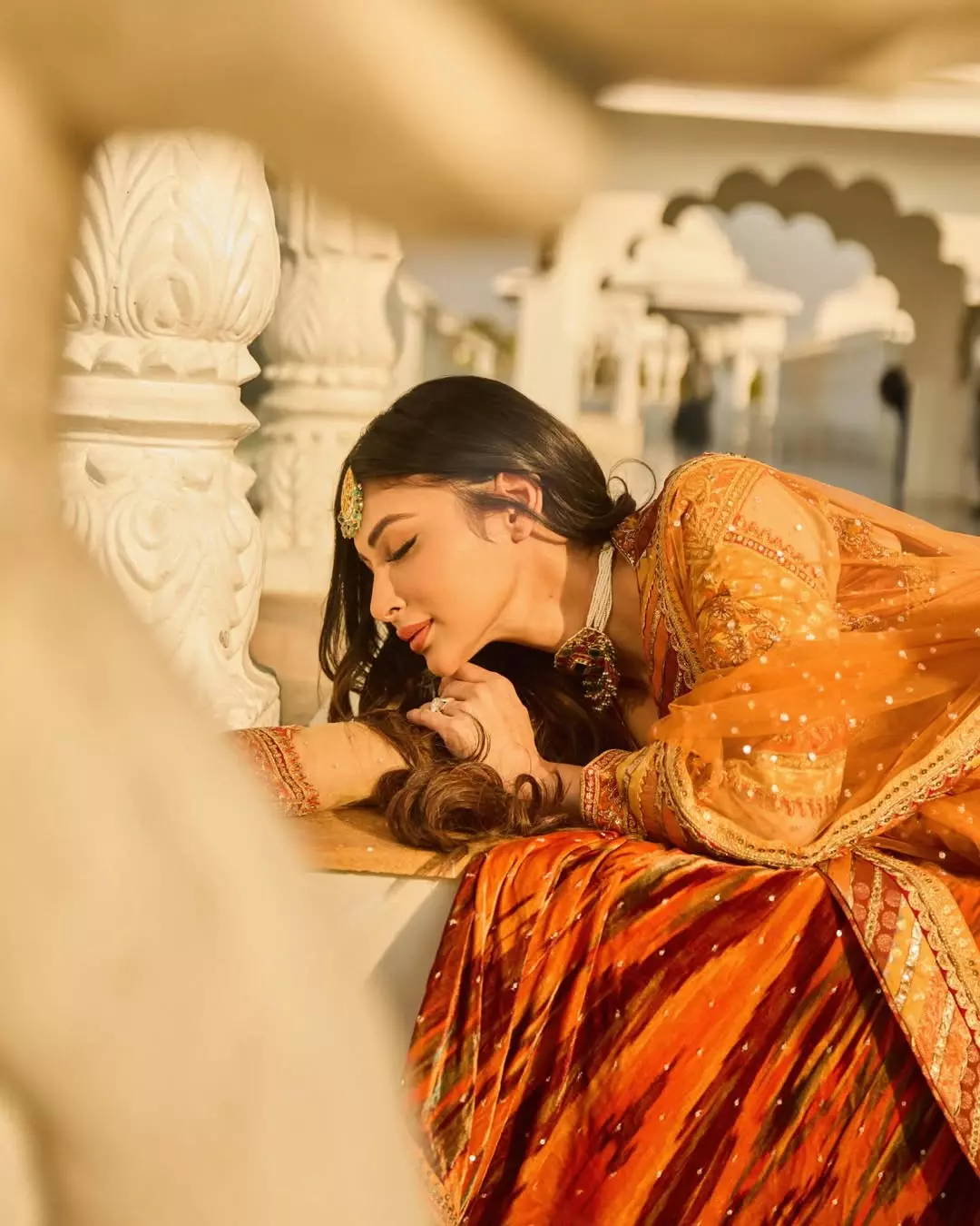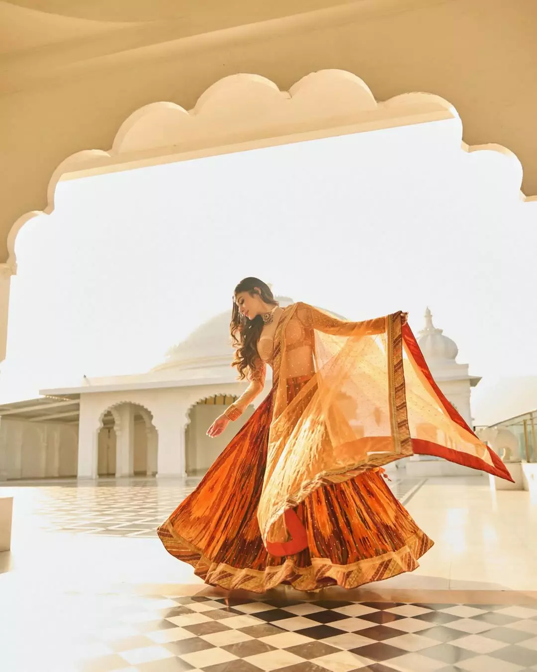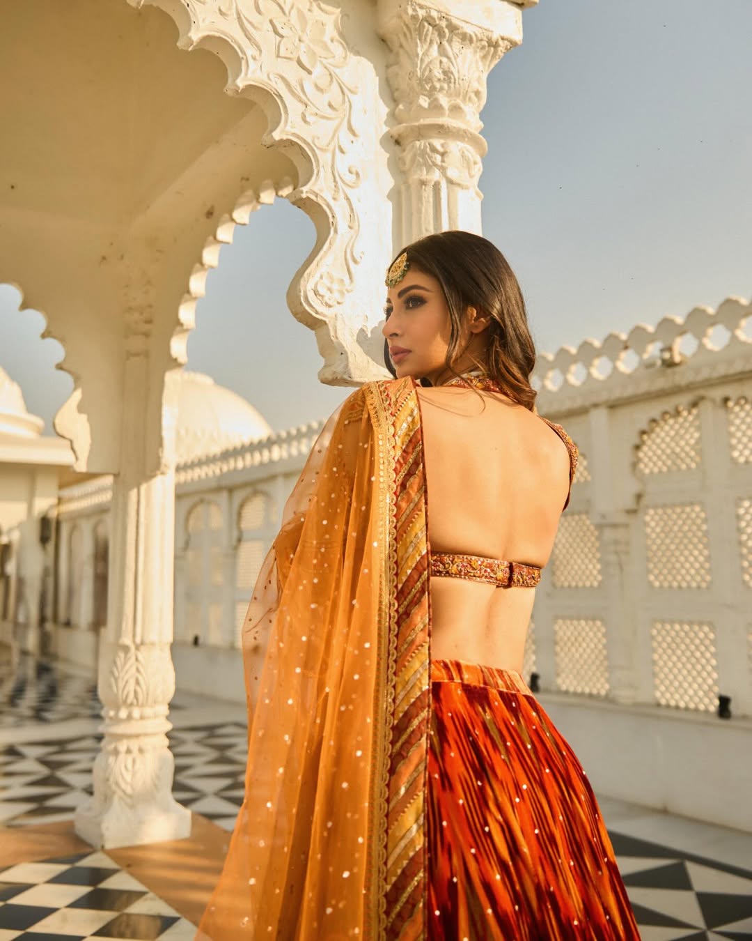 Indian actress Mouni Roy recently dazzled in a stunning photoshoot wearing a traditional orange lehenga, perfectly balancing regal elegance with festive charm. The outfit featured vibrant mustard and burnt orange tones, a delicate net dupatta, and intricate embroidery that showcased the artistry of Indian ethnic wear.