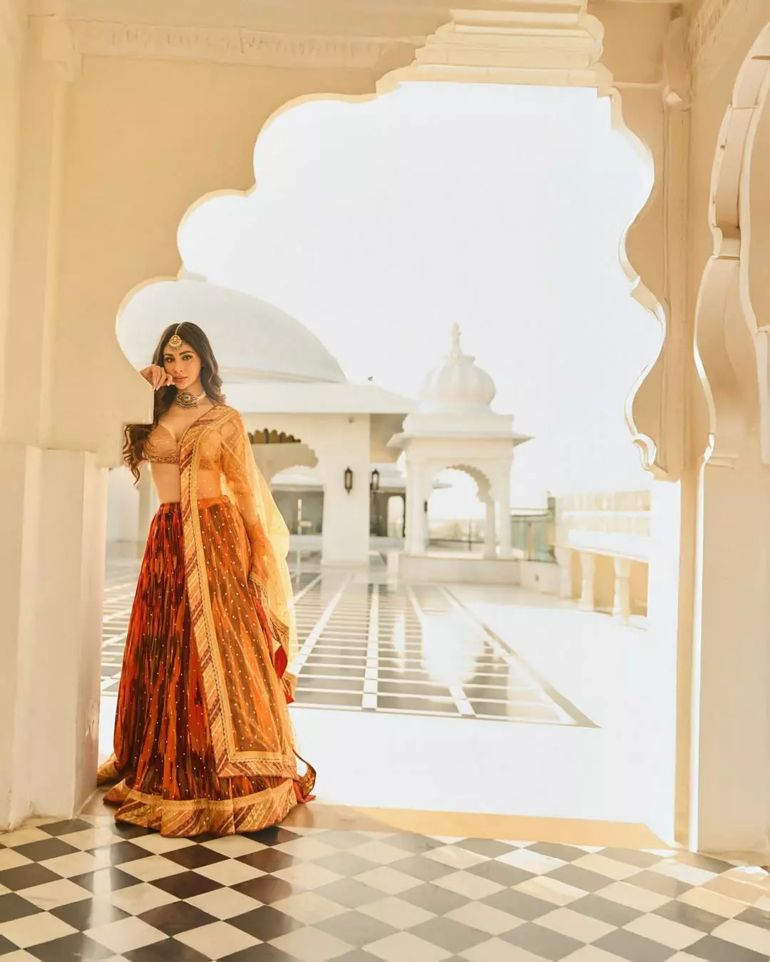 The shoot took place at The Laal Bagh in Jodhpur, a venue famed for its majestic architecture and palace-like ambiance. The warm hues of the lehenga beautifully complemented the historic interiors, creating visuals that exuded festive sophistication.