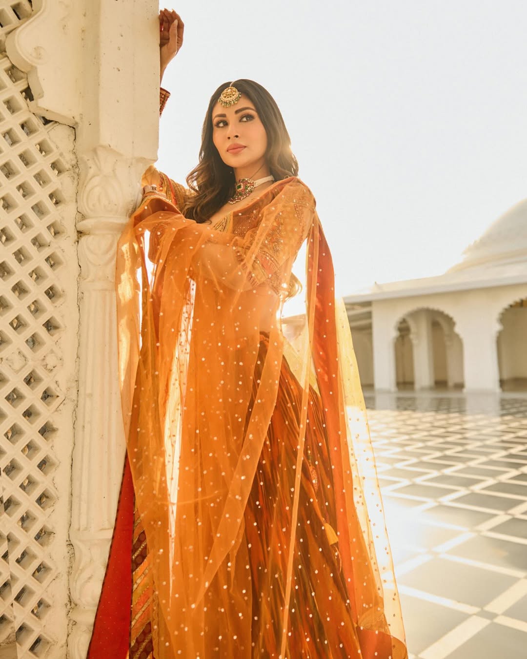 1 / 51Mouni Roy Radiates Festive Charm in Vibrant Orange Lehenga
