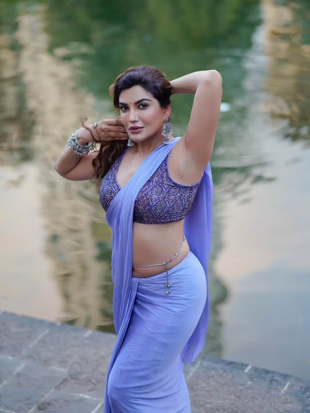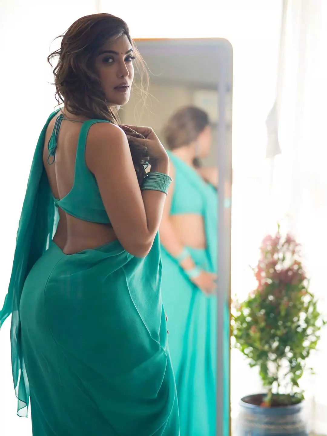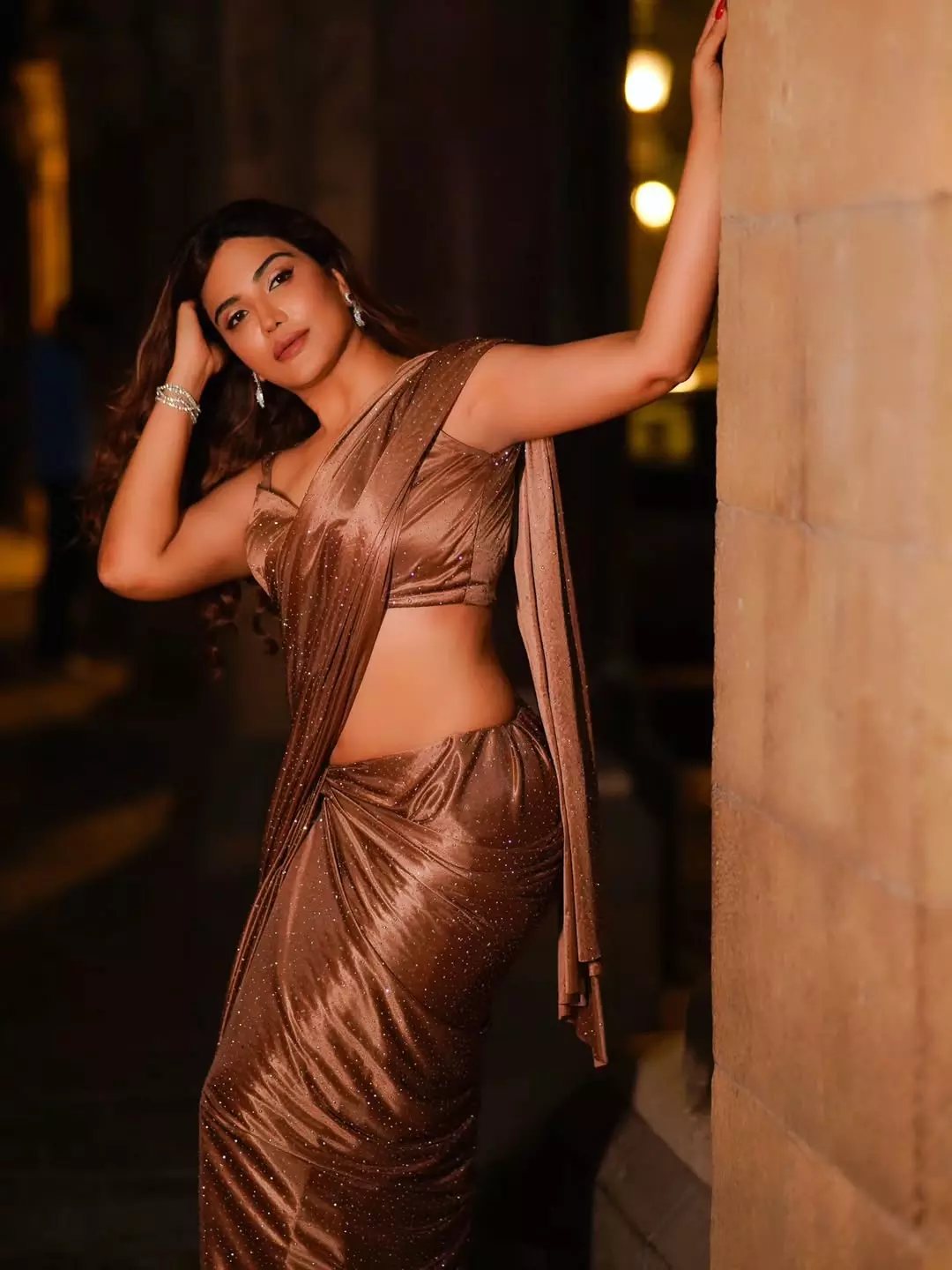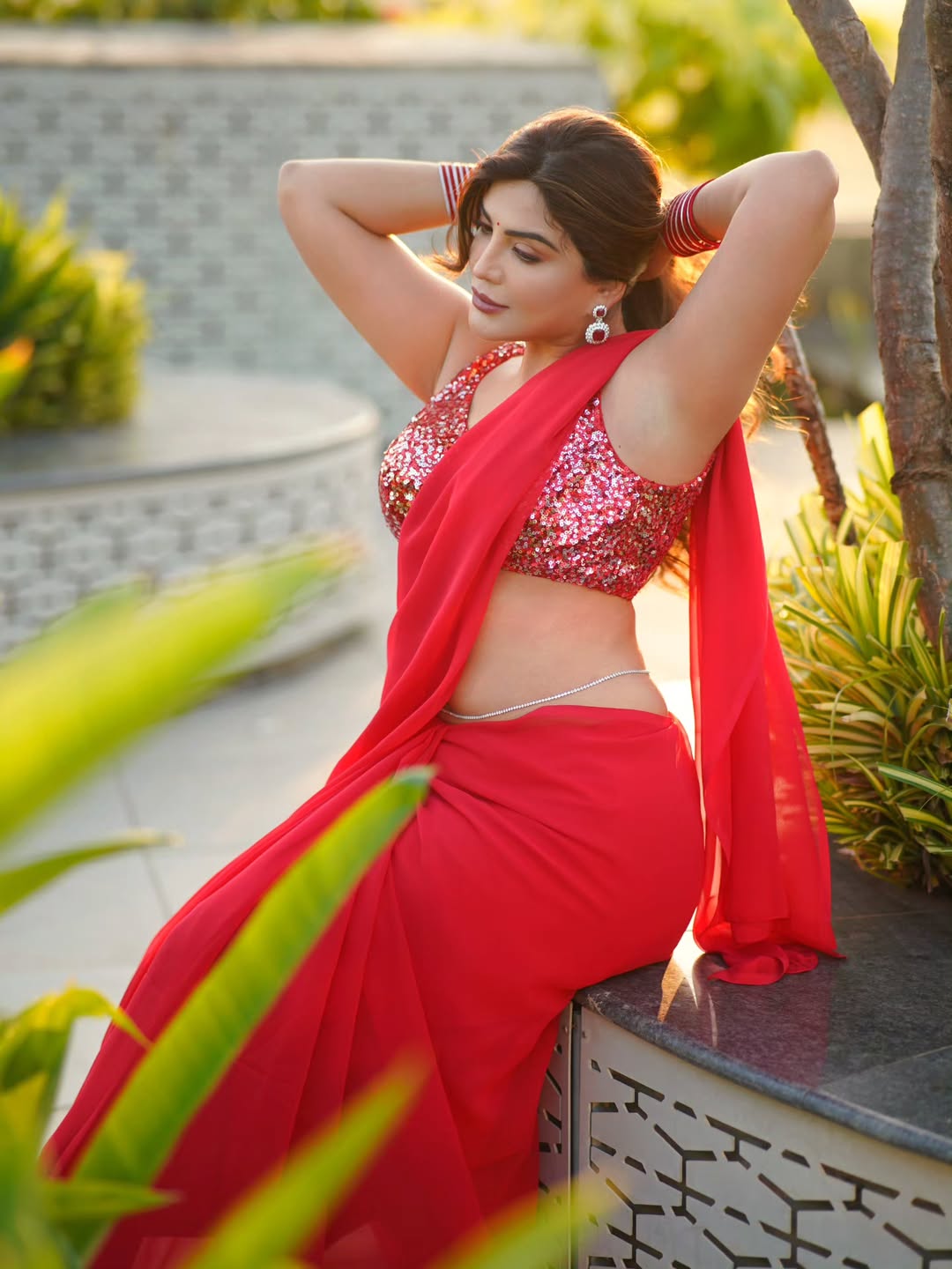This dazzling photograph of Mrinmai Kolwalkar captures her in a vibrant red sequined saree draped seductively over one shoulder, exuding confidence, glamour, and timeless Marathi charm. Leaning gracefully against a pillar with the soft golden sunlight highlighting her sculpted figure, the image radiates bold sensuality and effortless elegance.
