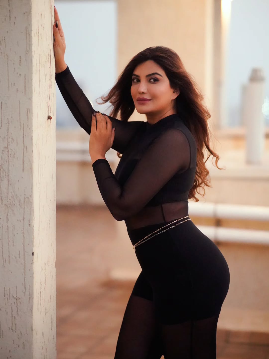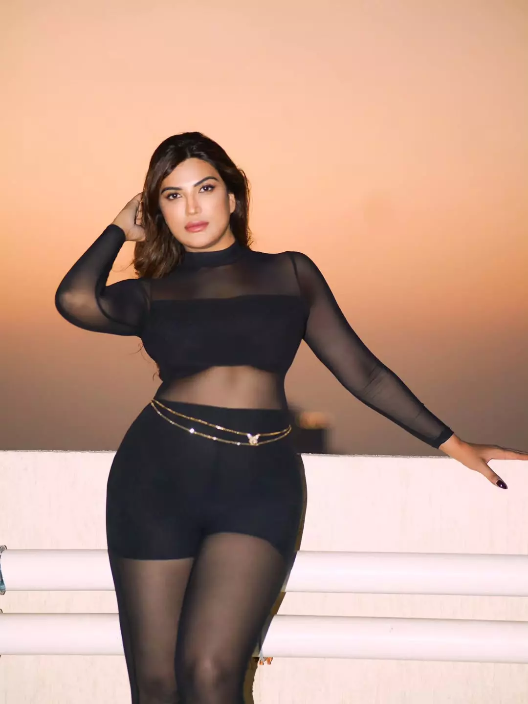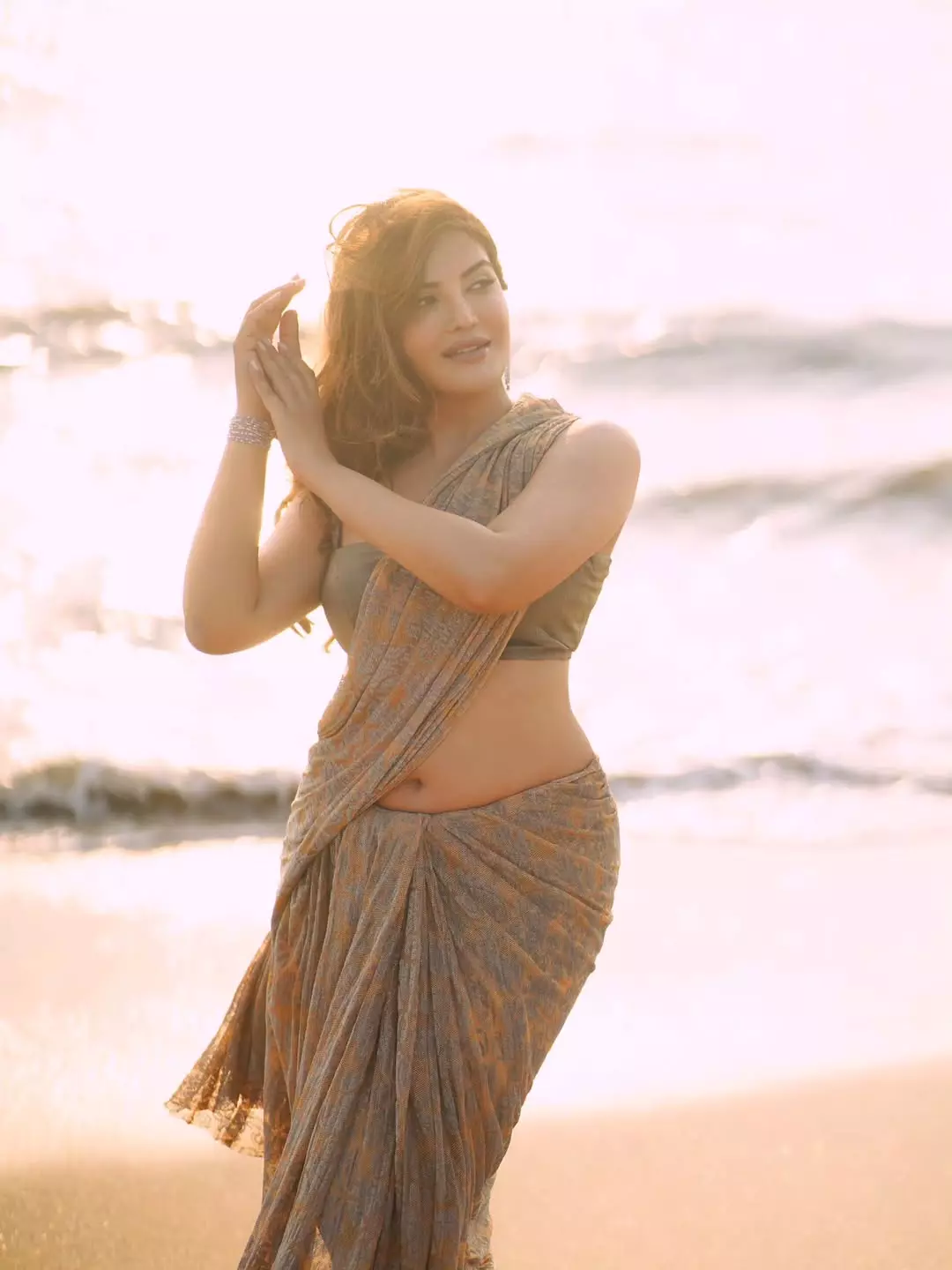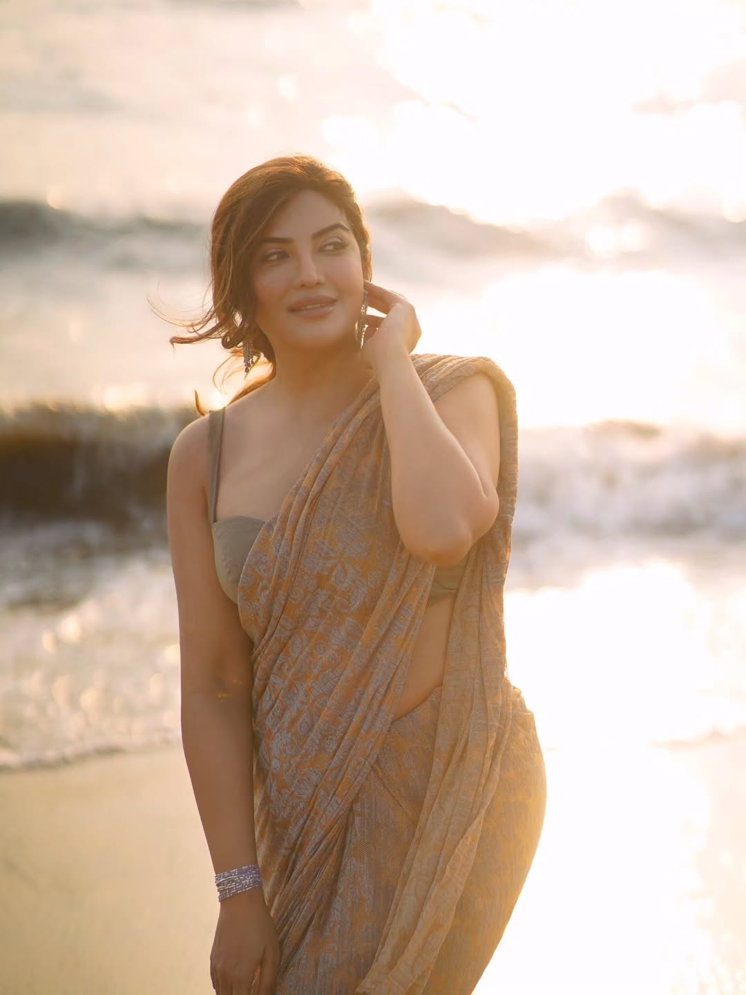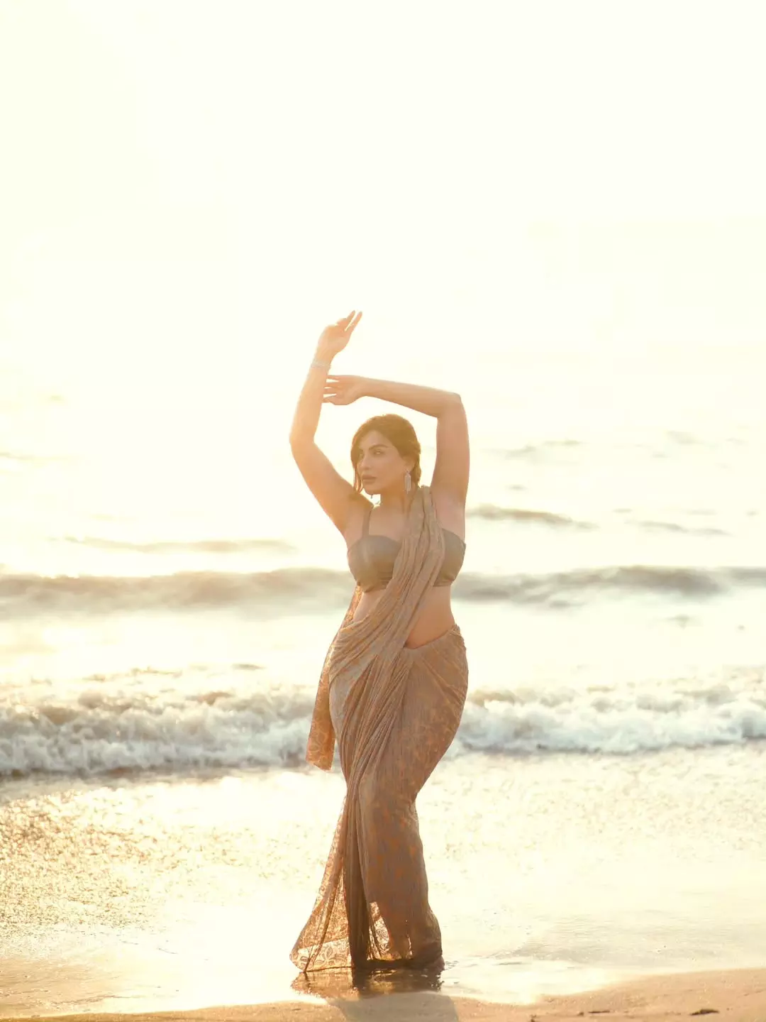 Mrinmai Kolwalkar captures her radiant elegance in a graceful saree, with golden sunlight accentuating her confident pose and warm smile against a serene beach backdrop. This image perfectly showcases her poise as a model and actress, blending traditional Indian beauty with modern charm.