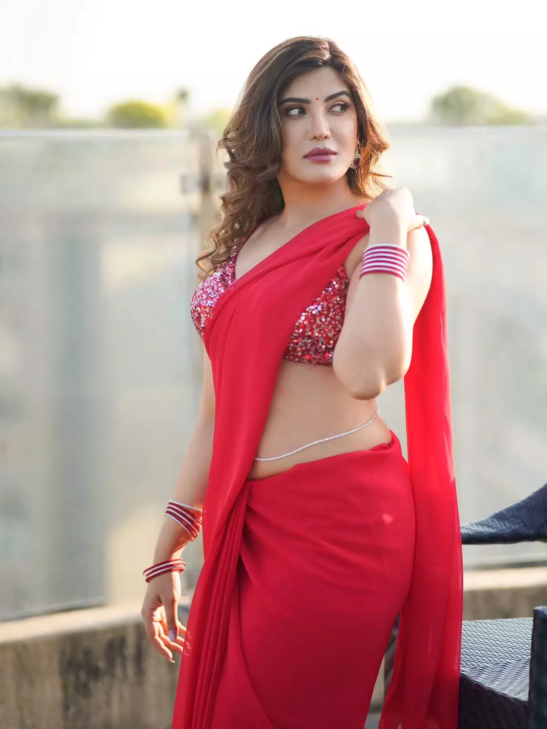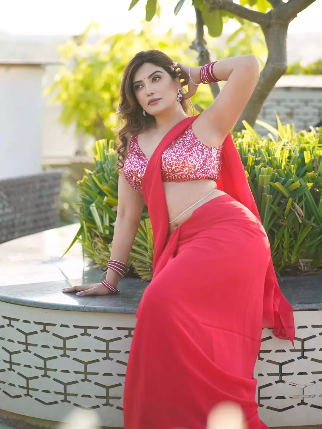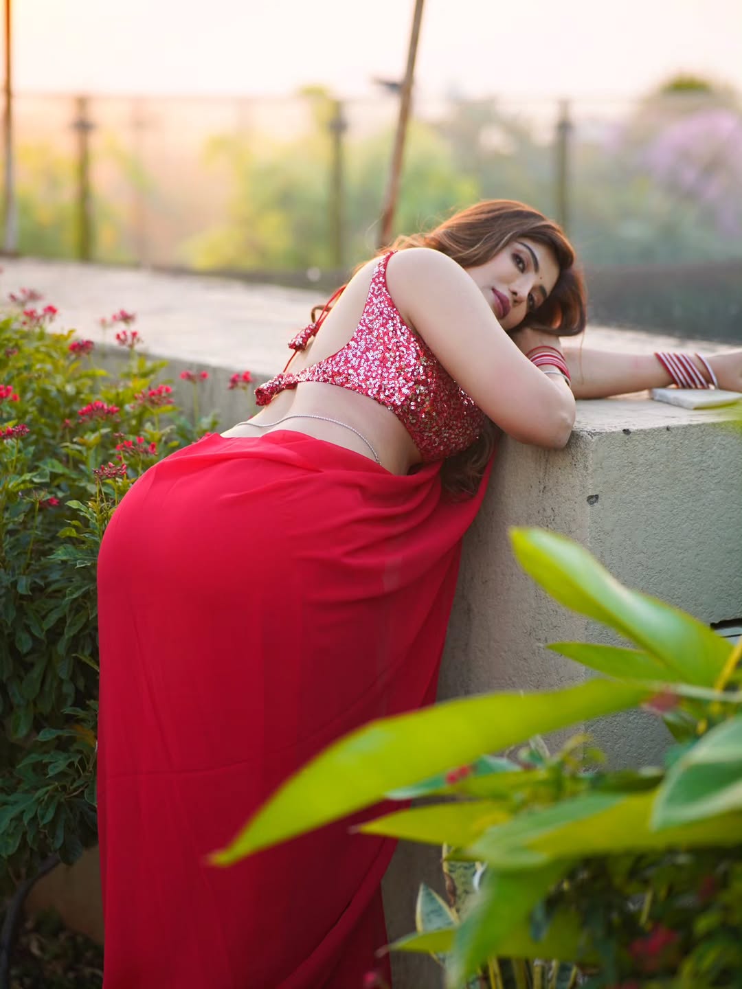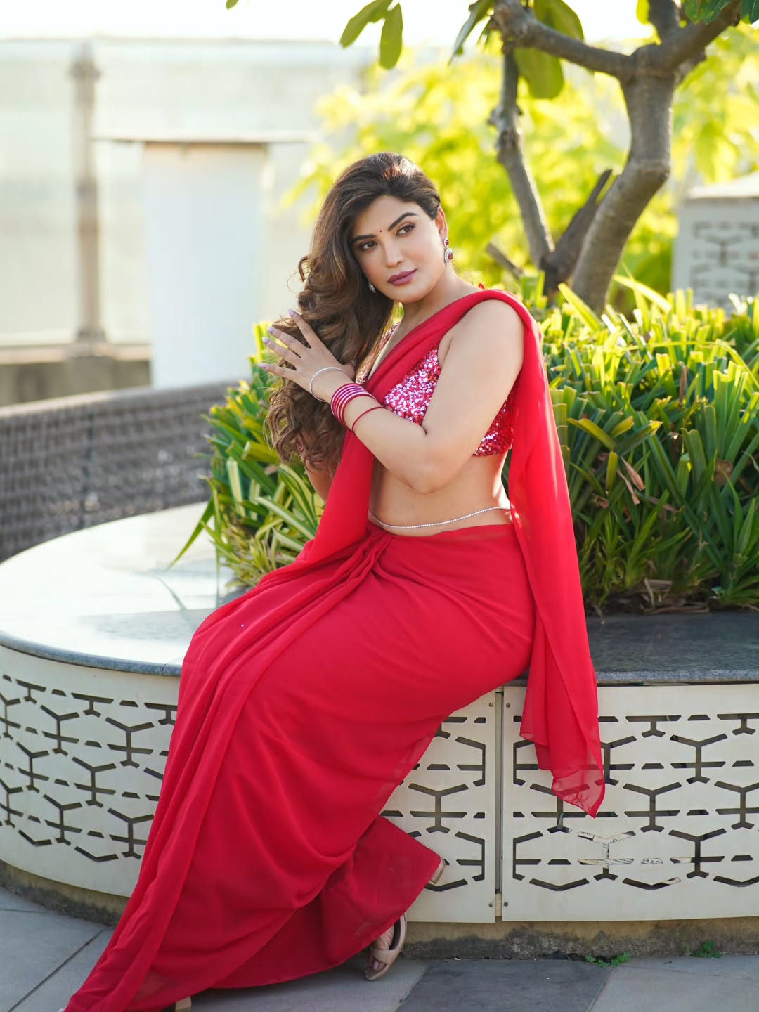 This image perfectly showcases her poise as a model and actress, blending traditional Indian beauty with modern charm.