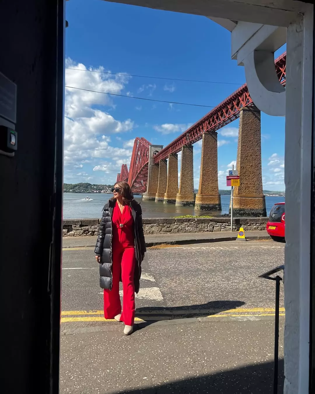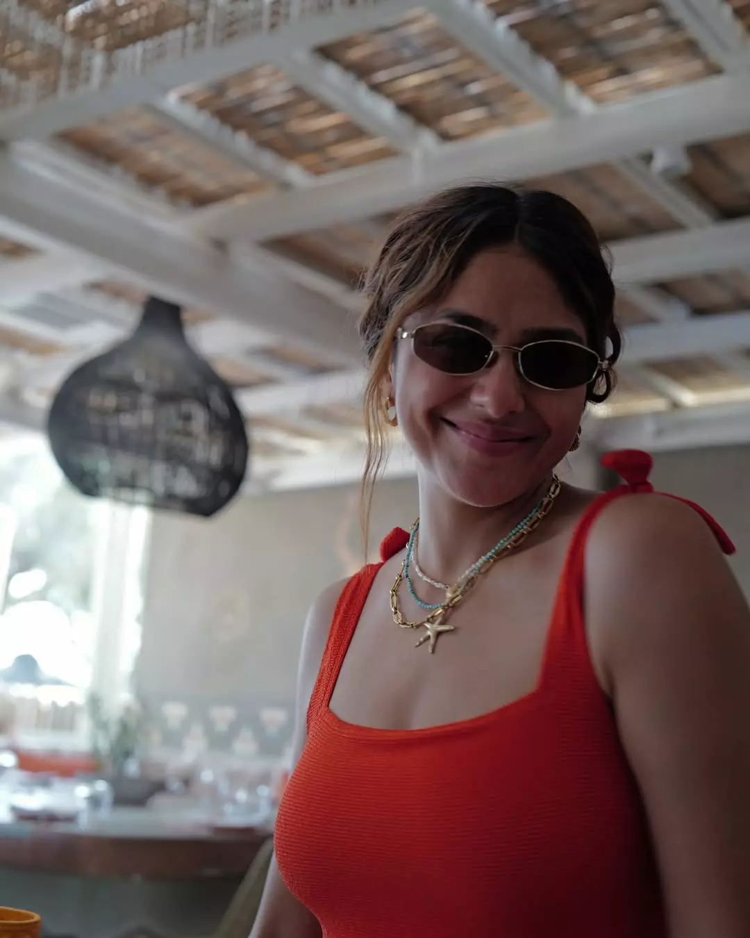 Mrunal Thakur shared a new photo on Instagram. She is seen in a bright red dress with a black coat. She stands near the iconic bridge with a smile on her face. The background shows blue skies and calm waters. Her caption read, “What’s not to love🥺.”