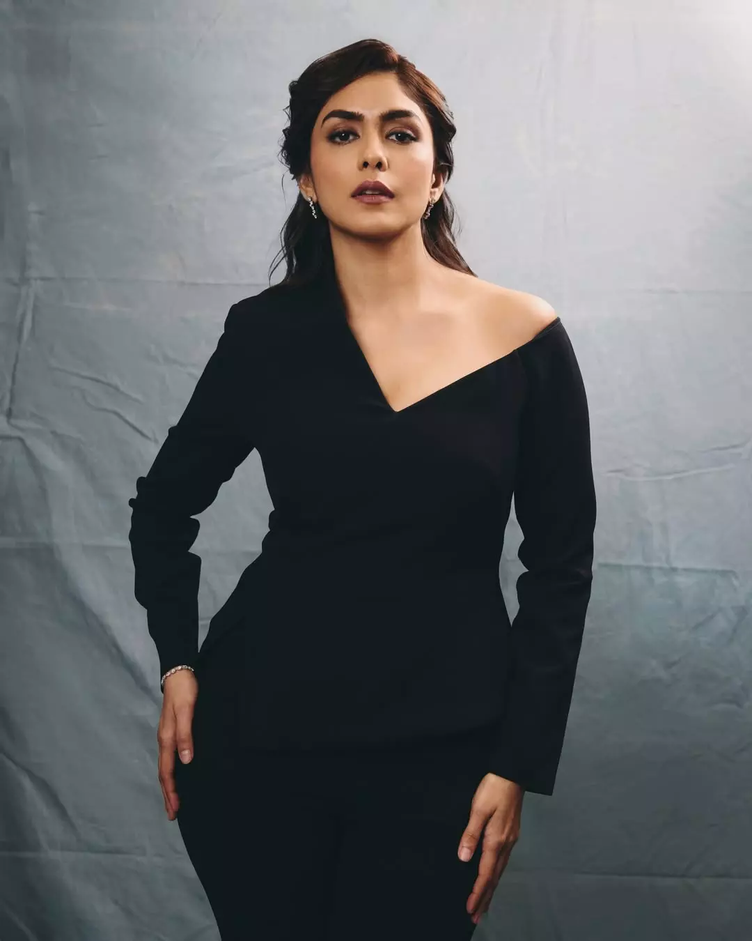 This stunning photograph of Mrunal Thakur captures her in a sleek black off-shoulder outfit, exuding elegance and quiet confidence.