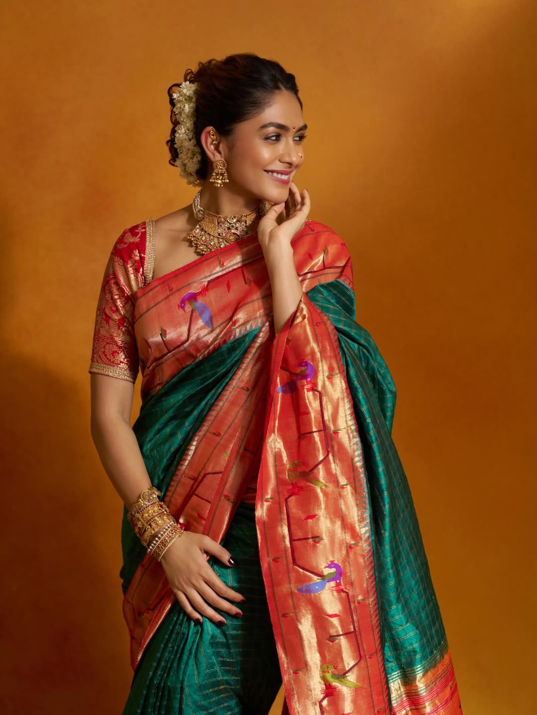 Actress Mrunal Thakur latest pics are just awesome Mrunal is seen wearing a rich silk saree in deep green and bright red shades, paired with classic gold jewellery.
