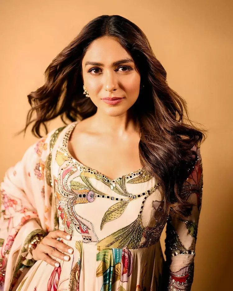In her recent Instagram post, Mrunal shared radiant pictures that captivated her fans. She wore a white churidar adorned with lively embroidery and mirror work, elegantly pairing it with a printed dupatta and a gracefully flared dress. The caption "Filmy Nahi Phool My Mood" added a touch of playfulness to her stunning look.