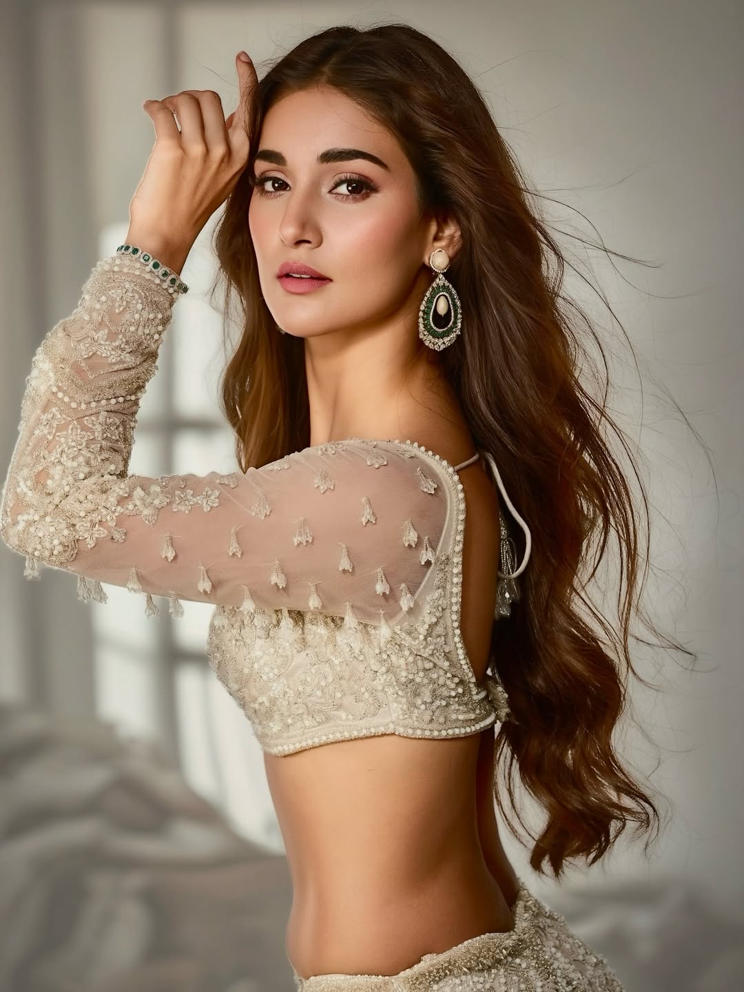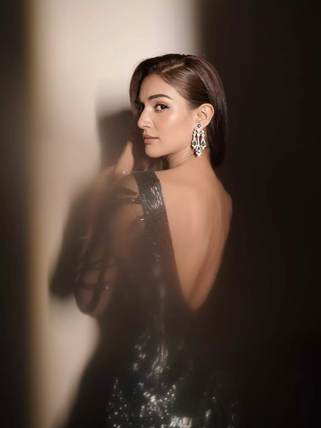 Draped in a stunning black sequined gown with sheer lace detailing, deep plunge neckline, and intricate arm accents, Mukti exudes sophistication and poise against a luxurious backdrop— a perfect fusion of glamour and grace.