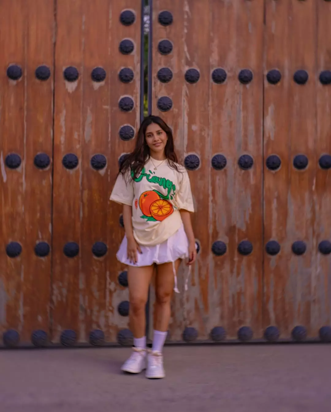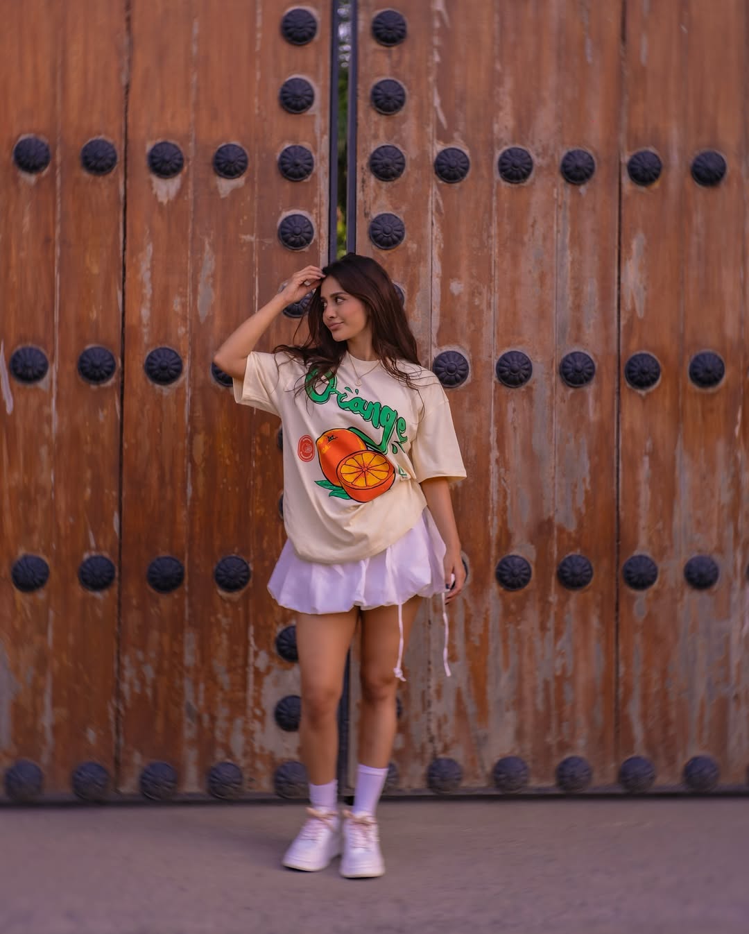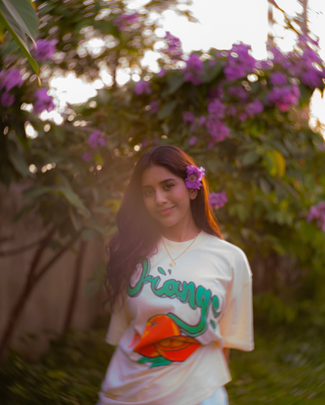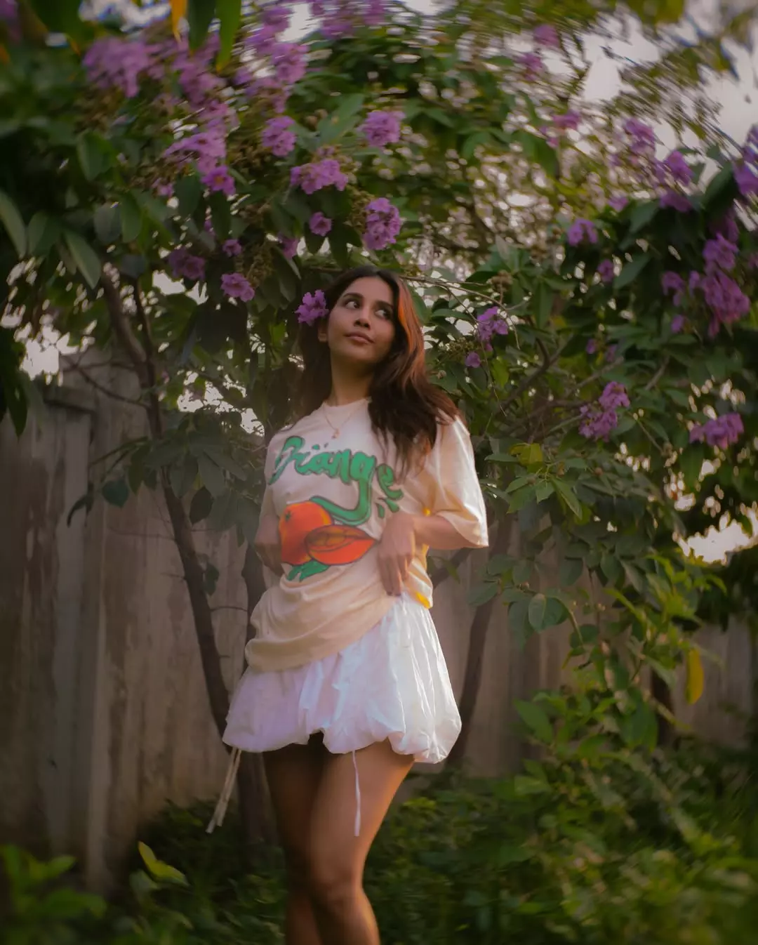 By: Tupaki Desk | 15 July 2025 10:45 PM ISTNabha Natesh recently shared a fresh and breezy picture on Instagram that perfectly reflects her calm vibe. Posing under a flowering tree in a relaxed setting, she wore a playful t-shirt with “Orange” print paired with a flowy mini skirt. With soft light falling through the leaves and purple flowers framing the background, the moment felt dreamy and natural. Her caption read, “Just out here soft-launching your dream girl energy 🐥”