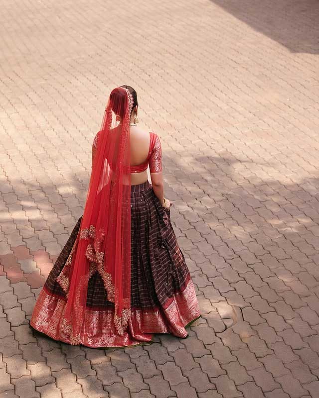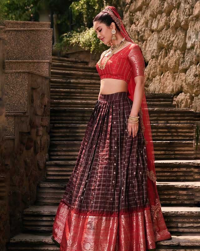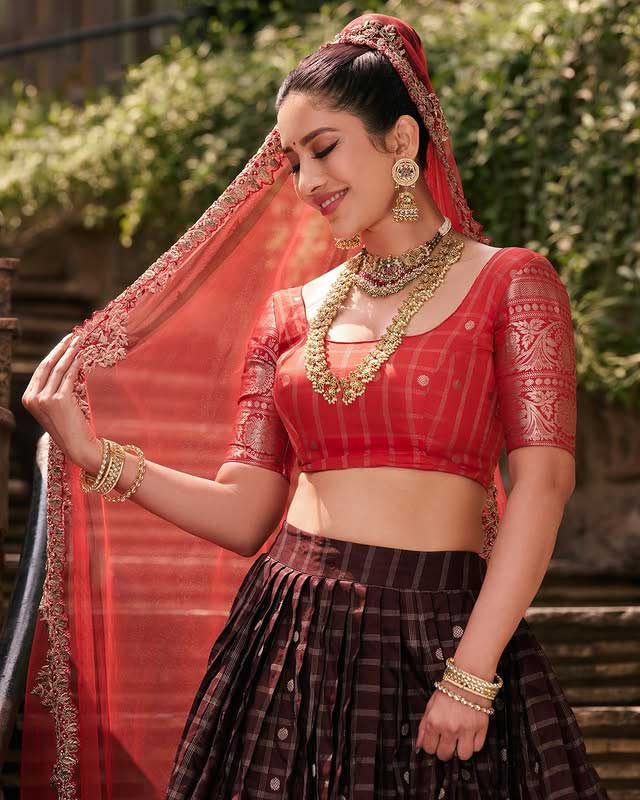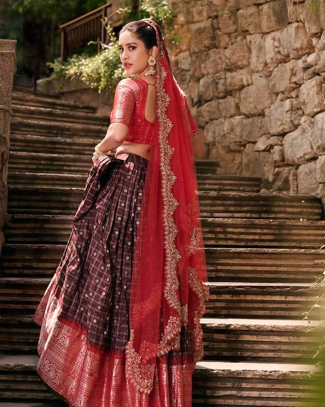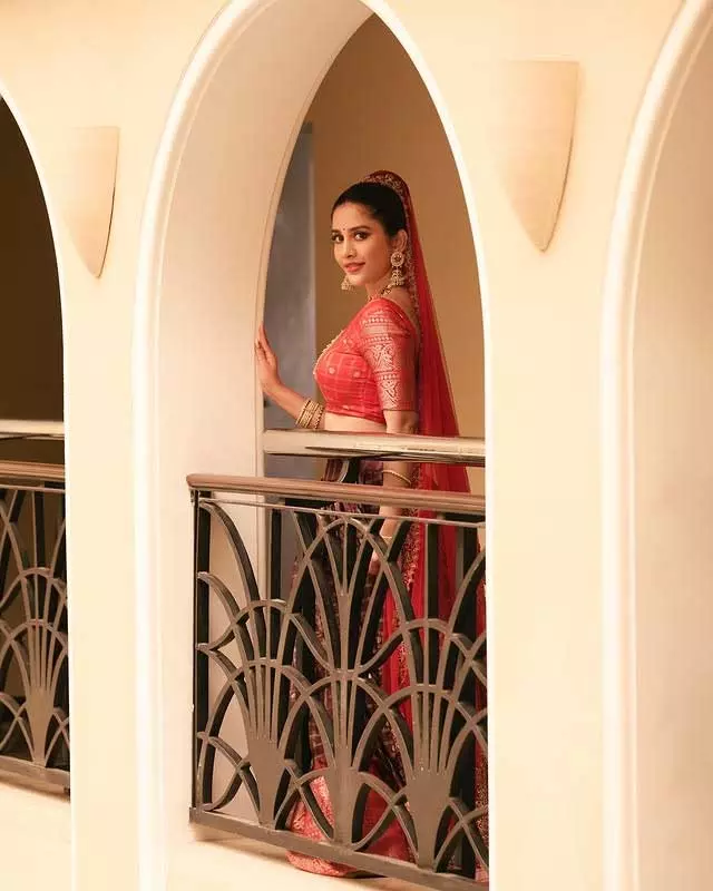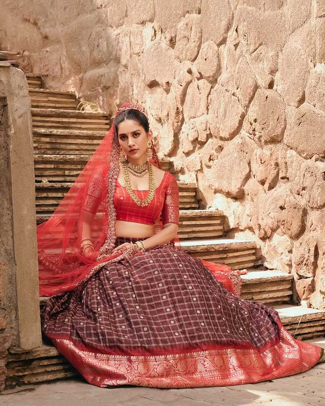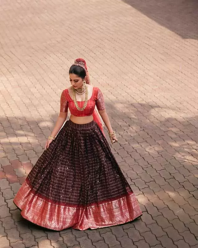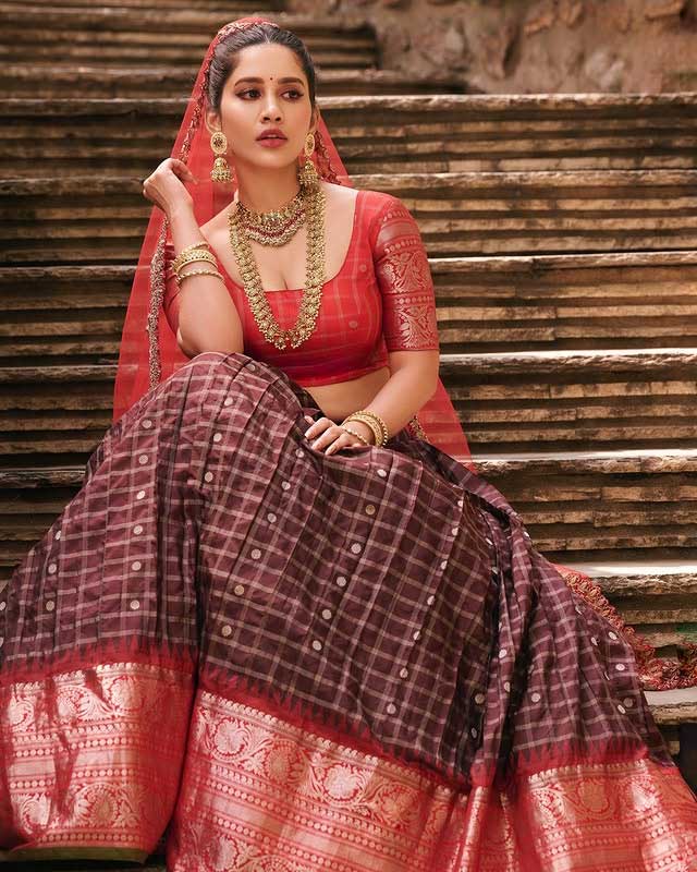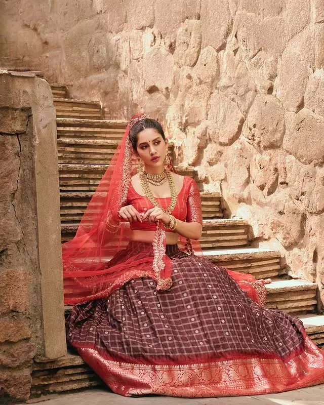 By: Tupaki Desk | 2 May 2025 10:17 AM ISTIn her latest Instagram post, actress Nabha Natesh stuns her fans with a royal and traditional look. Dressed in a rich red and maroon lehenga with gold jewelry, she channels a modern-day Radha sitting gracefully on rustic stone steps. Her caption reads: “Radha in the concrete jungle—finding grace in the chaos and rhythm in the rush.” It's poetic, elegant, and very Nabha—blending classical beauty with urban life.