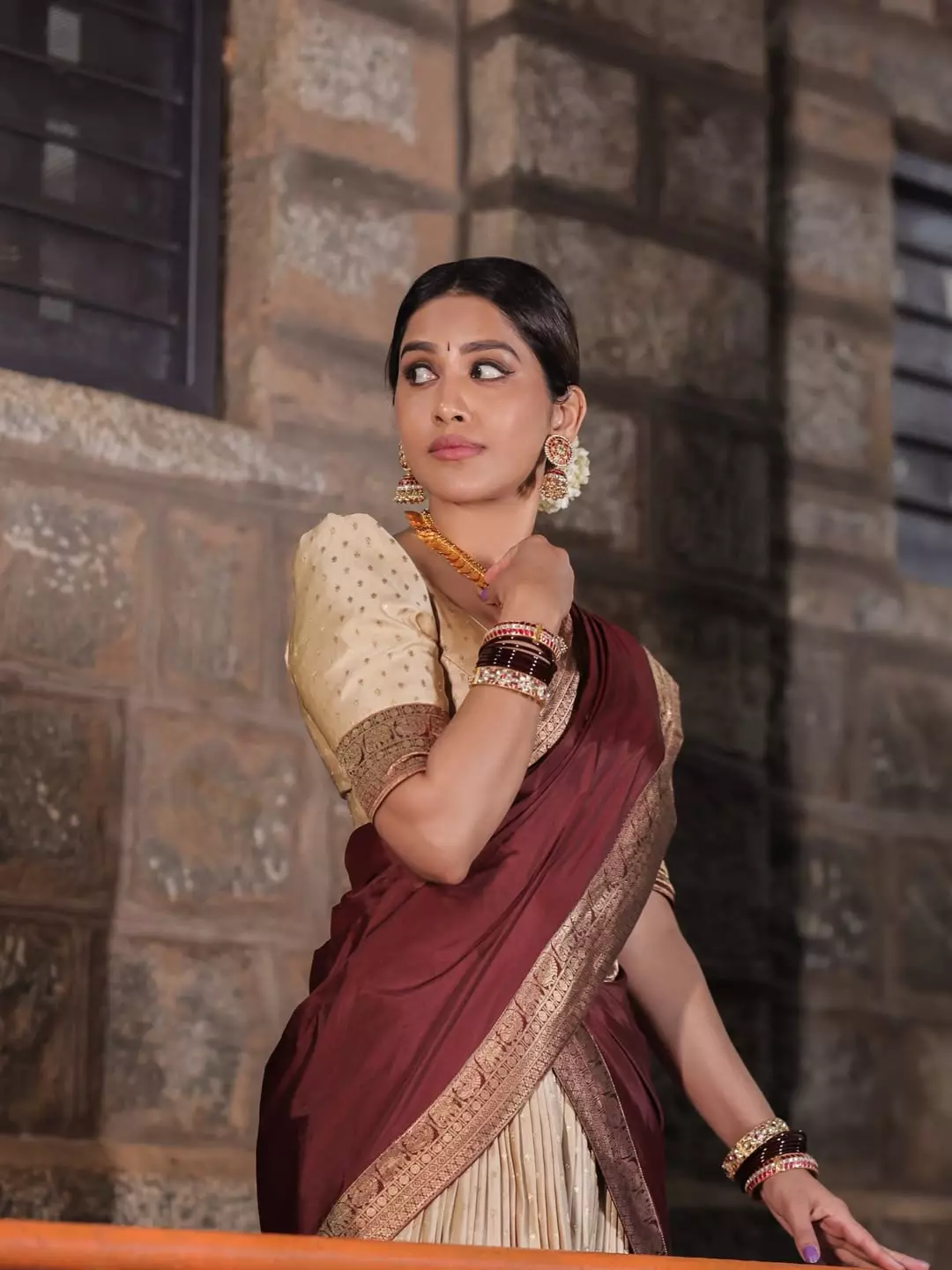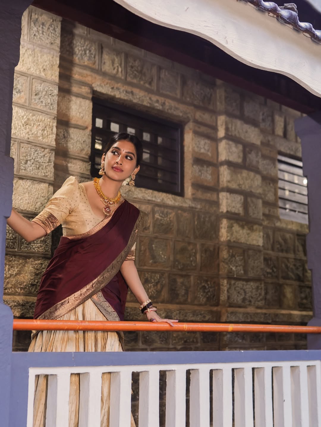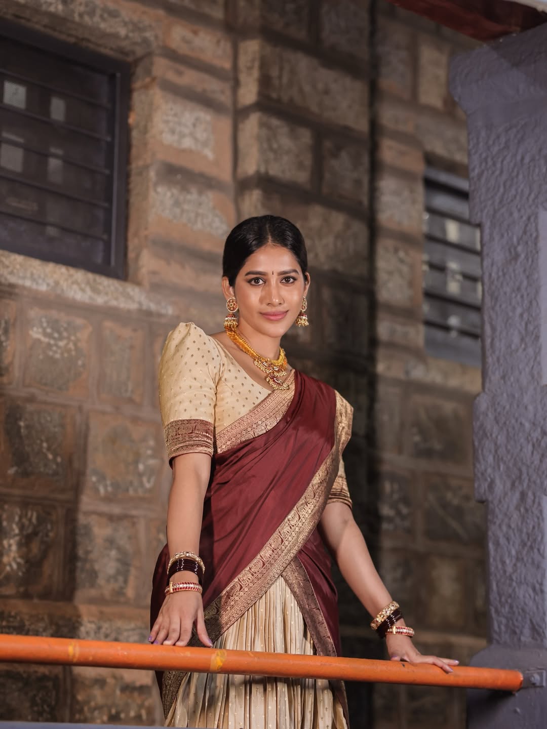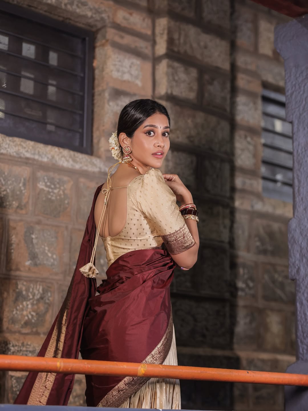 By: Priya Chowdhary Nuthalapti | 5 Sept 2025 1:17 PM ISTNabha Natesh shared a festive post on her Instagram. Her caption read, “Wishing everyone a happy Onam 🌿.” She looked radiant in a custom-made half saree from @maramsclothing-_official. Her jewellery was from @lotus-_silver-_jewellery. The rich maroon and gold combination gave her a traditional charm. The detailed blouse and the elegant pleats of the saree made her appearance graceful.