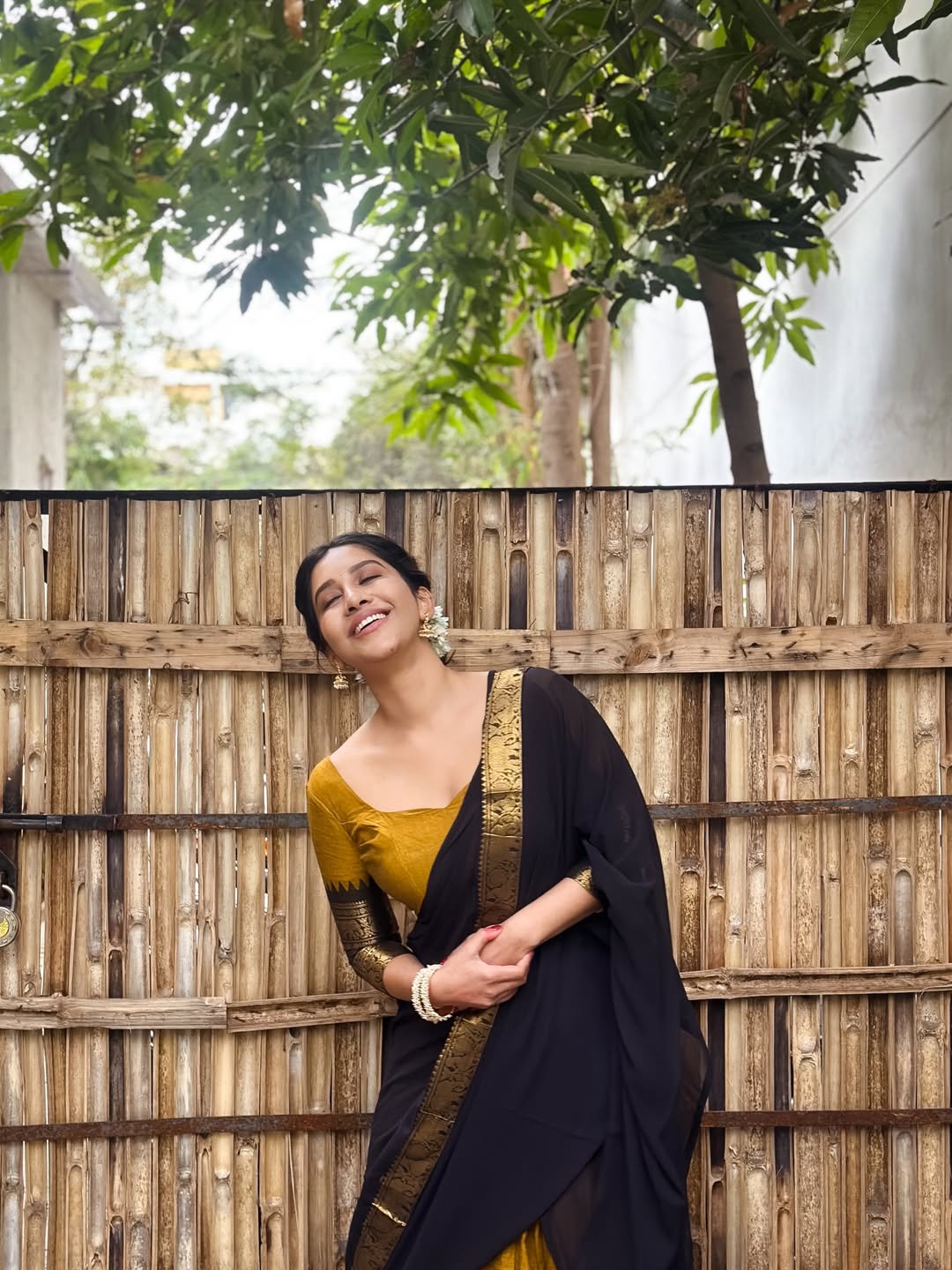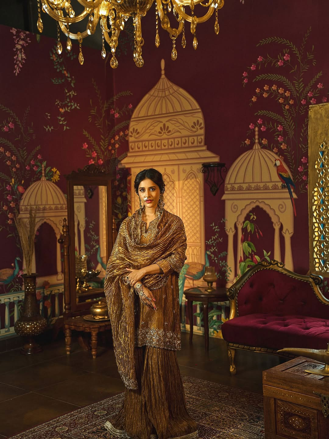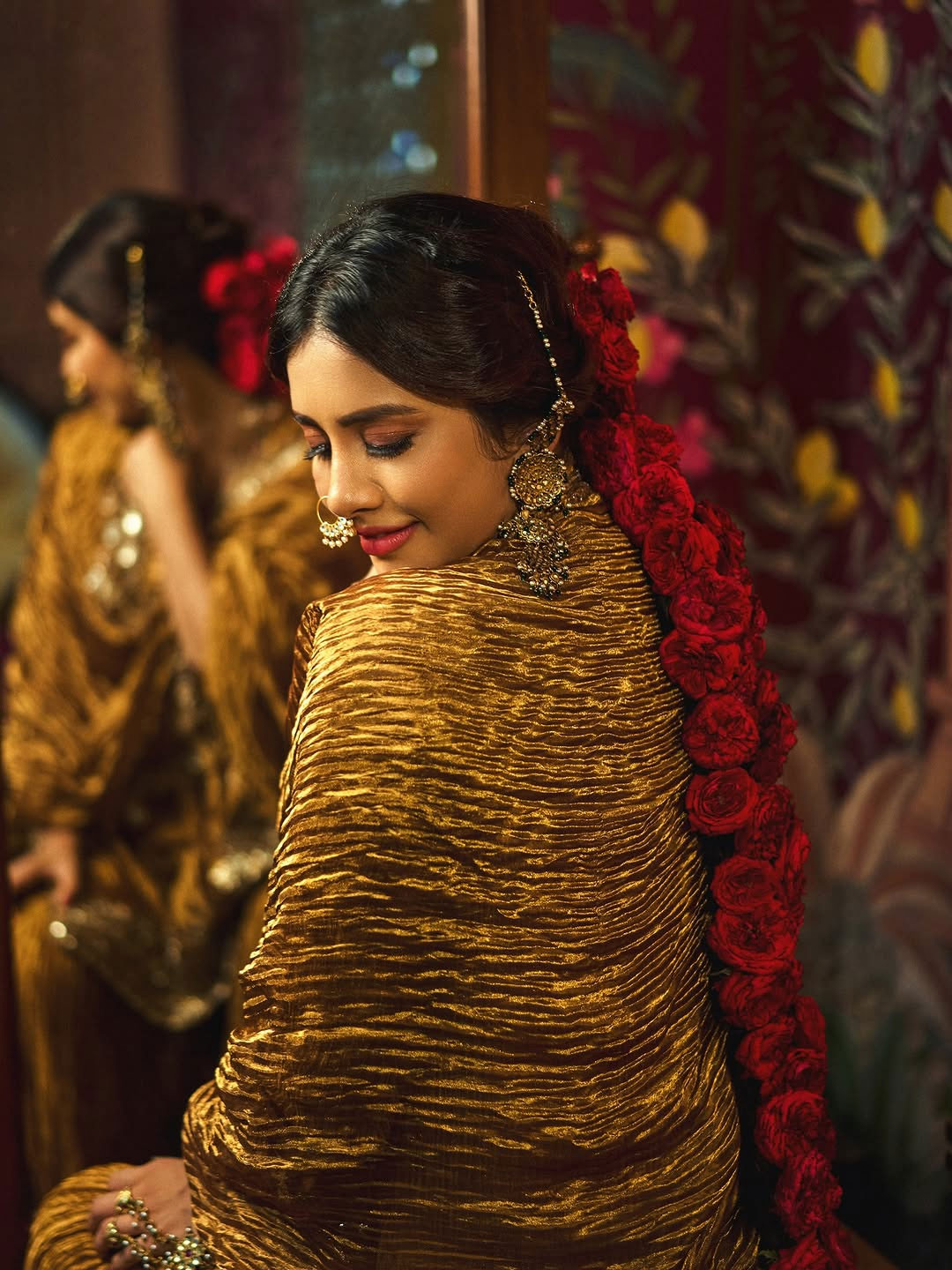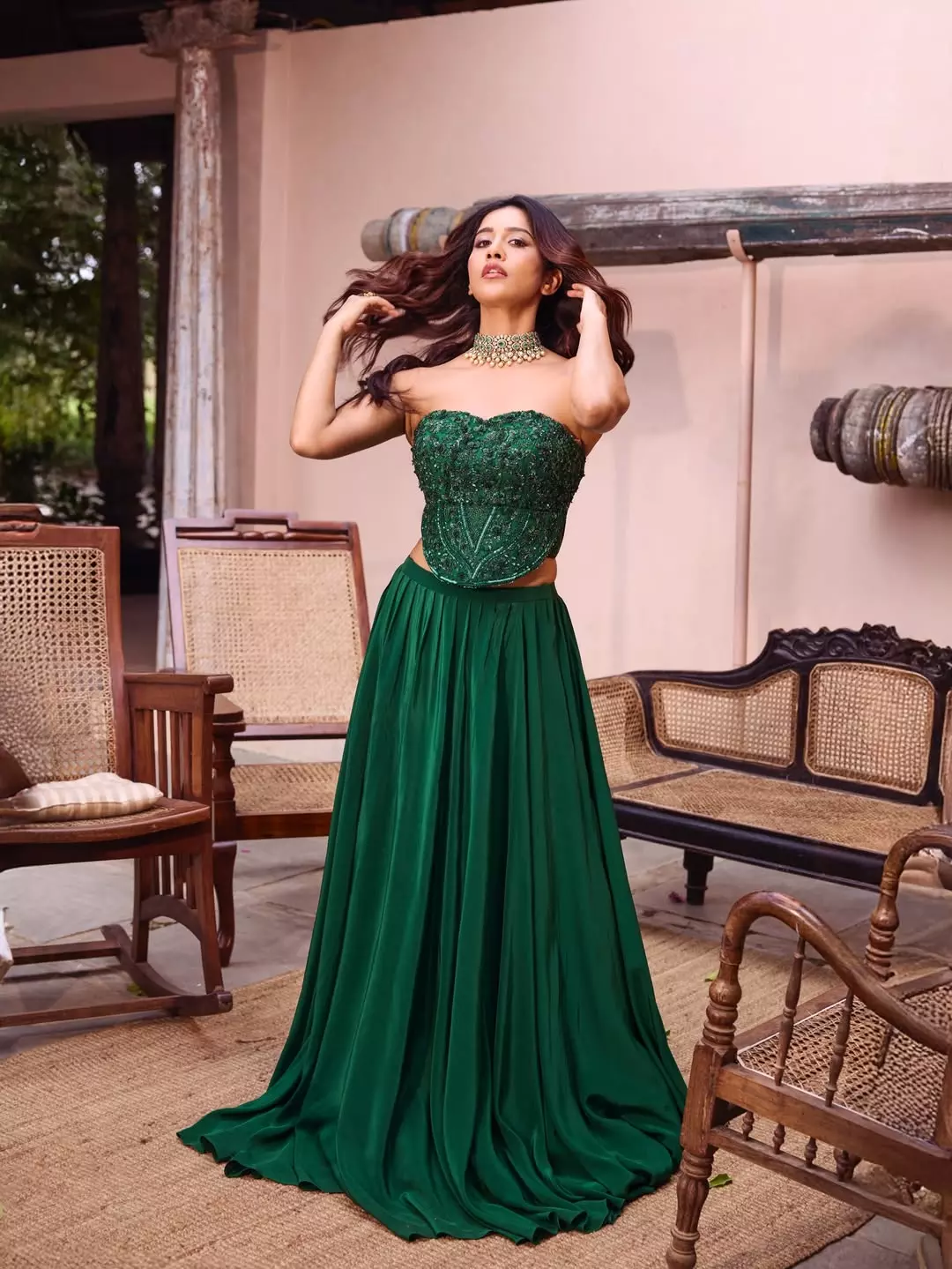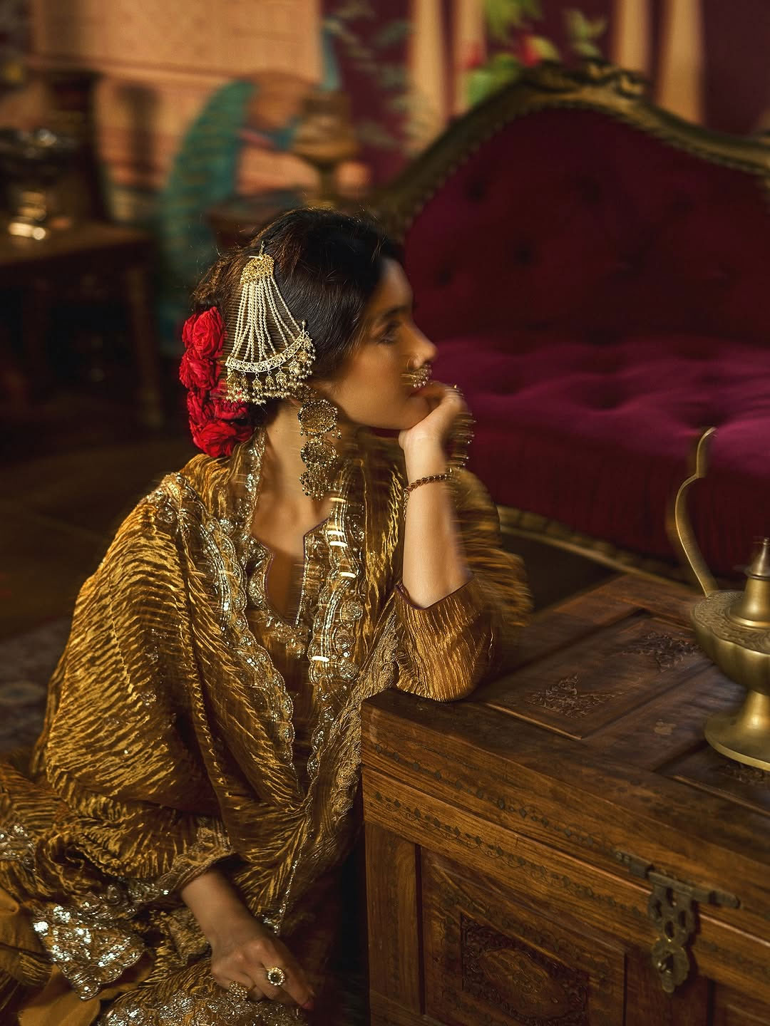 The blouse’s exquisite beadwork and embroidery highlight the luxurious fabric, while the deep red skirt with gold accents enhances the regal charm of the ensemble. Nabha complements the look with bold statement earrings and subtle bangles, striking a perfect balance between grandeur and refinement.