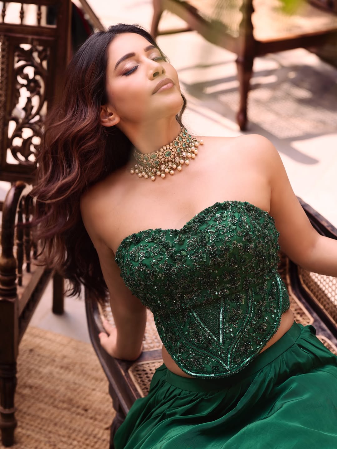 Nabha Natesh mesmerizes once again in a recent photoshoot that elegantly fuses traditional Indian aesthetics with contemporary style. She stuns in a strapless lehenga blouse featuring intricate embroidery, paired with a vibrant red skirt adorned with delicate gold motifs, beautifully celebrating Indian craftsmanship while infusing a modern sensibility.
