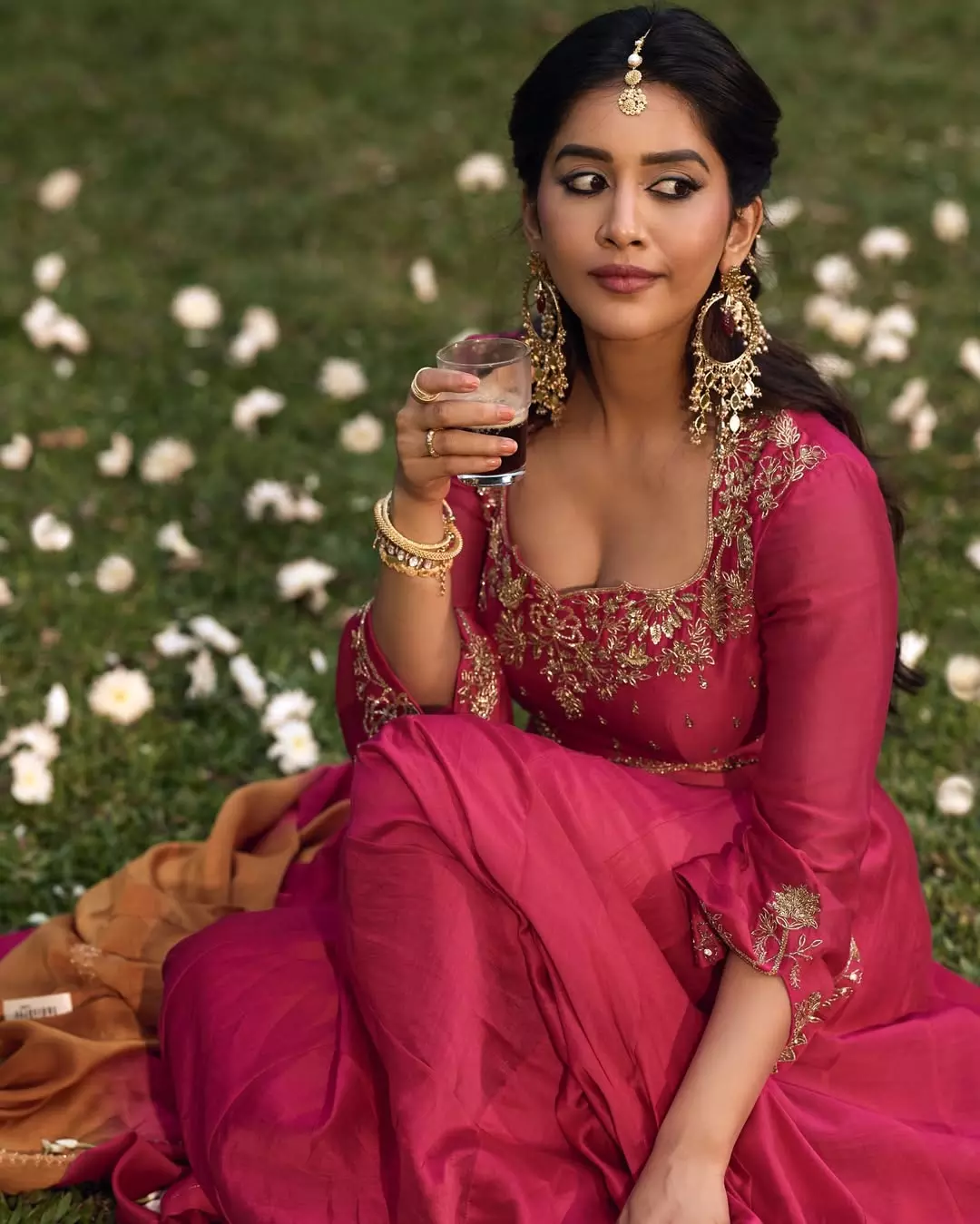 Nabha Natesh looks breathtakingly ethereal in this enchanting outdoor portrait, seated gracefully on lush green grass surrounded by scattered white flowers. Draped in a vibrant magenta anarkali with intricate gold embroidery, complemented by elaborate traditional jewelry and a maang tikka, she exudes royal elegance and serene beauty. "Bringing some aesthetics from my backyard to your feed