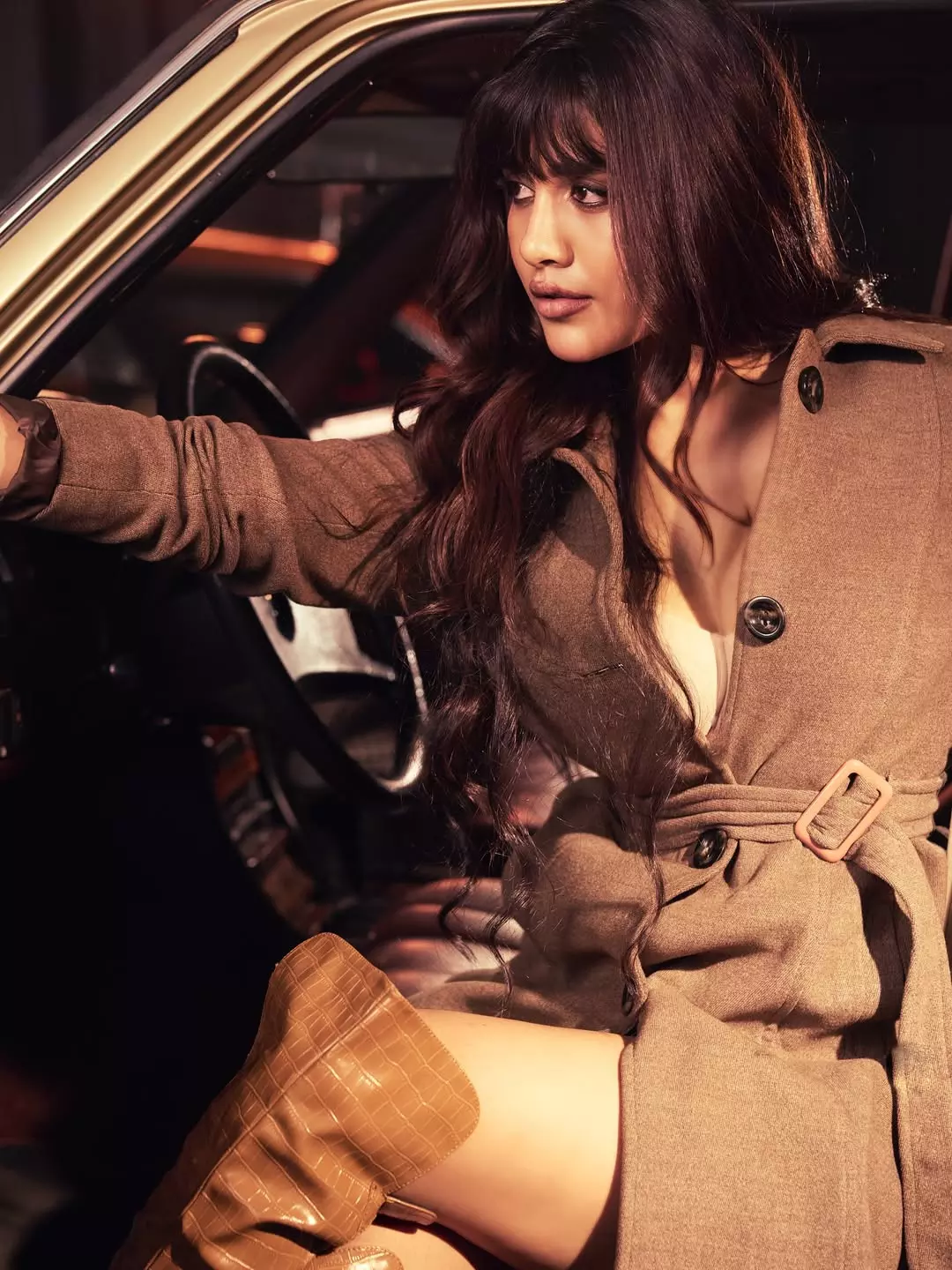 In the shared picture, Nabha Natesh is seen sitting inside a car, striking a calm yet powerful pose. She is dressed in a winter-style coat that gives a vintage feel, matching perfectly with the caption she wrote: “Winter, the vintage way.” The styling of this look was done by Aishwarya Stylist, while the photography was handled by Sandeep FP.