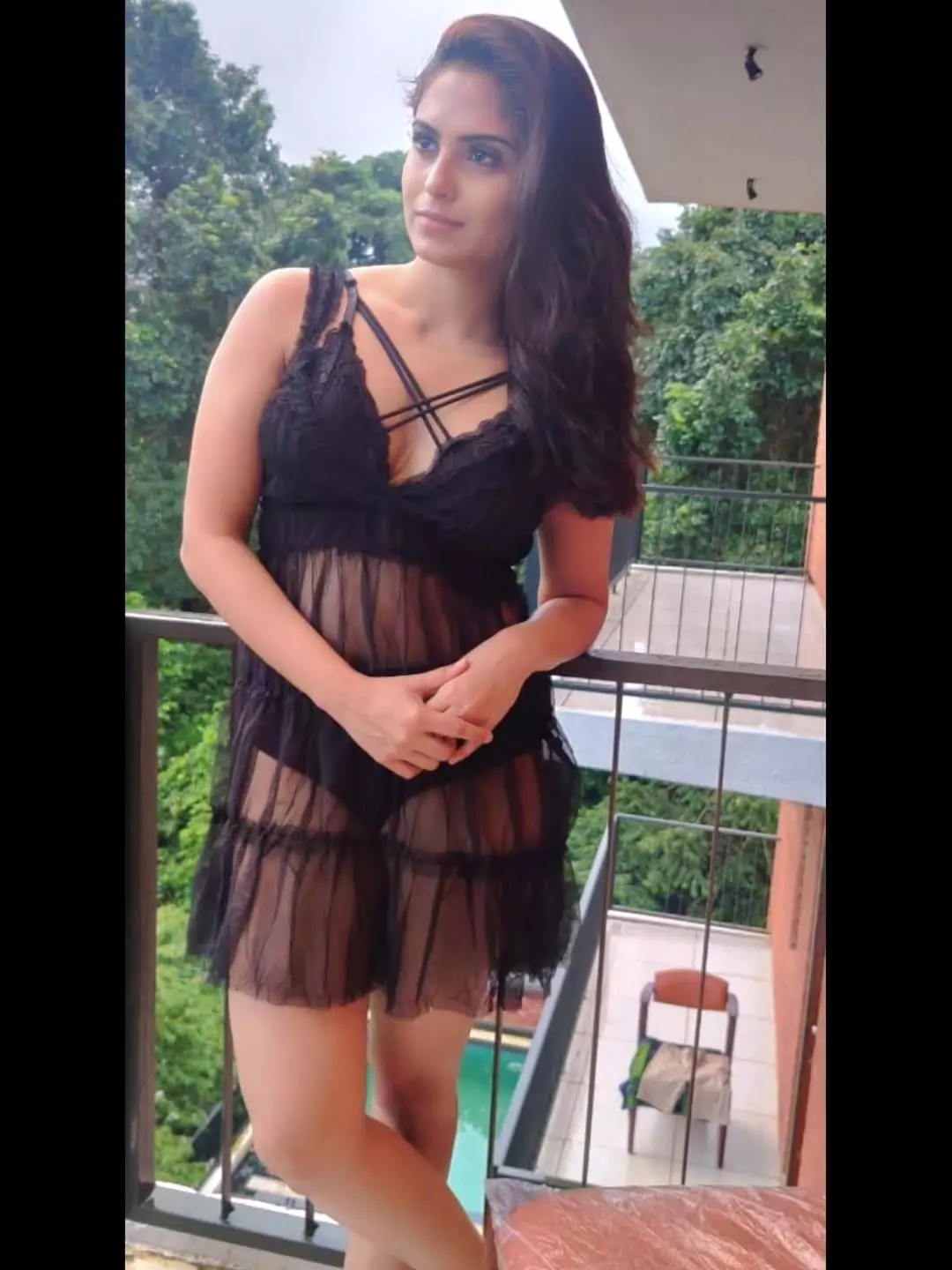 The striking photo of Naina Ganguly radiates confidence and allure as she stands on a sunlit balcony, surrounded by lush greenery and overlooking a serene pool. Dressed in a sheer black lace babydoll with crisscross straps, tiered ruffles, and translucent layers, her long wavy hair flows naturally while she clasps her hands with a poised, enigmatic gaze. Her caption perfectly sums it up: "Serving bold with a side of savage. " — embodying her fearless, glamorous persona that blends sensuality with unapologetic edge.