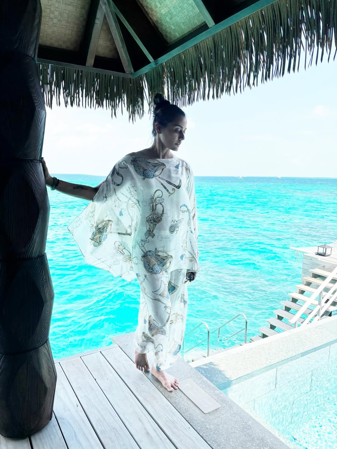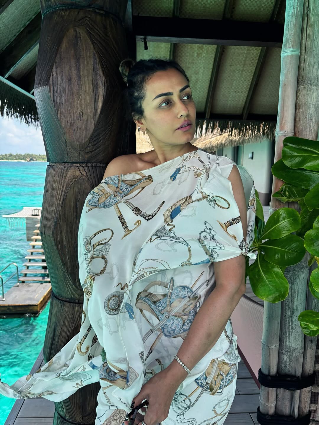 Actor and former Miss India Namrata Shirodkar continues to share special moments with her fans on Instagram. Her latest post has her enjoying a peaceful moment by the bright blue sea. In the photo, she is standing near the water. She is dressed in a soft white dress with a beautiful printed design. Namrata captioned the picture with the words “Magic light” along with a heart-hug emoji.