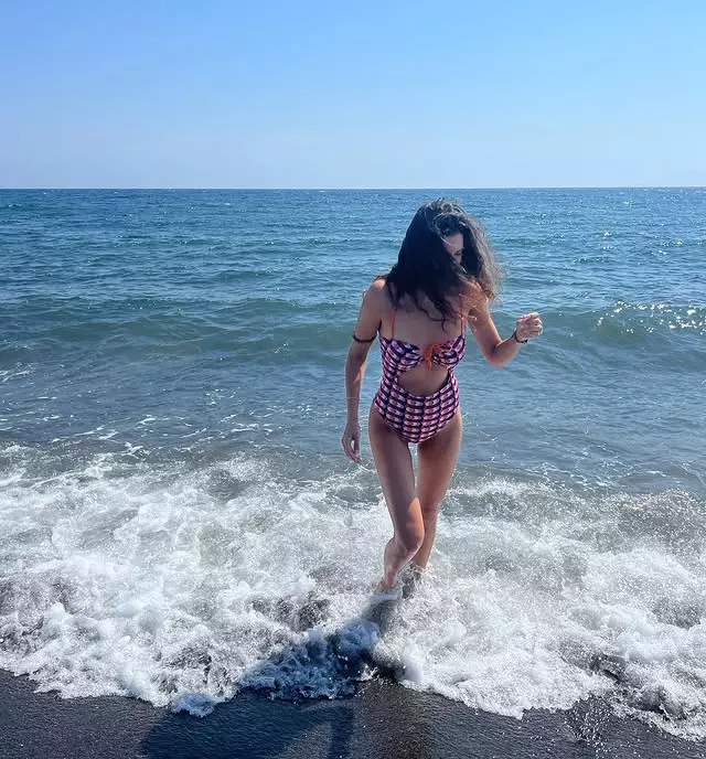 In this recent Instagram post, Natasa brings elegance with a black touch. She wears a black and gold strapless dress with a flowing back. The style blends modern charm with classic richness. Her hairstyle and gold jewelry are simply adorable.