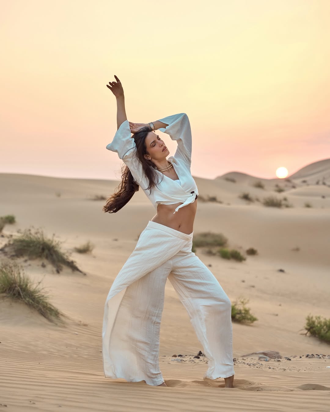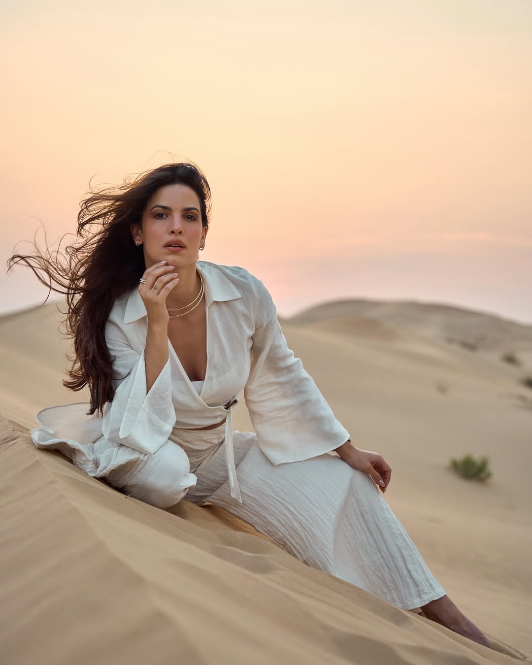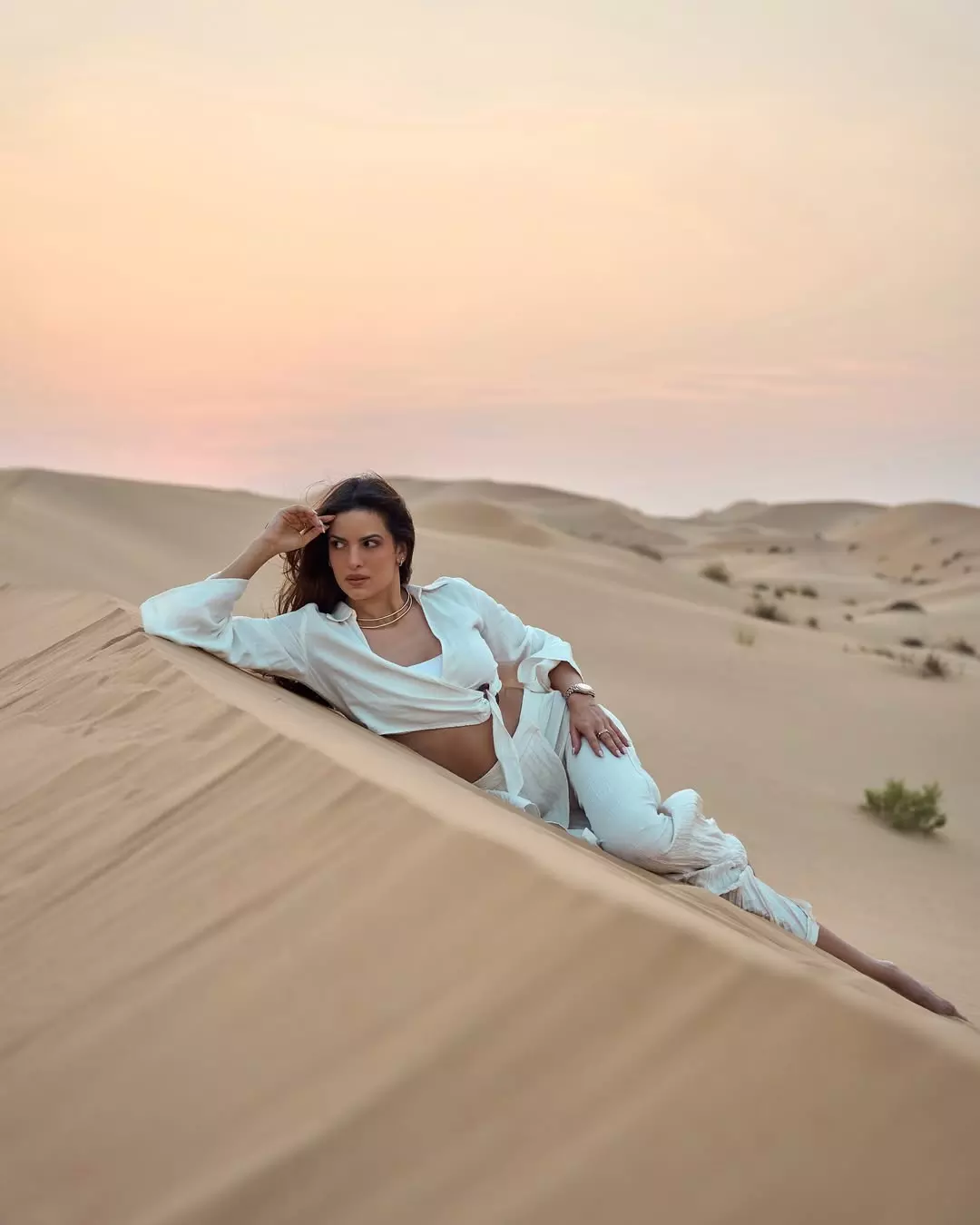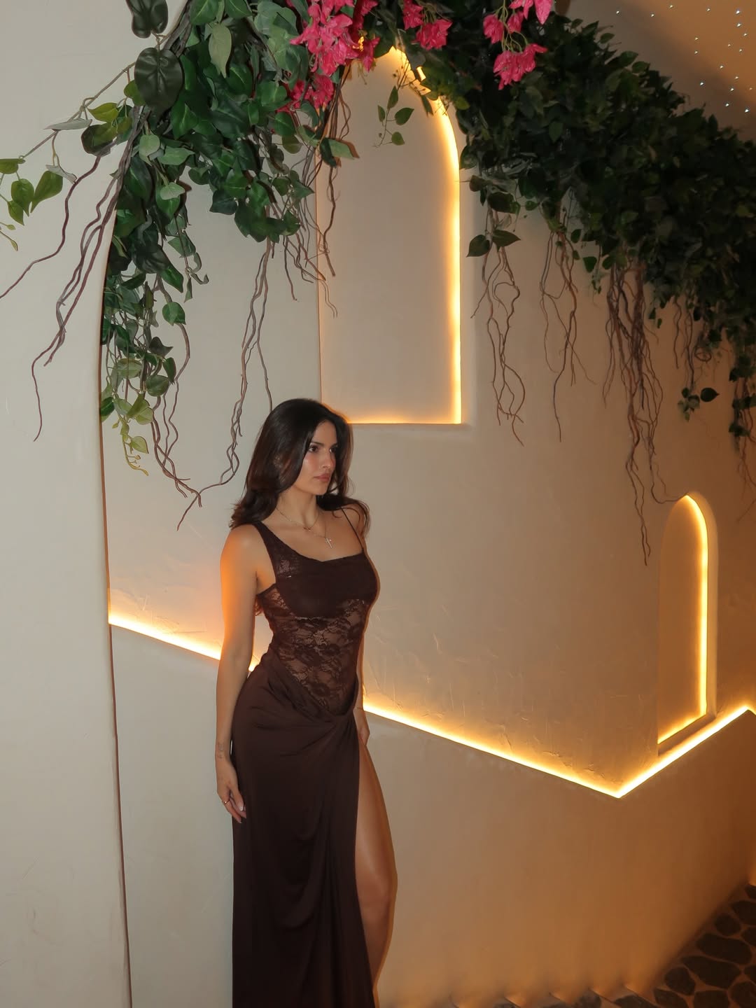 Standing beneath a minimal archway backdrop, Natasa embraces a timeless yet modern look. The delicate lace detailing and dramatic thigh-high slit highlight her bold fashion sense, while the earthy tones and soft lighting create a warm, elegant mood. The look is completed with minimal accessories and strappy heels, allowing her natural beauty and poise to take center stage.