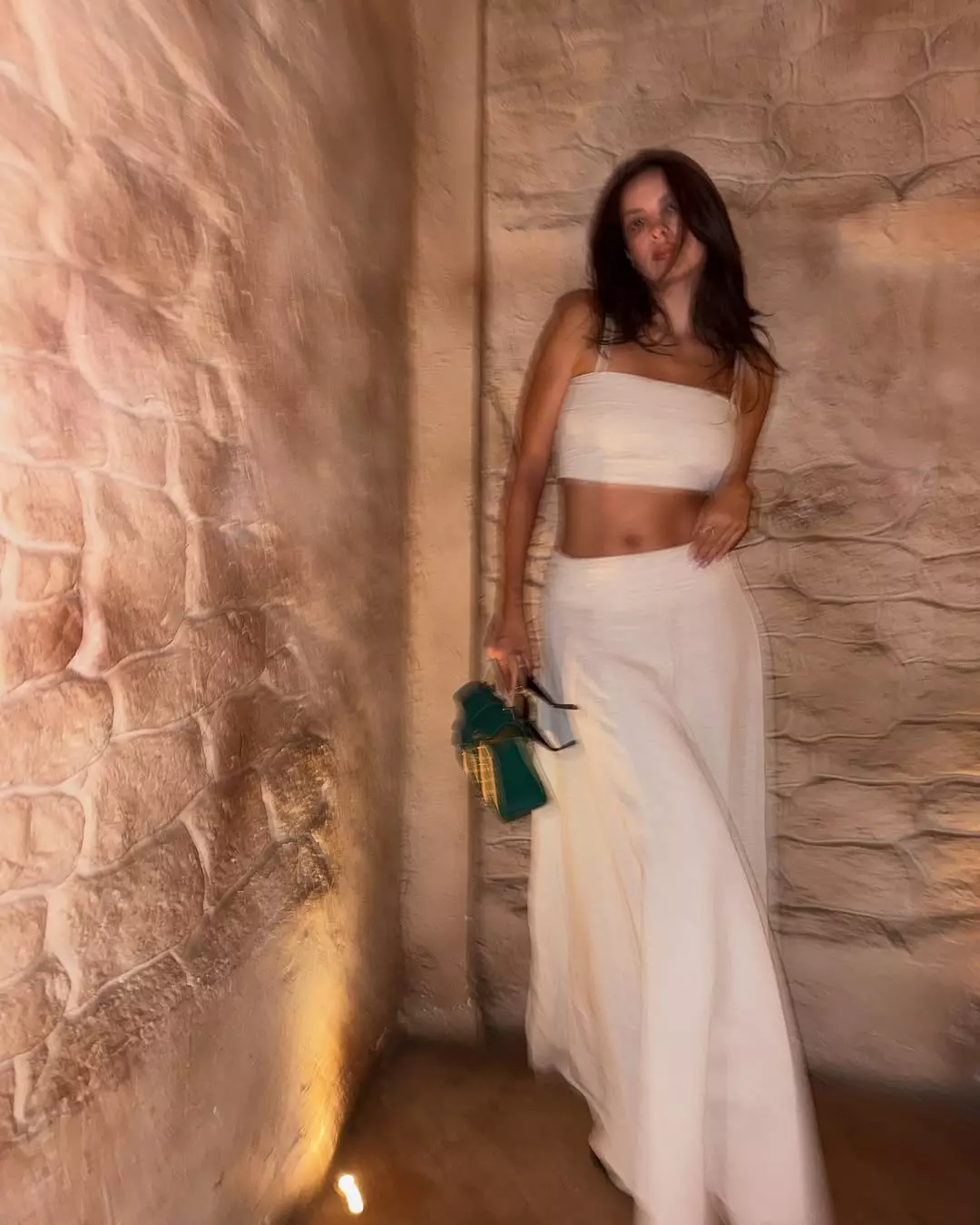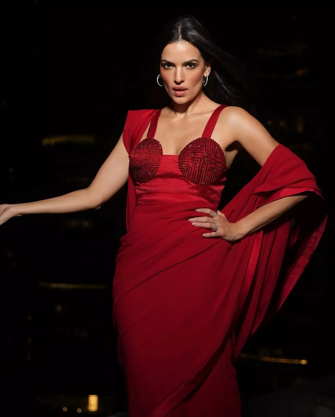 Natasa Stankovic can nail any type of fashion. In her Instagram photo, Natasa wears a long black dress with a leather finish. The dress has a sharp and bold look. She stands in a red-lit room and the photo shows her graceful walk and quiet power.