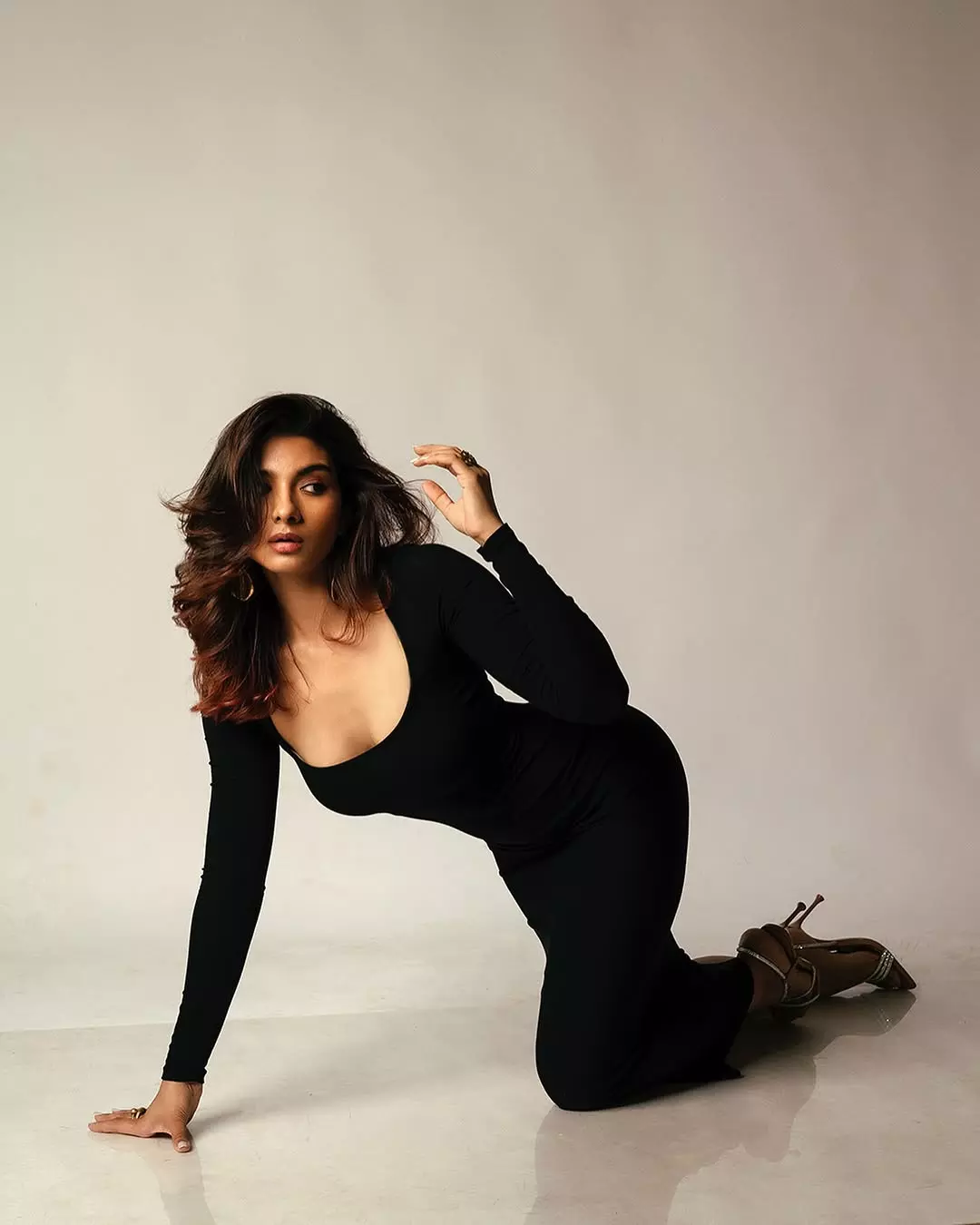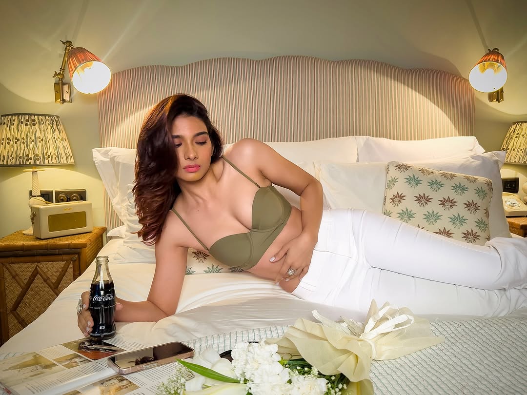 In this dreamy photograph, actress Natasha Bharadwaj looks effortlessly charming in a soft pink lace dress, bathed in vibrant pink and turquoise lighting. With her tousled hair, subtle makeup, and playful pout, she perfectly captures the vibe: “Feelin cute and that’s all!” The stunning image, captured by photographer @therahulsharmaa, radiates fresh, youthful energy and self-love.