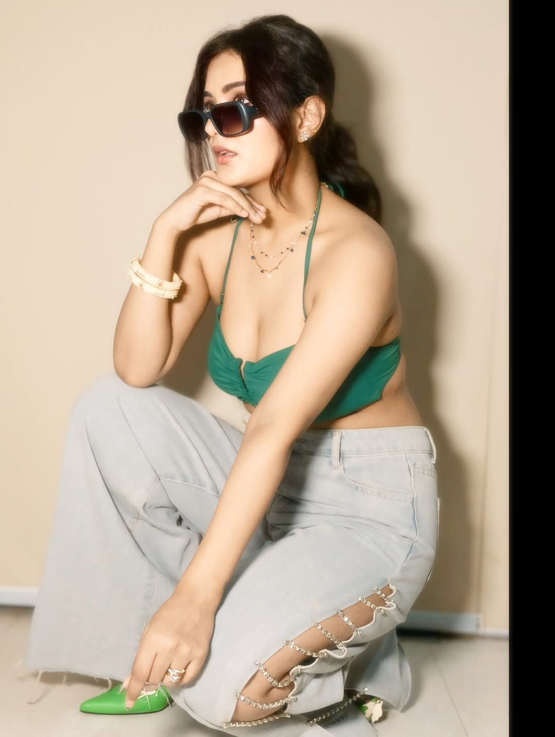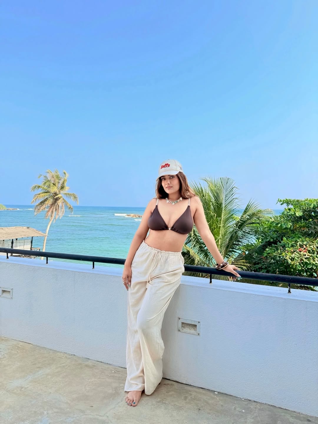 Natasha Singh captivates in this stunning beachside photo, embodying vacation vibes and effortless glamour. Leaning casually against a balcony railing with the turquoise ocean and swaying palm trees as her backdrop, she wears a chic brown bikini top paired with loose off-white linen pants that flow in the breeze. A white cap with a playful skull emblem, layered necklaces, and beaded bracelets add a boho touch, while her windswept hair and confident side gaze make her the undeniable star of the scene. POV: You booked the trip and became the main character—perfectly summing up this dreamy, empowering getaway aesthetic that screams adventure and self-love.