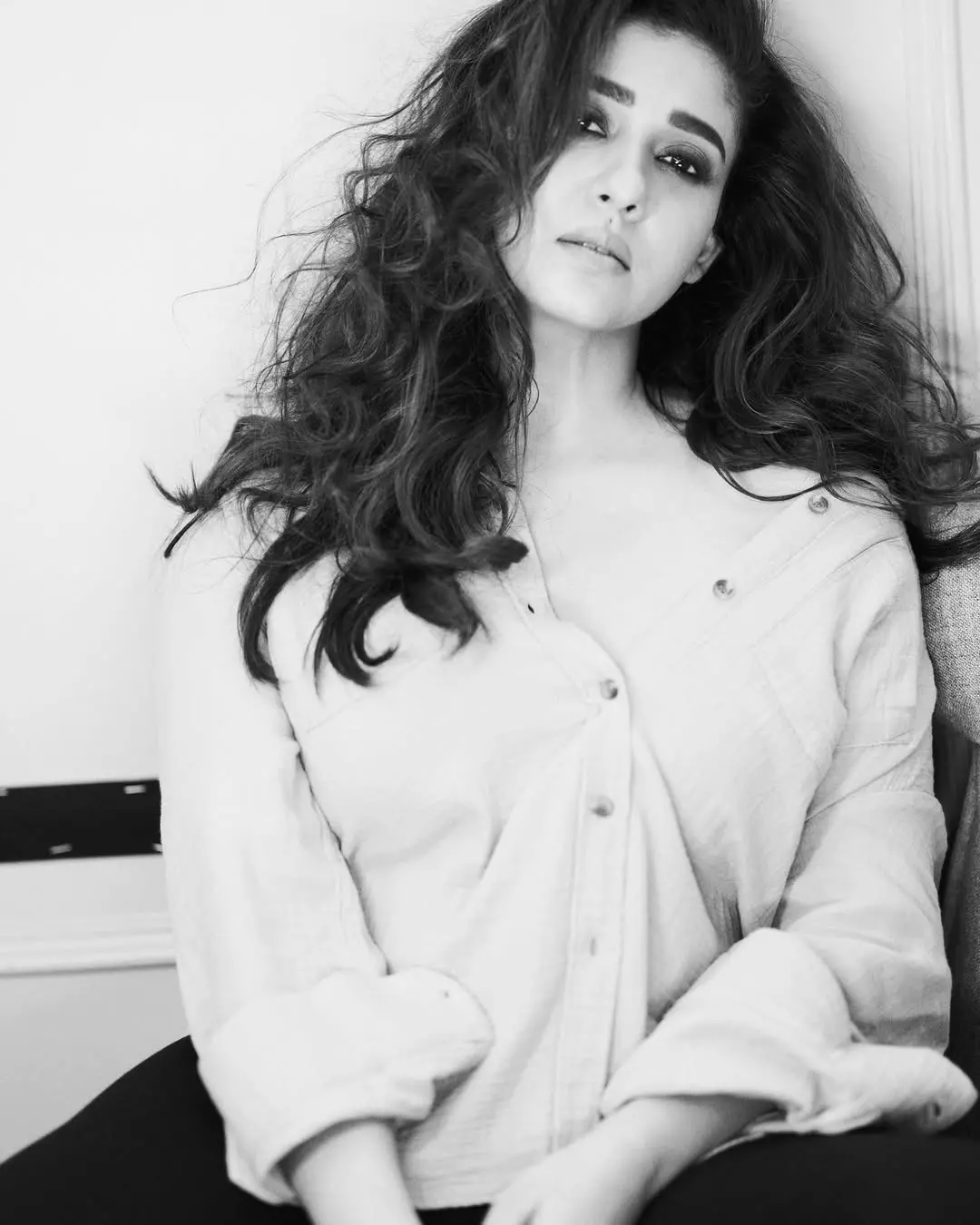 Known as the “Lady Superstar” of Indian cinema, Nayanthara continues to redefine elegance with every appearance. In this stunning portrait, she exudes effortless grace, dressed in a simple yet sophisticated black ensemble paired with traditional jhumkas and a classic red bindi. The soft lighting enhances her natural beauty, while her expressive eyes capture both strength and serenity. The look is minimal, but the impact is powerful—just like her screen presence.