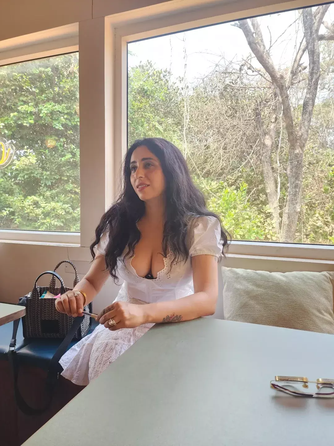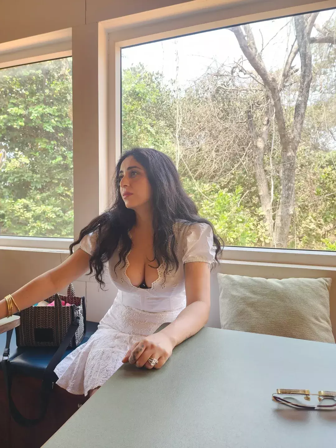 In the photo, Neha Bhasin is seen sitting beside a window and smiling while looking outside. Bright sunlight is coming through the window, and green trees can be seen in the background. She appears relaxed and happy, enjoying a peaceful moment. Neha is wearing a white dress and stylish sunglasses.