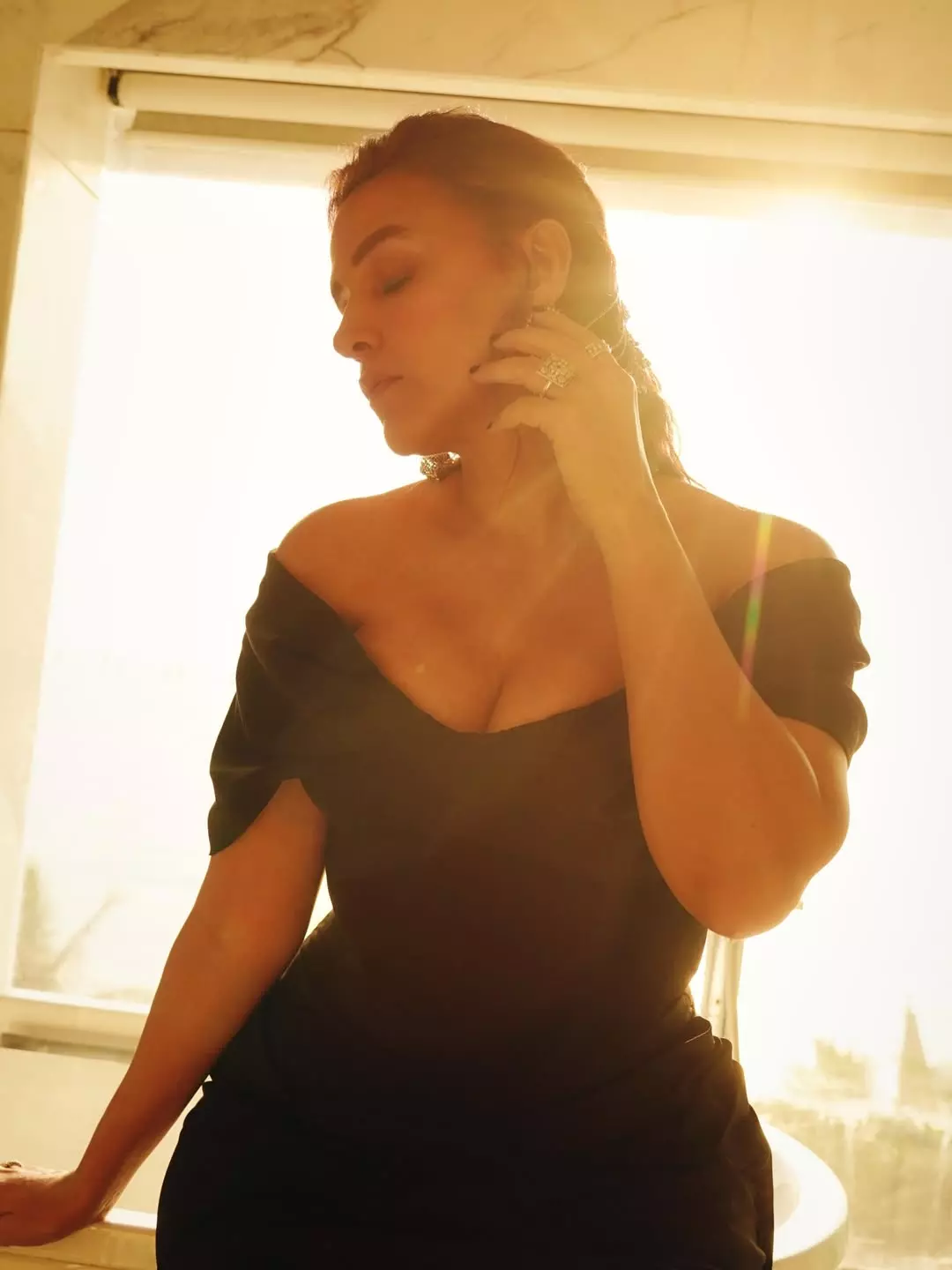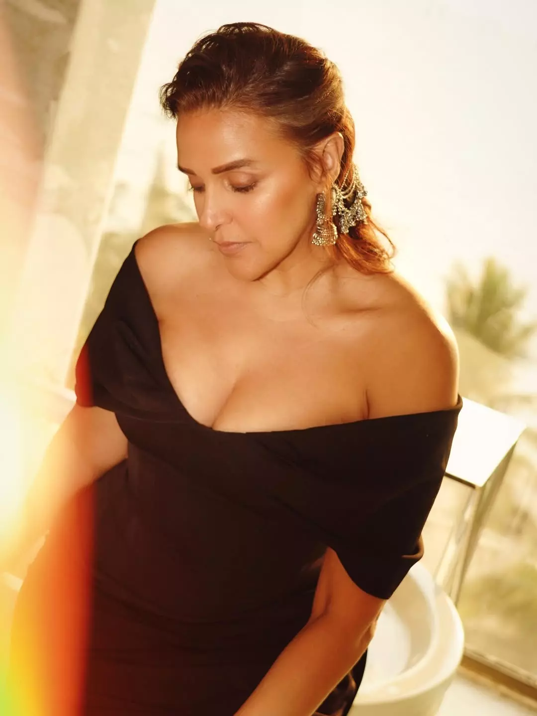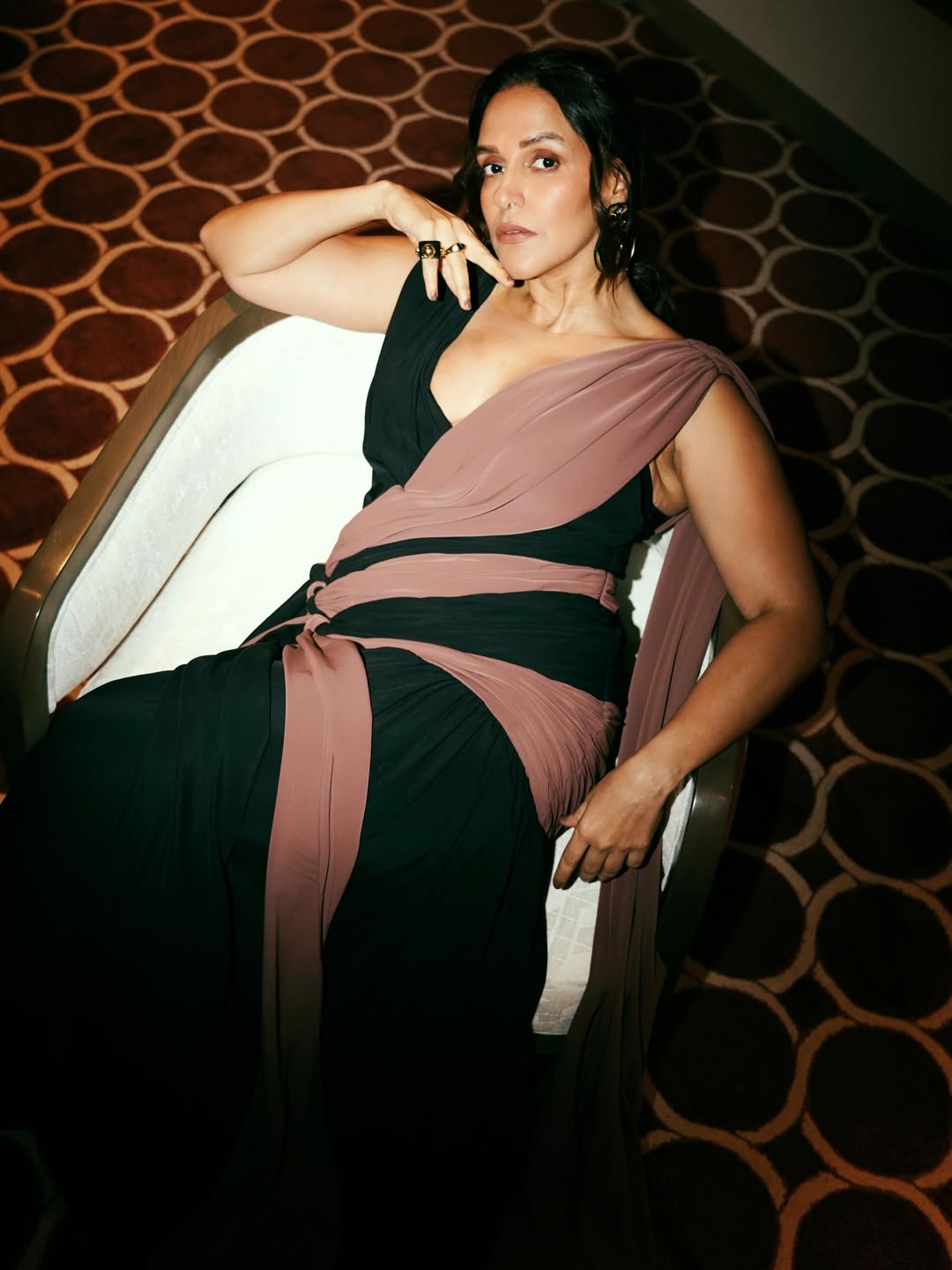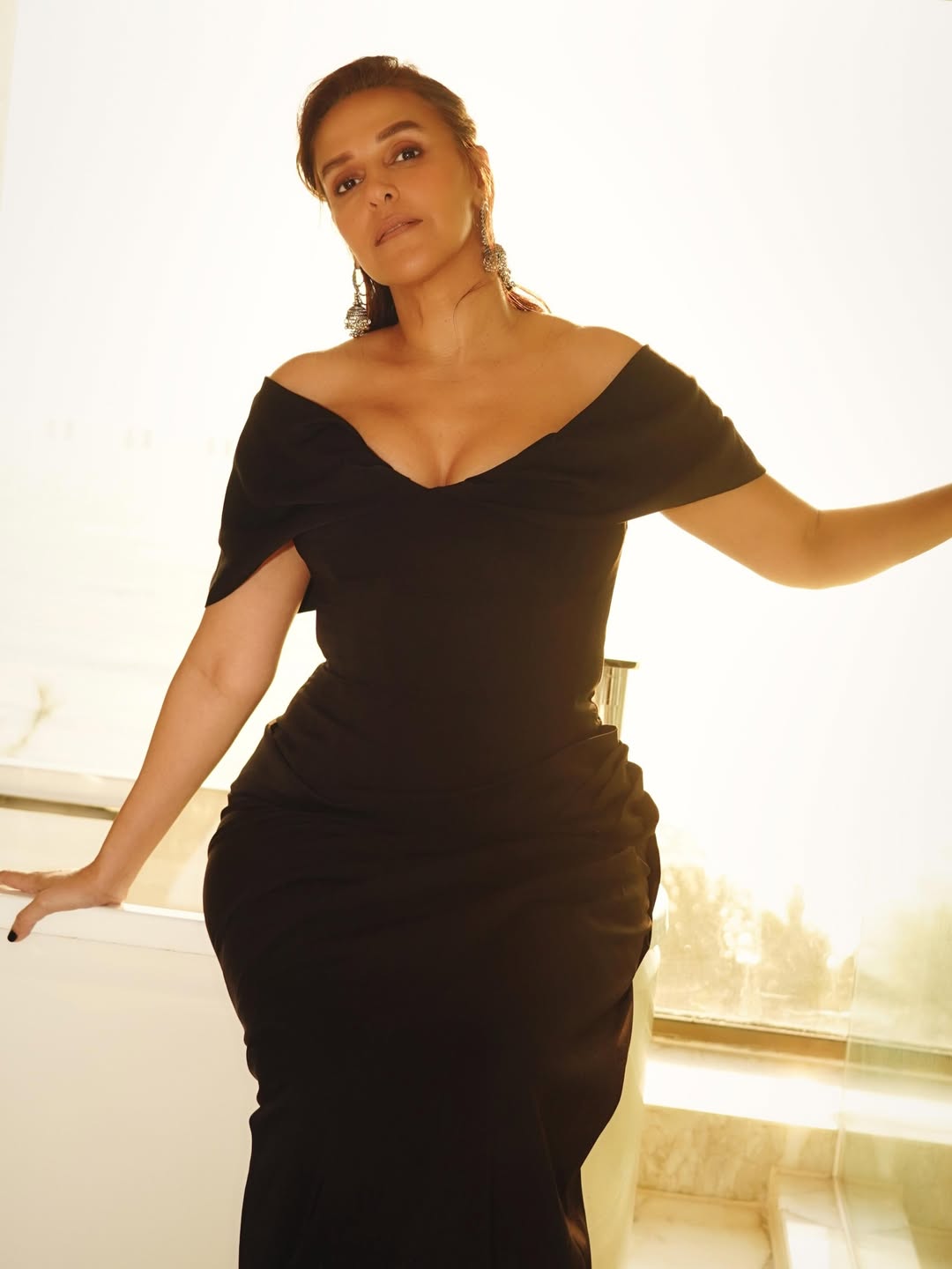 Neha Dhupia looks absolutely stunning in this glamorous black off-shoulder ensemble, exuding confidence and elegance as she poses by the bathtub.Trophy Wife — the multi-talented actress and devoted wife to Angad Bedi recently added another feather to her cap. At the Pinkvilla Screen & Style Icons Awards 2026, she won the Best Supporting Actor - OTT Female for her delightful role as Romilla Nehra (Mrs Nehra) in the Netflix series Single Papa.