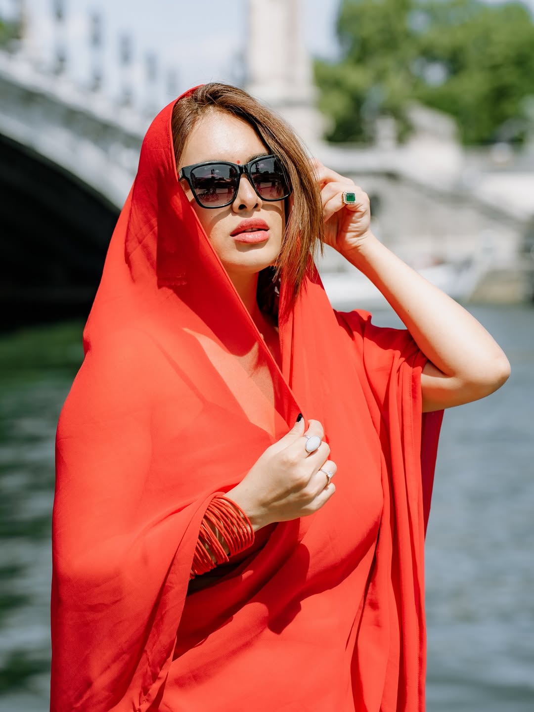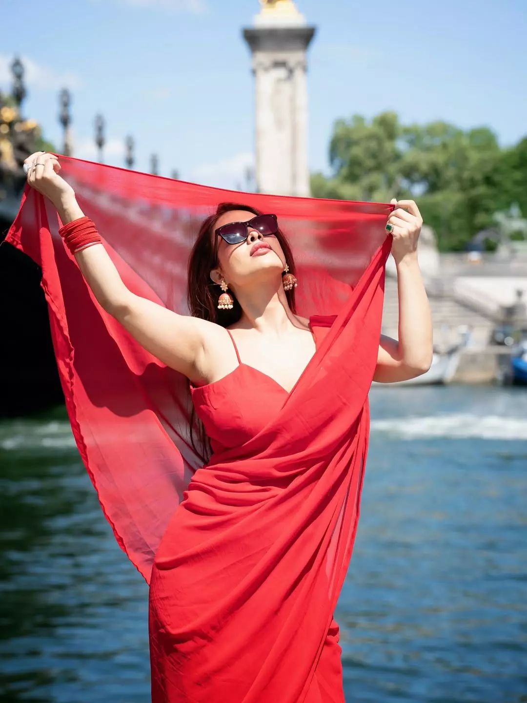 Her recent Instagram picture, where she confidently flaunts a red saree with a beautiful pose in front of a scenic background is just awesome.