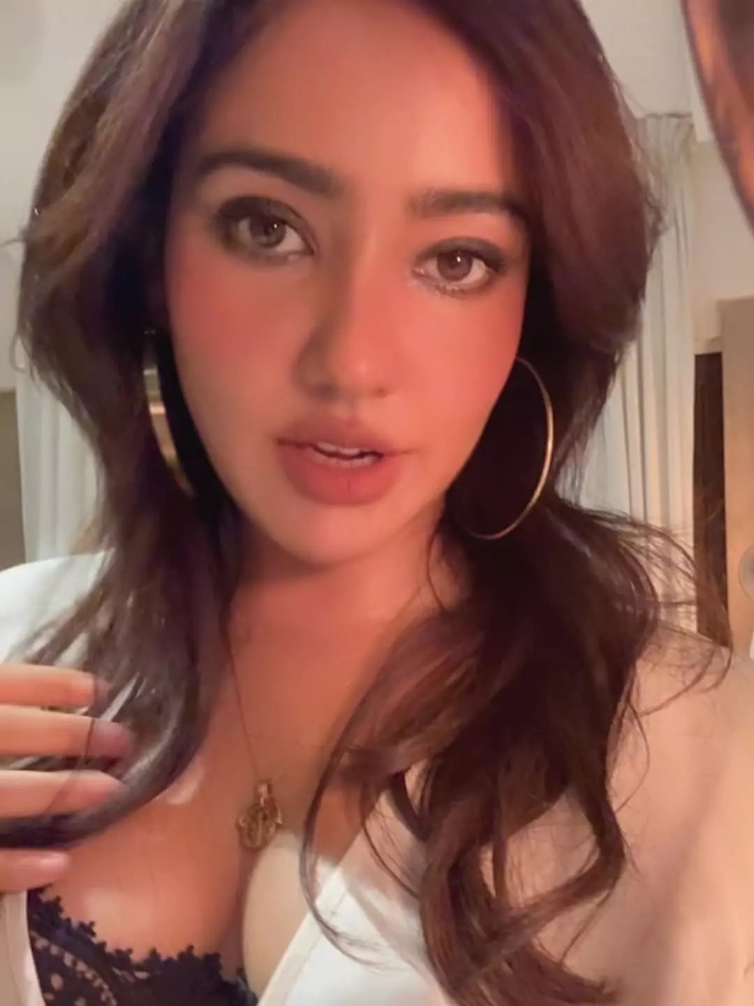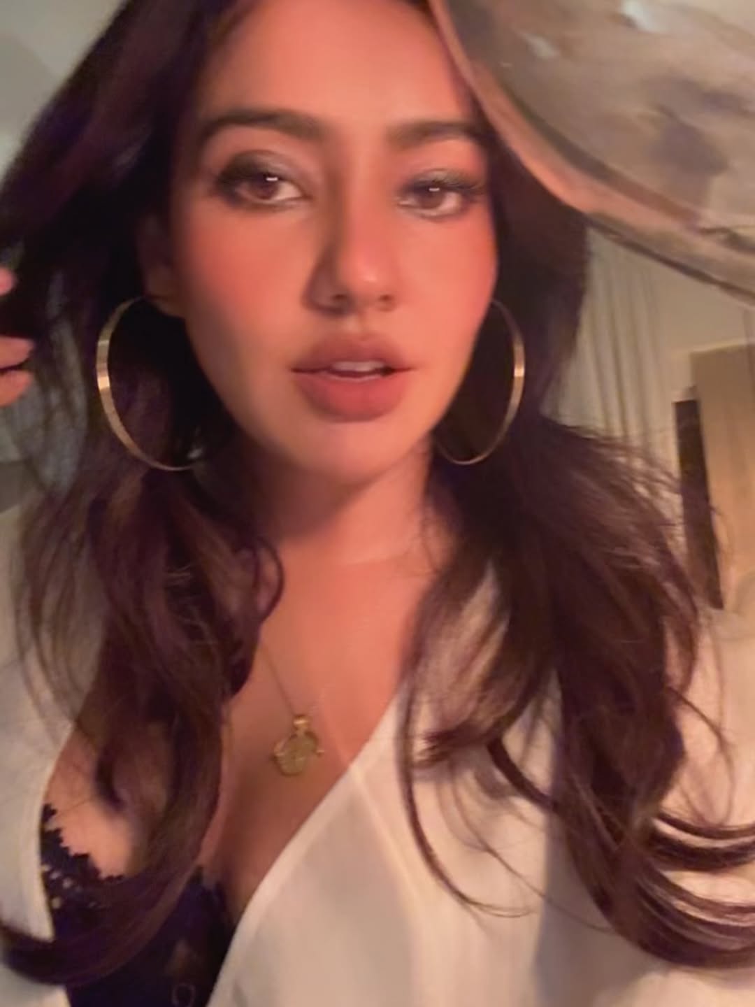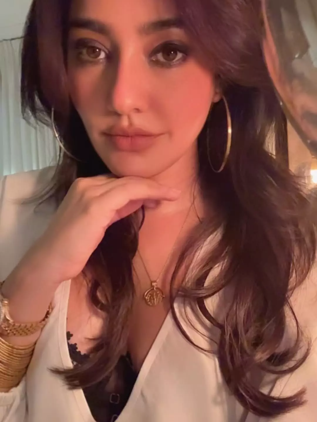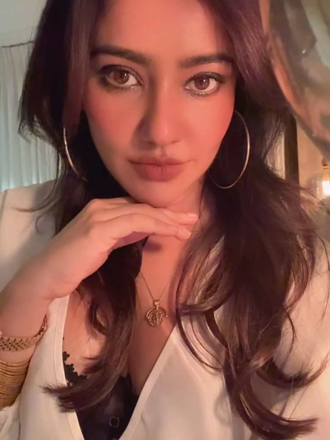 Bollywood actress Neha Sharma is turning heads once again with her latest glamorous selfie. The Bihar-born beauty shared a captivating close-up, flaunting her striking features, voluminous wavy hair, bold hoop earrings, and a chic white blazer look. With a subtle hand-on-chin pose and warm lighting, Neha exudes confidence and effortless elegance.