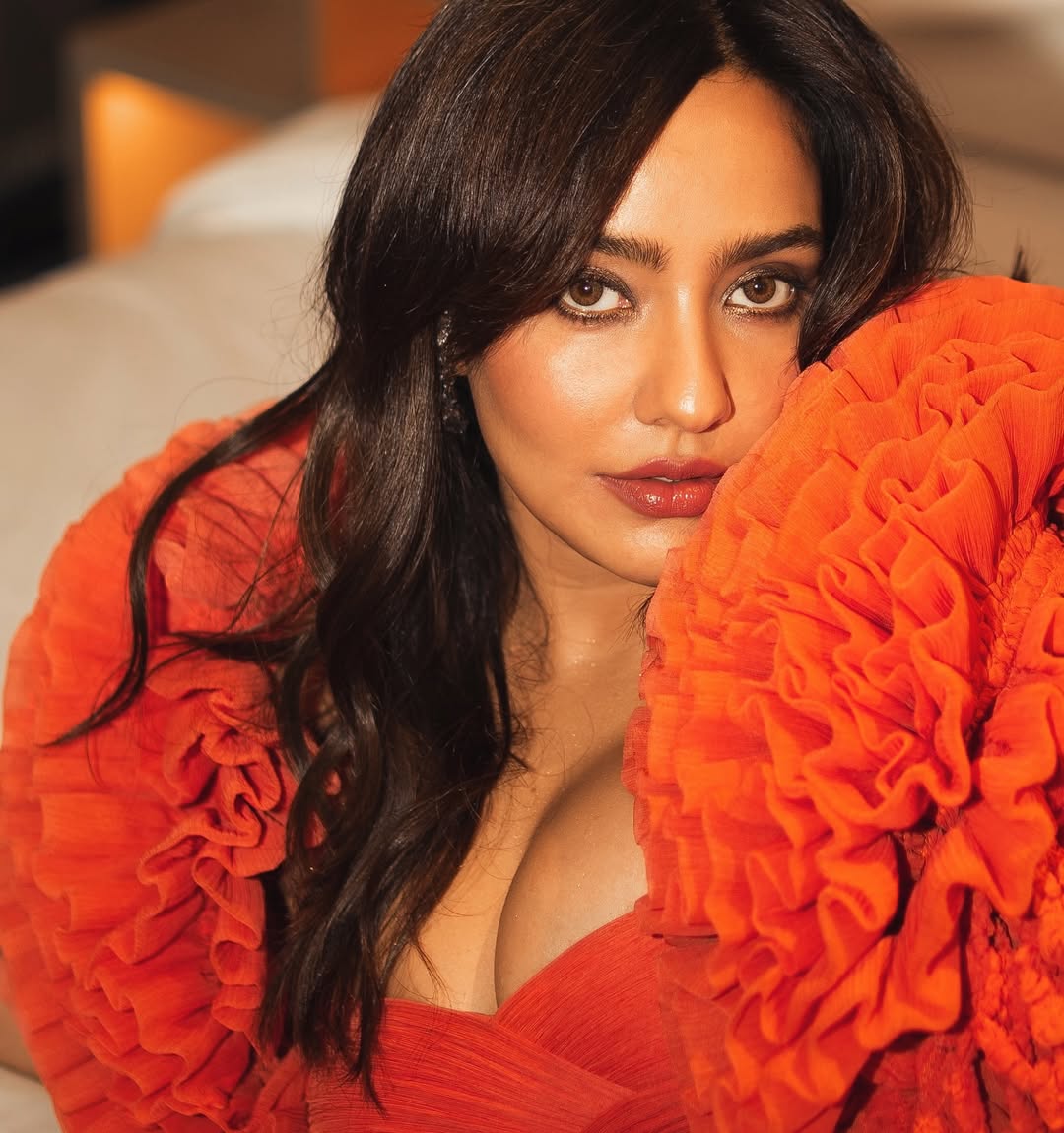 Neha Sharma looks radiant and confident in this striking indoor portrait, draped in a flowing pale yellow ruffled outfit with a deep V-neck and dramatic draped details.