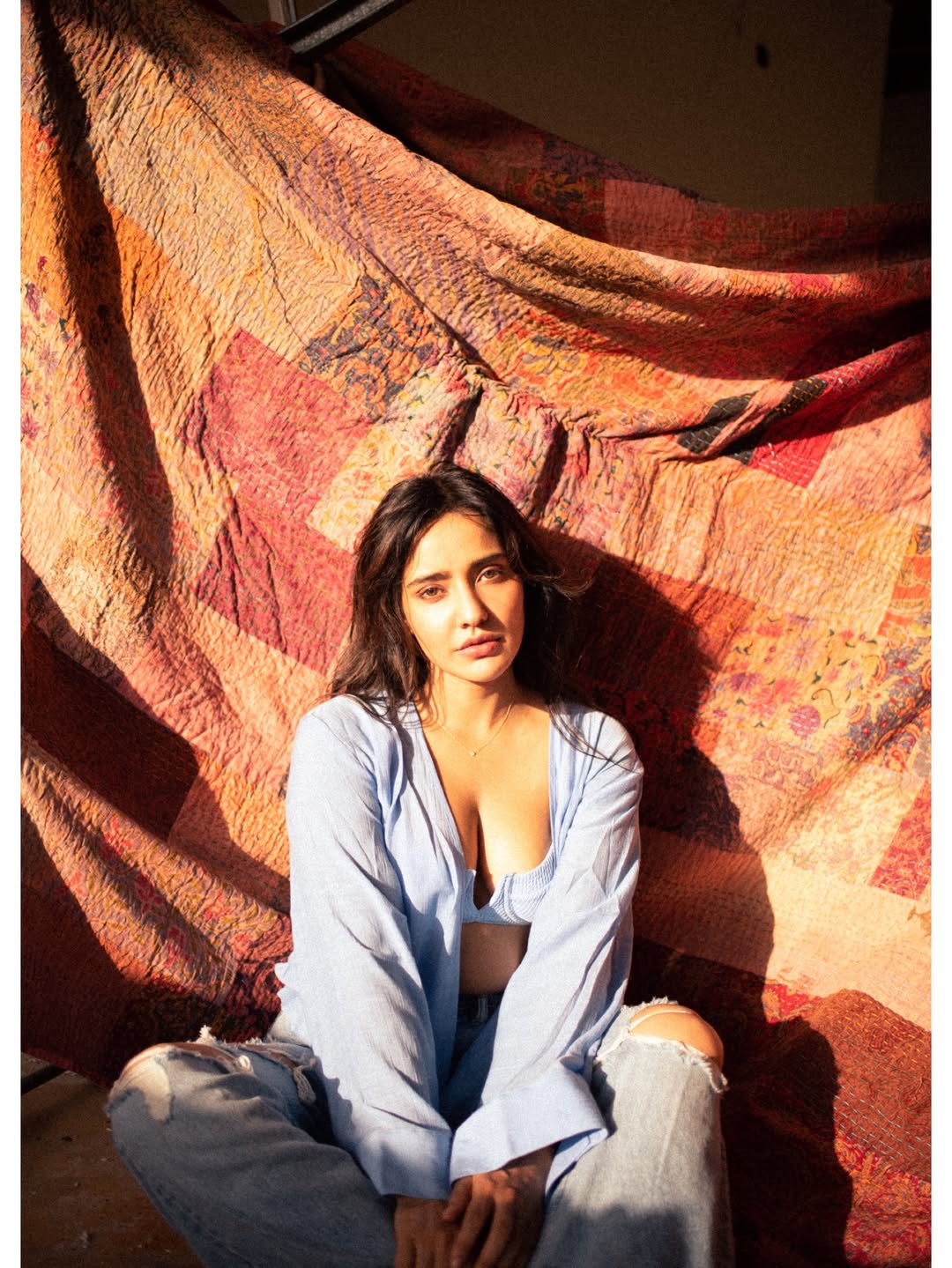 Neha Sharma looks radiant and confident in this striking indoor portrait, draped in a flowing pale yellow ruffled outfit with a deep V-neck and dramatic draped details. Leaning against a light wall with soft natural lighting casting a gentle shadow, she gazes directly at the camera with a subtle, captivating expression. The breezy, ethereal look perfectly matches her playful caption: “wildly delusional… and I like it like that ” — a fun, unapologetic celebration of dreams, confidence, and embracing one’s bold side.