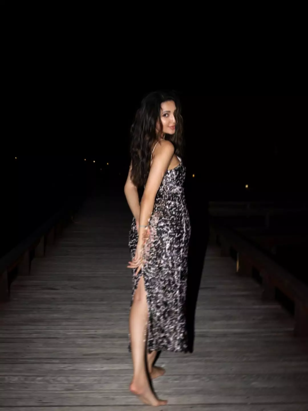 The picture is from Sheraton Maldives Fullmoon Resort. The place looks calm and beautiful at night. Neha is giving major fashion goals with this stylish dress. Her open hair and minimal accessories make her look classy. The smile on her face adds extra charm to the picture.