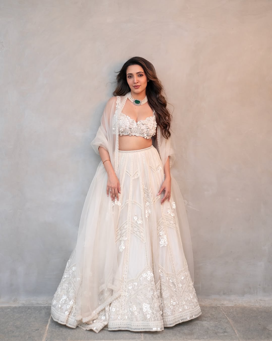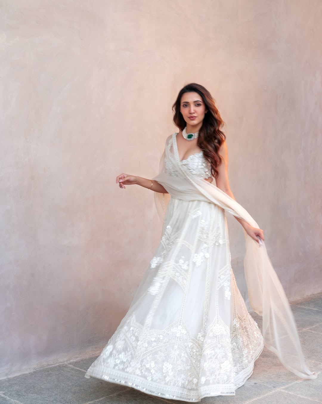 Neha is seen wearing a beautifully designed outfit by @sahilkochharofficial, which perfectly complements her silhouette and adds a refined glamour to the look. The intricate detailing of the ensemble enhances her overall appeal, striking a fine balance between tradition and modern aesthetics. She pairs the outfit with exquisite earrings from @vasundharajewelry and @ascend.rohank, while the bangles and kadas from @the_jewel_gallery add a touch of regal elegance.