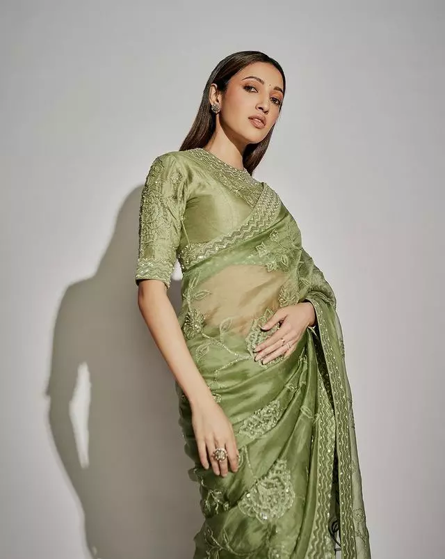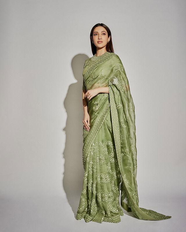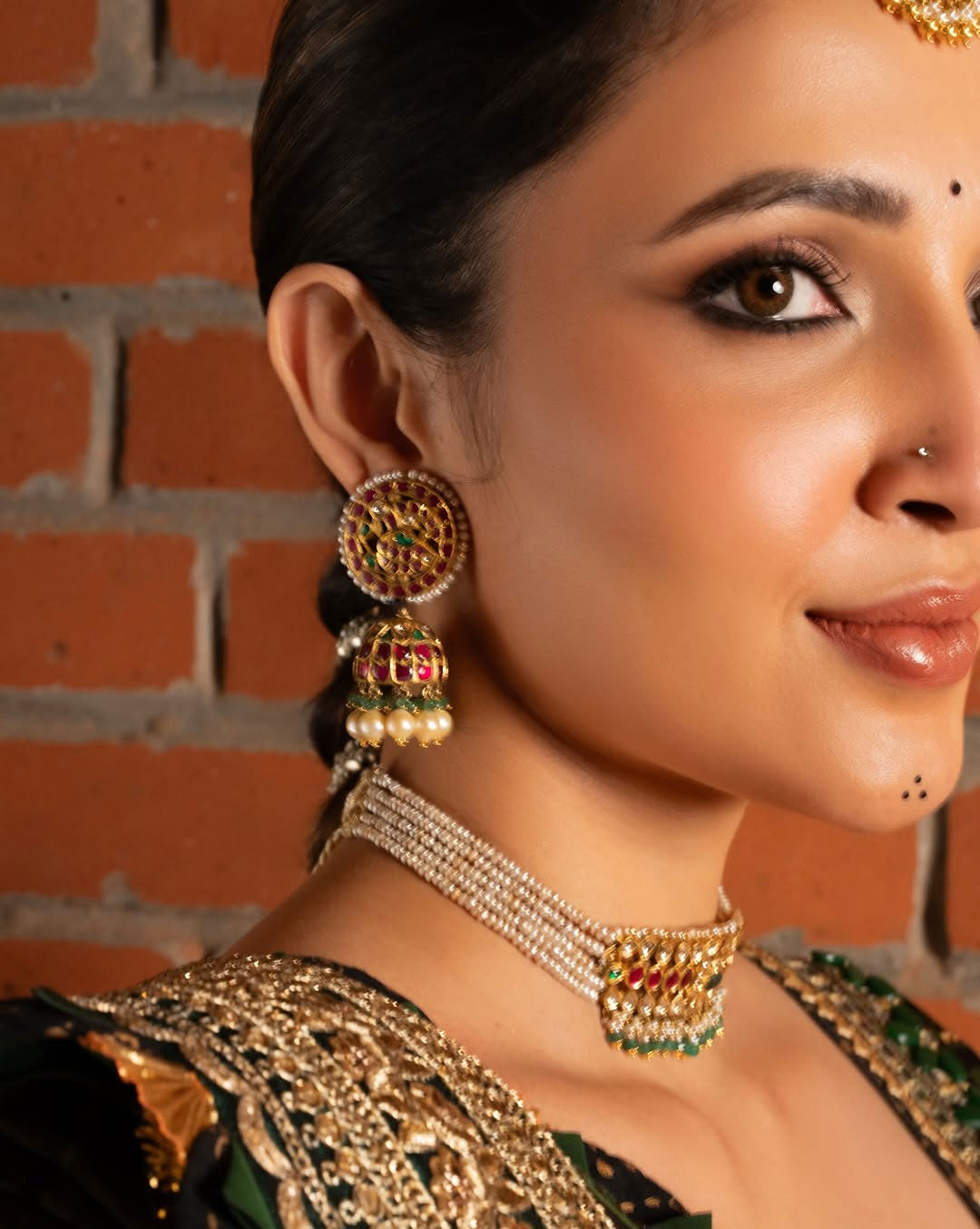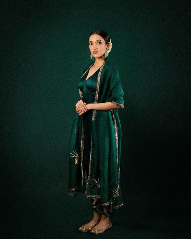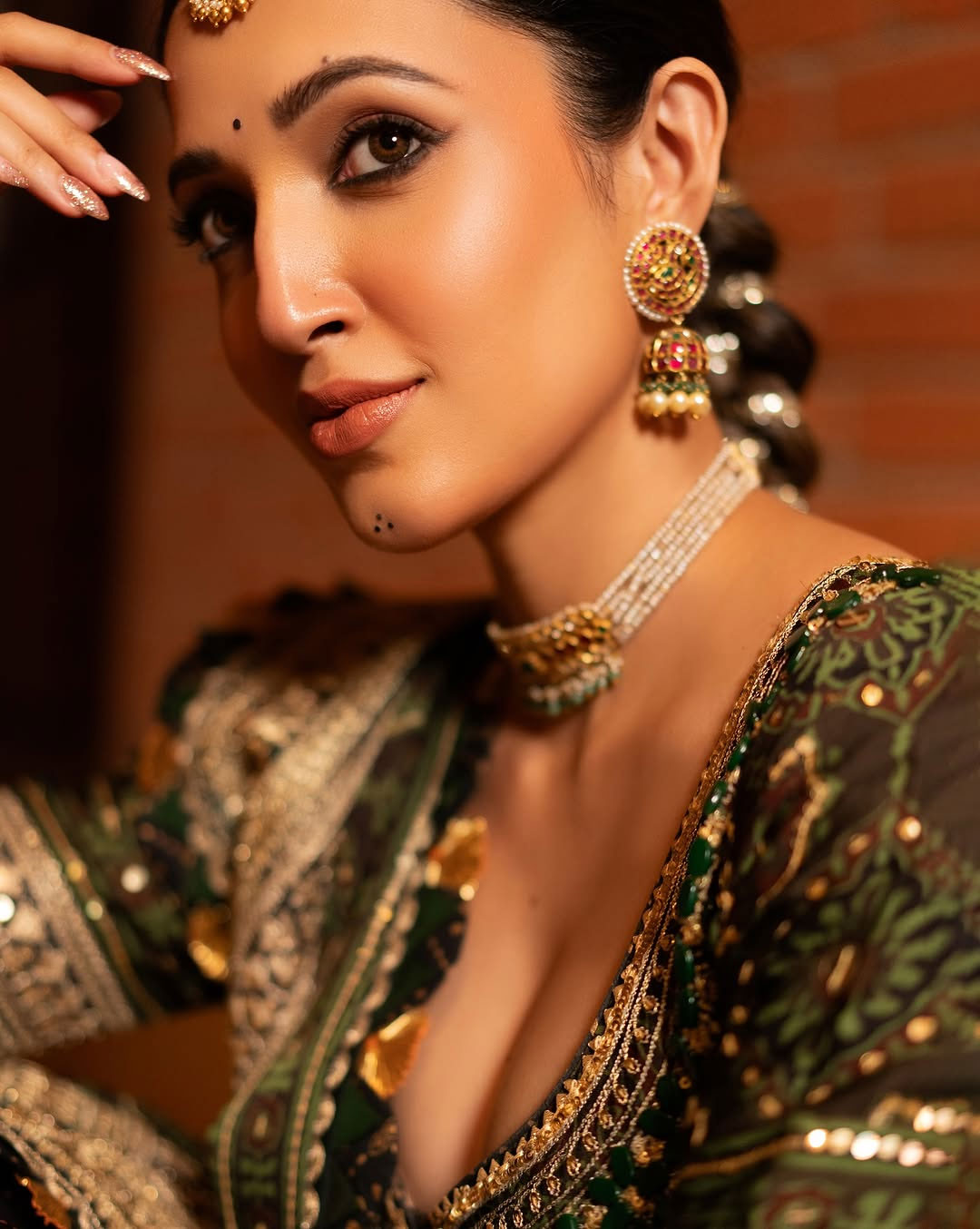 The outfit is a celebration of Indian craftsmanship, styled by @jukalker. Her jewelry from @ananthdiamonds sparkles with royal grace, and the look is flawlessly completed by @makeupbyharika's soft, glowing makeup. Captured beautifully by @kannasrihari, the image speaks louder than words. She is like a brush of gold, a thread of green. In every fold, a royal sheen.