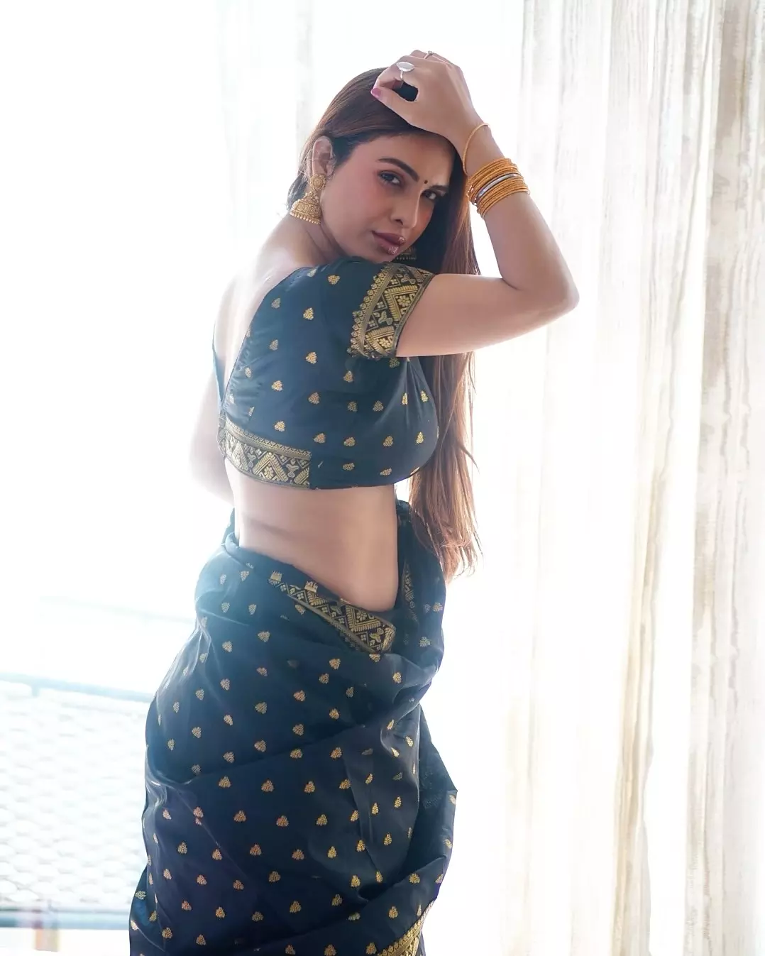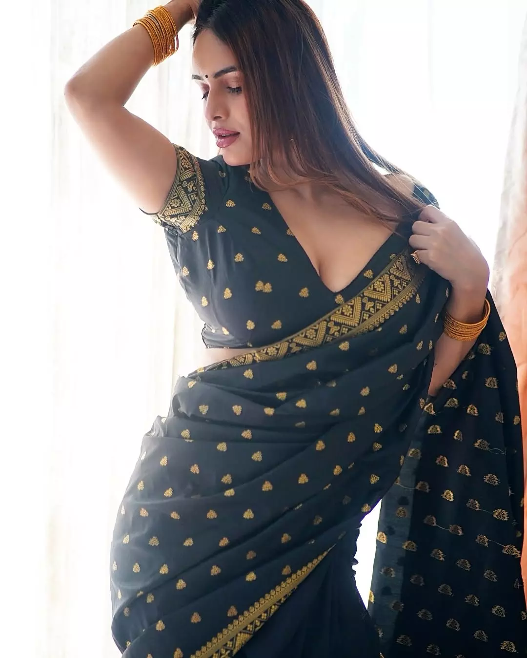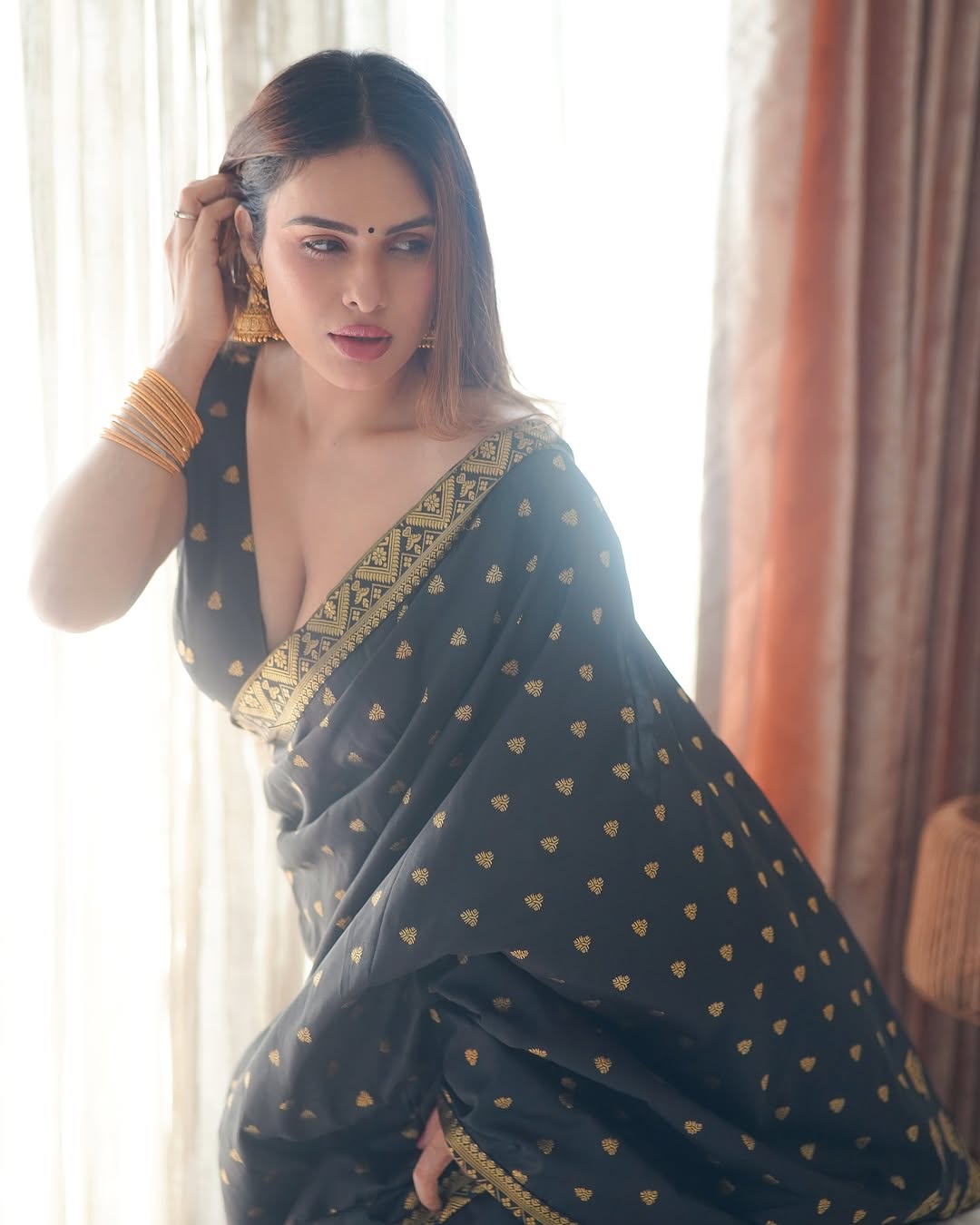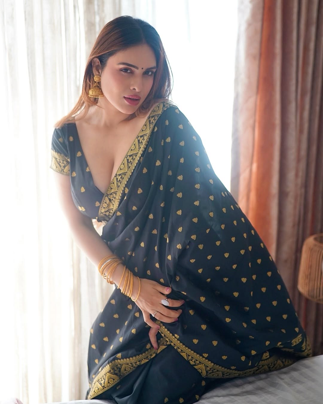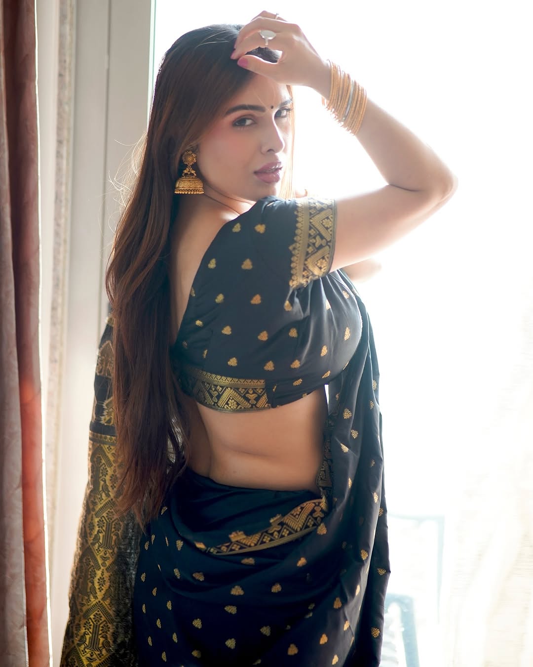 By: Tupaki Desk | 10 March 2025 11:19 AM ISTNehhaa Malik is one of the young actors in Hindi cinema who is constantly trying to impress her fans and followers.Nehhaa Malik stunned her followers with her recent photos in a classic black saree, exuding timeless elegance and grace. The actress paired the saree with a sleek blouse, creating a perfect balance of tradition and modern style.