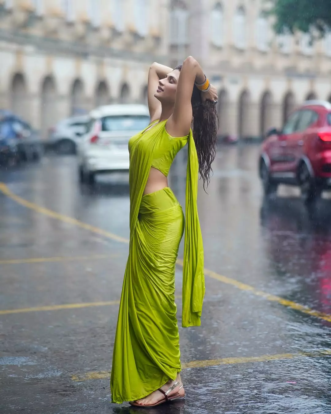 In the photo, Nidhi is seen striking a powerful pose in the rain. She is dressed in a adorable lime green saree and embraces the monsoon vibes on a wet Mumbai street. Her arms raised gracefully over her head, wet hair falling back and her confident expression truly capture the essence of the caption: