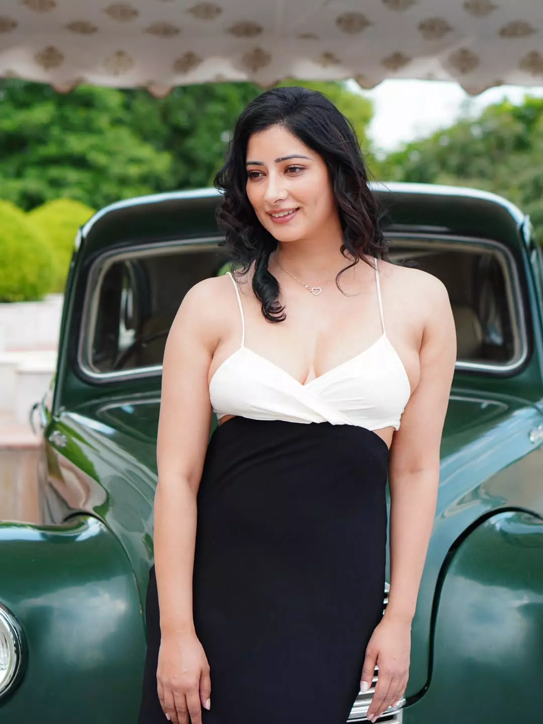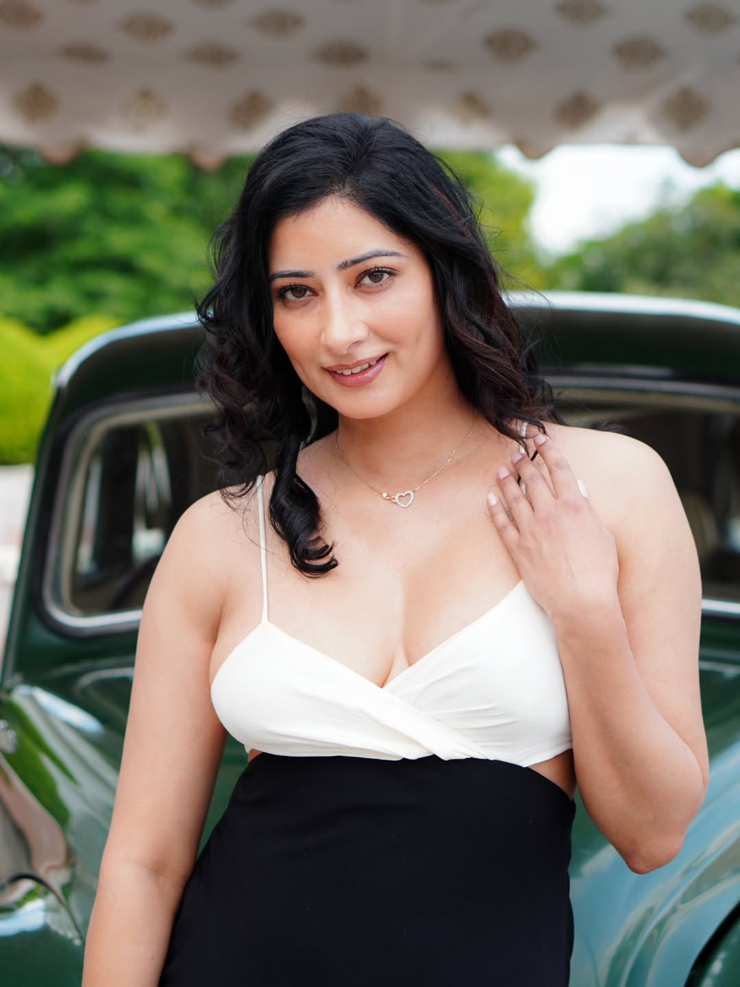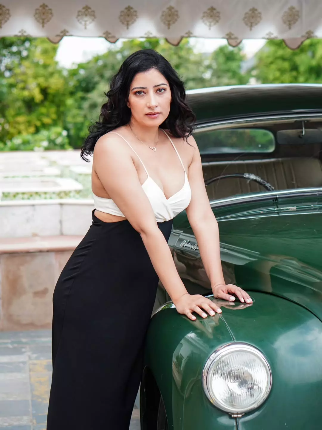 In this striking photo, Niharica Raizada leans gracefully against a vintage green car, exuding timeless elegance and quiet strength.