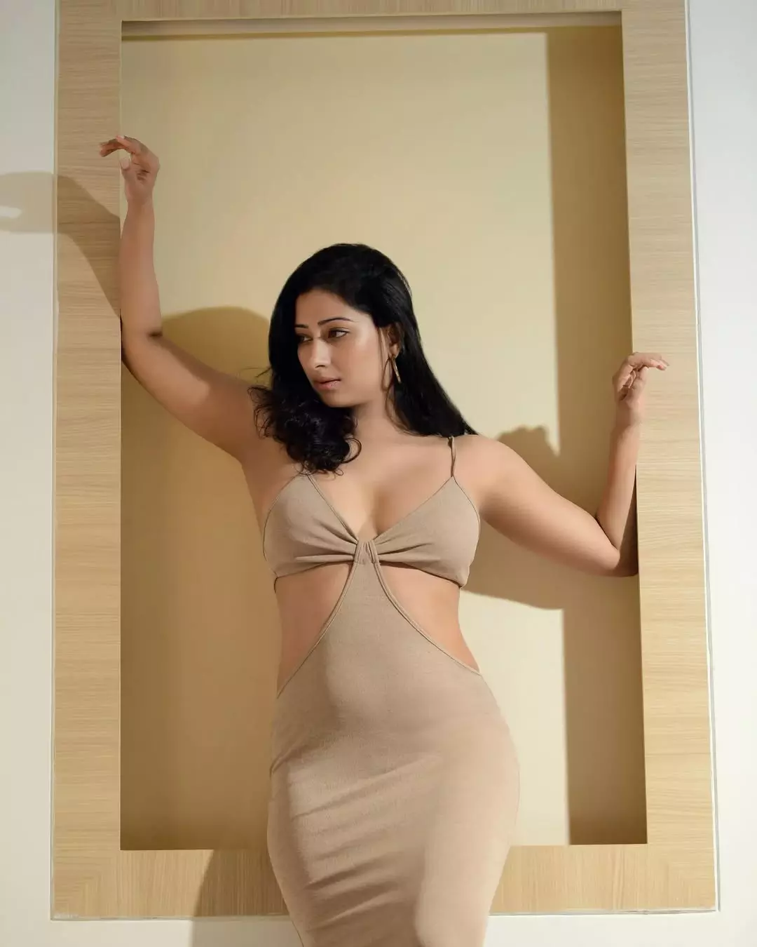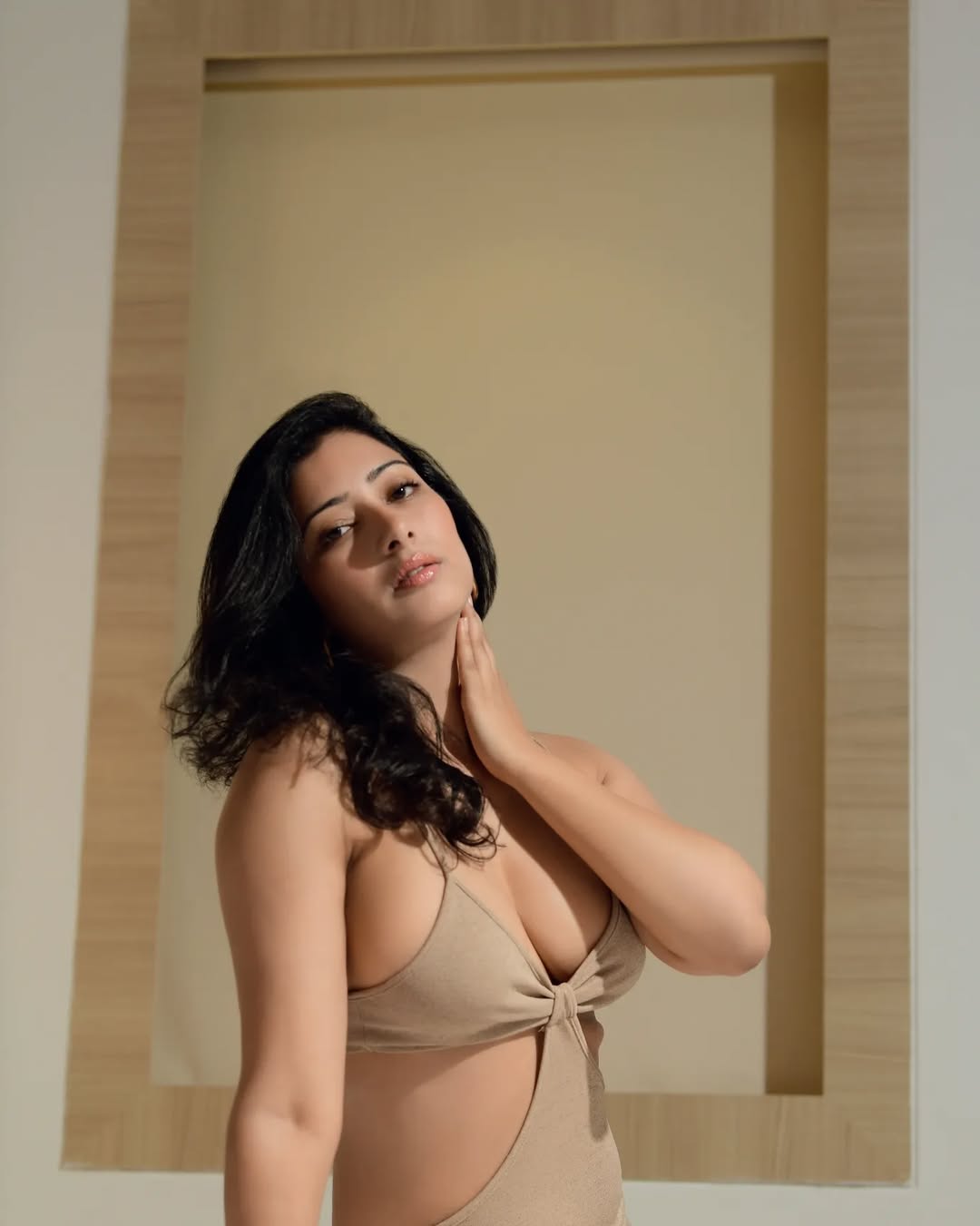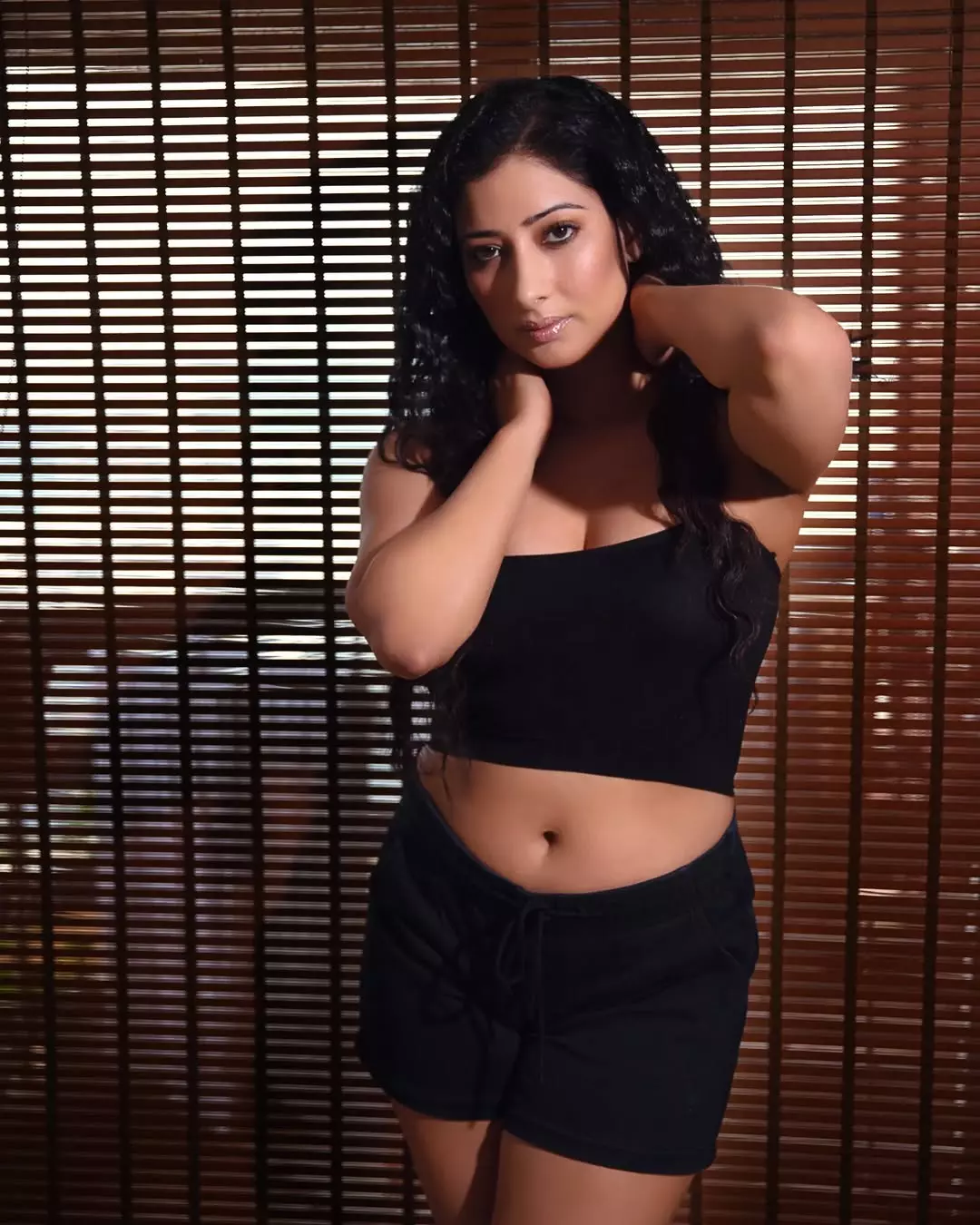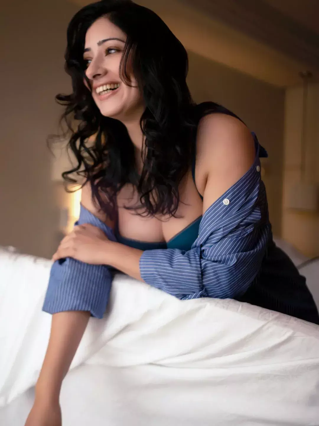 Niharica Raizada leans into soft dawn light, a half-buttoned striped shirt slipping from her shoulders like a secret shared with the camera.