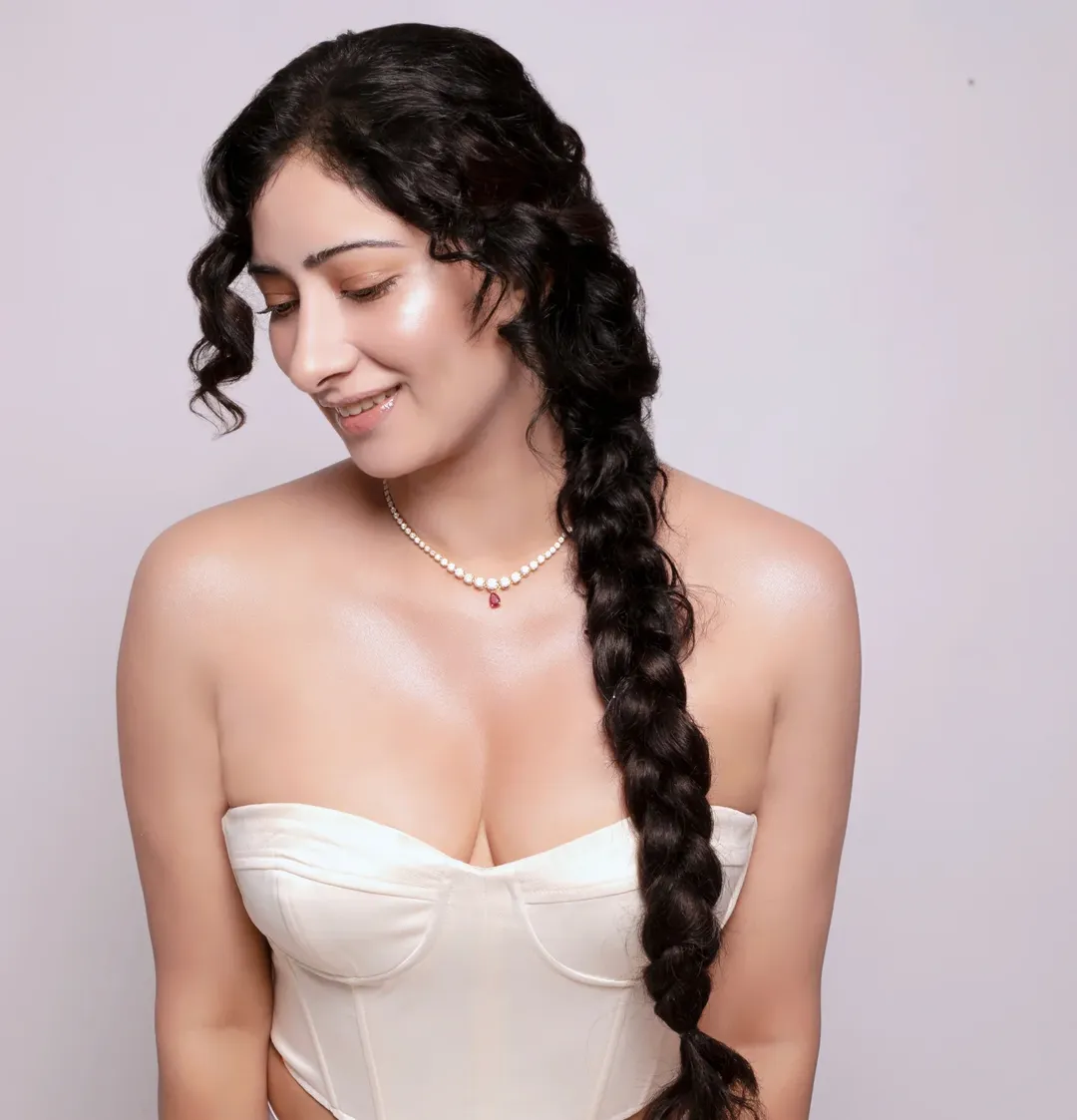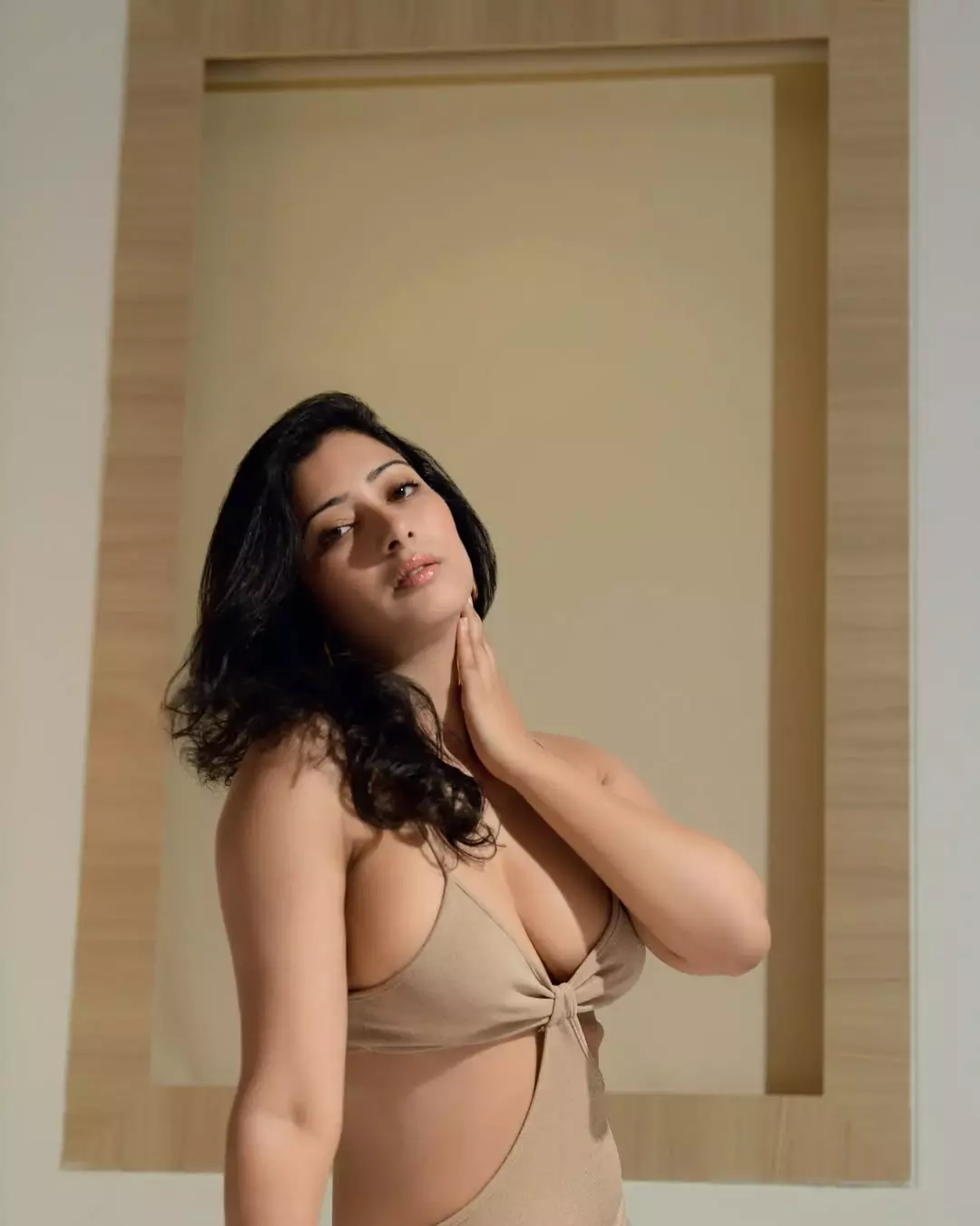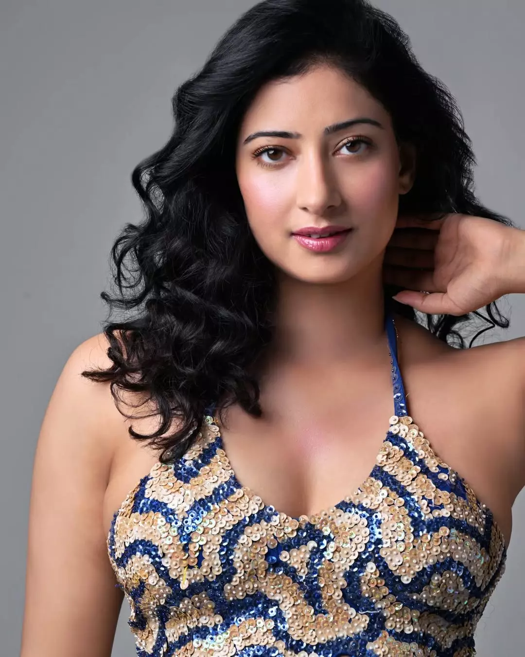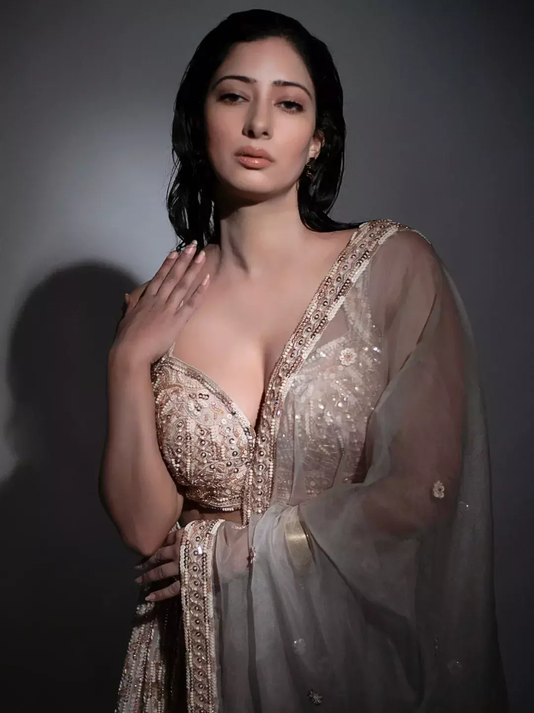 Niharica Raizada is dripping old-world glamour in this champagne-gold saree that’s practically woven from liquid moonlight. The heavily embellished plunging blouse hugs her like a second skin, while the sheer pallu cascades with understated drama. Smokey eyes, glossy lips, and that sultry half-gaze – she’s giving vintage Bollywood siren vibes with a modern edge. I always need more!