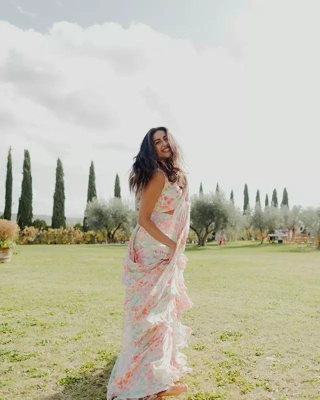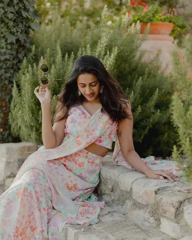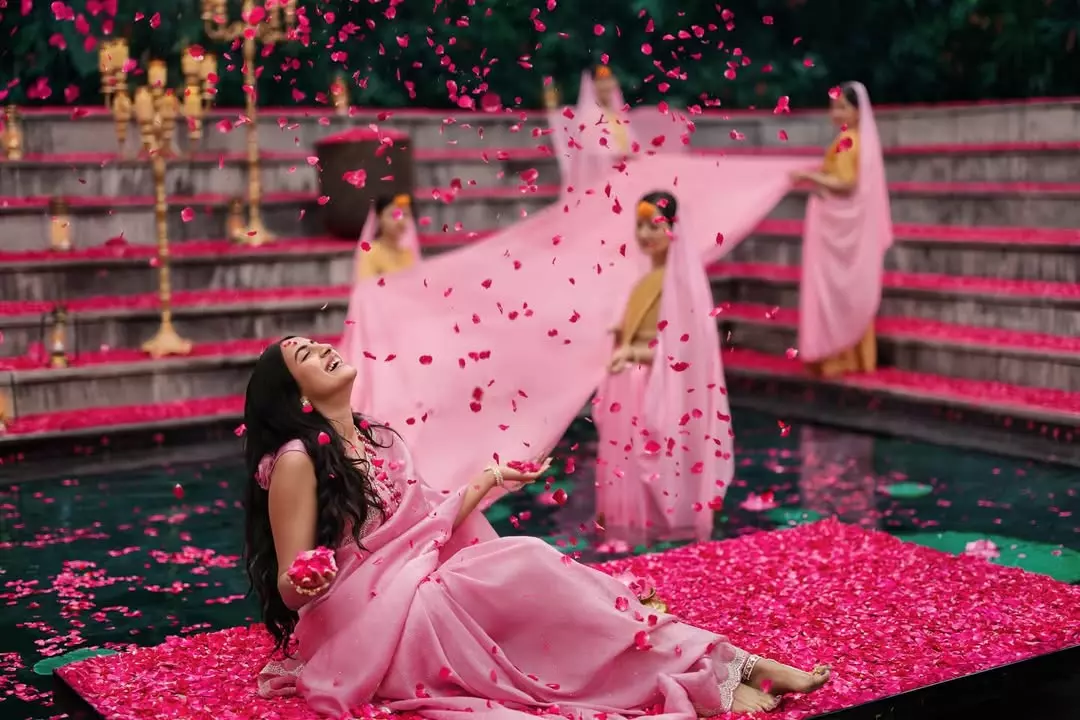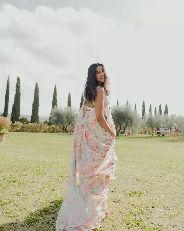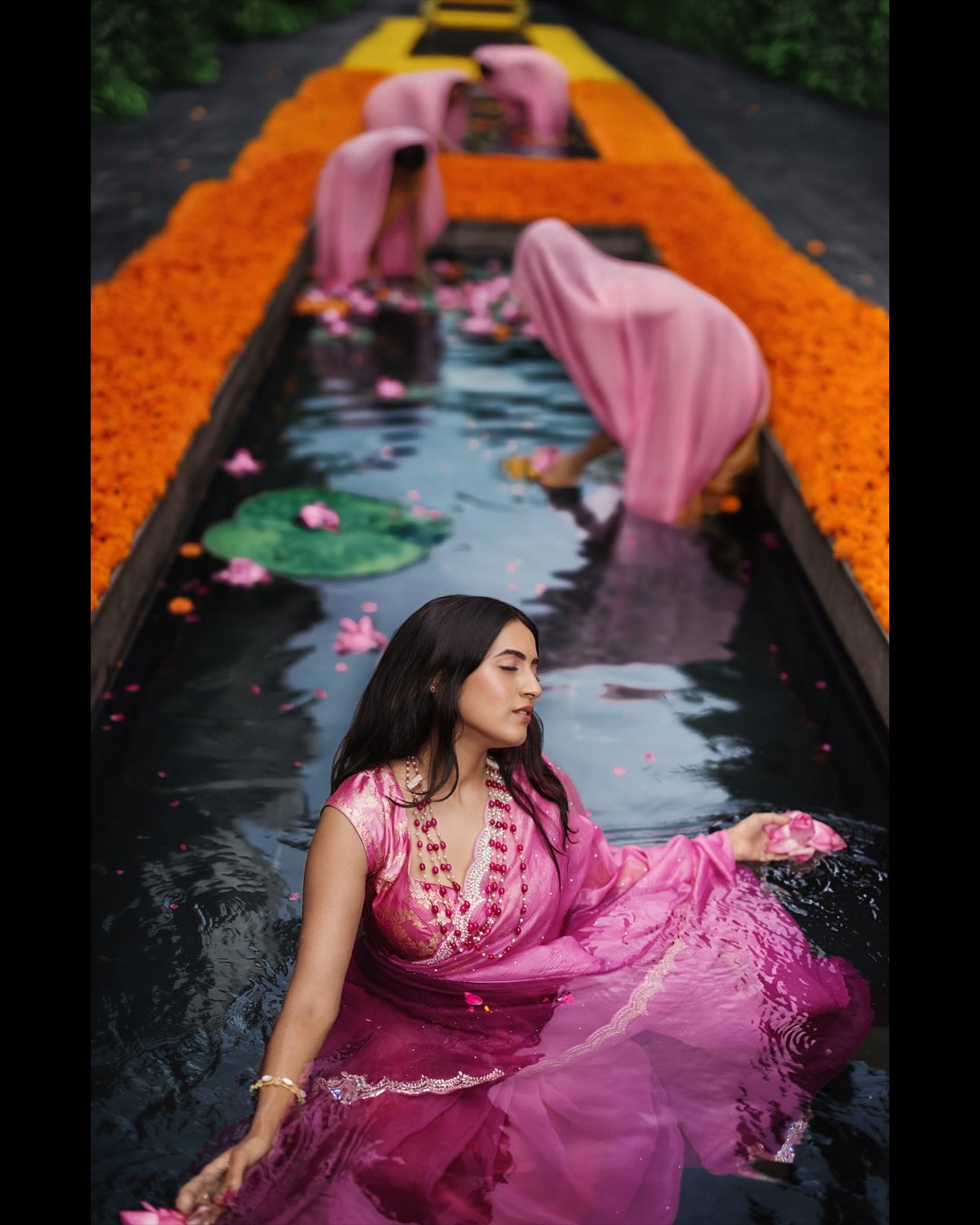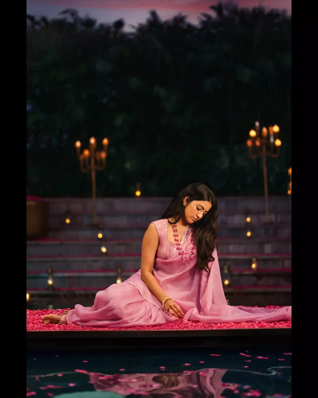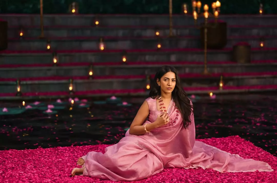 In her latest photoshoot, she paints a poetic picture in a delicate rose-pink saree, seated amidst floating rose petals on serene waters at twilight. Adorned with intricate jewelry and subtle makeup, her poised demeanor exudes tranquility and luminosity – a true visual symphony of serenity and grace.
