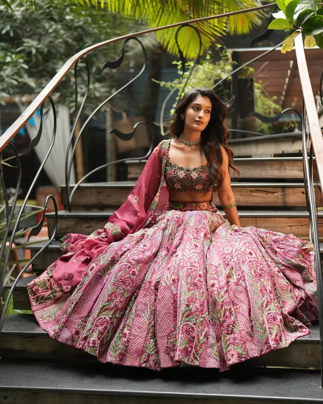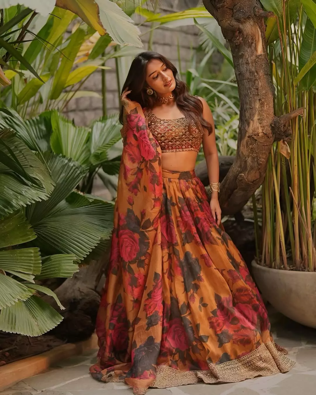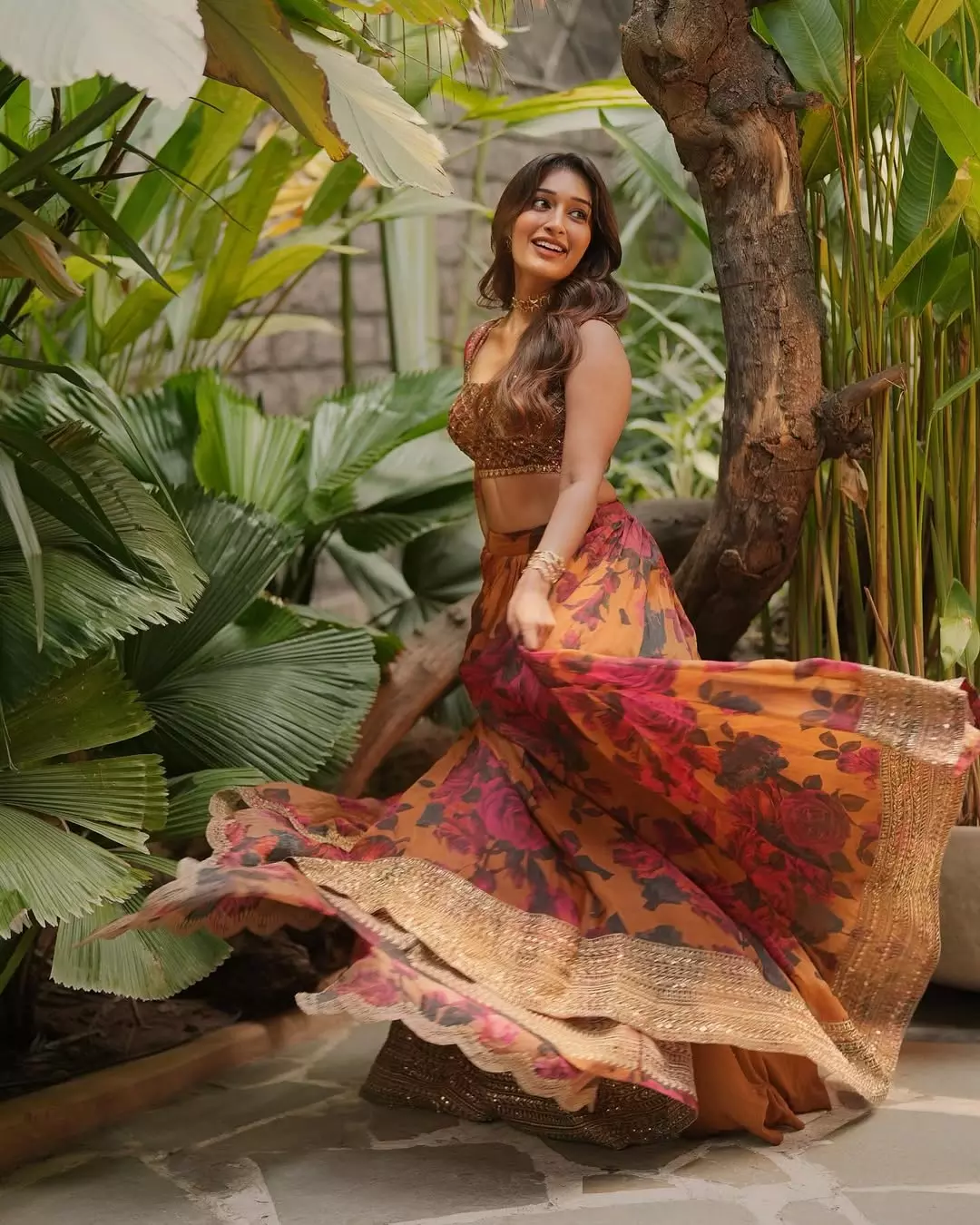 Niharika NM blooms amid jungle greens in a fiery floral lehenga by @asthanarangofficial, rust-gold sequined blouse catching dappled sun while the organza skirt swirls like autumn fire.