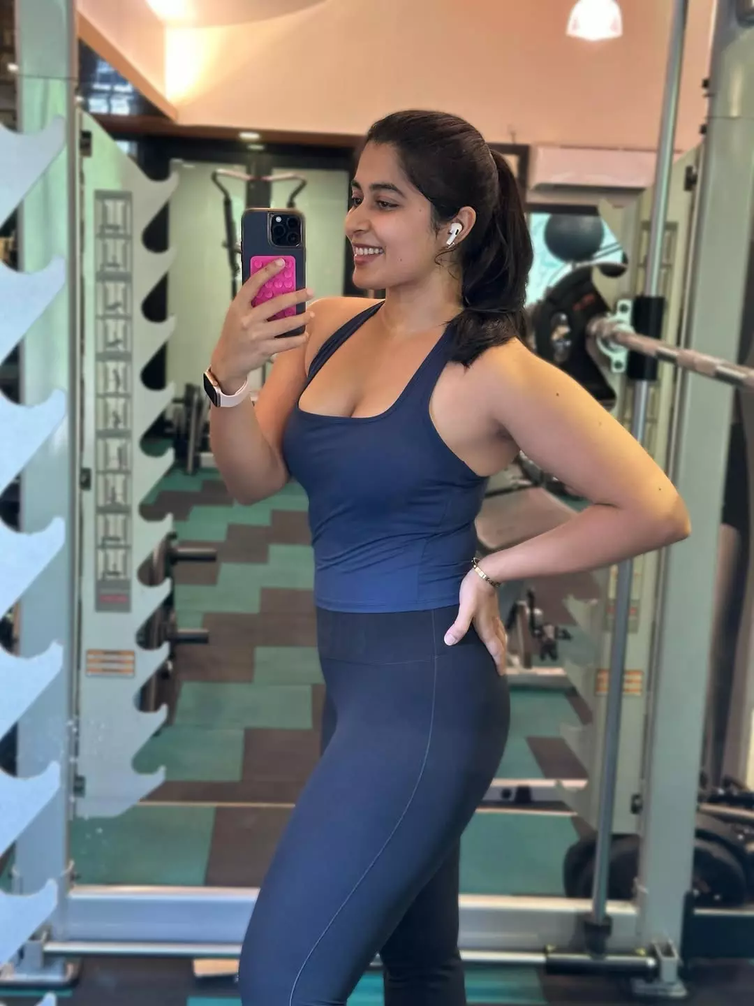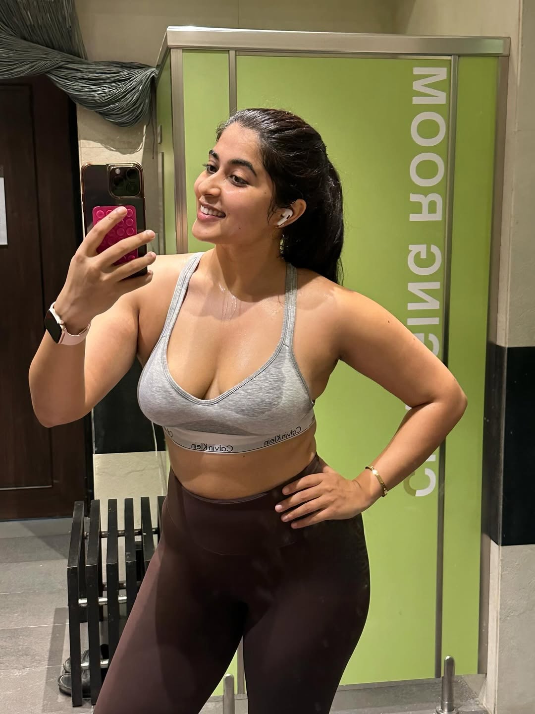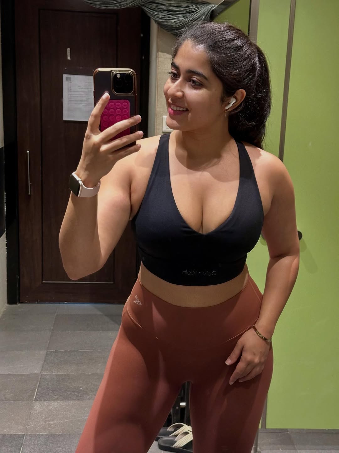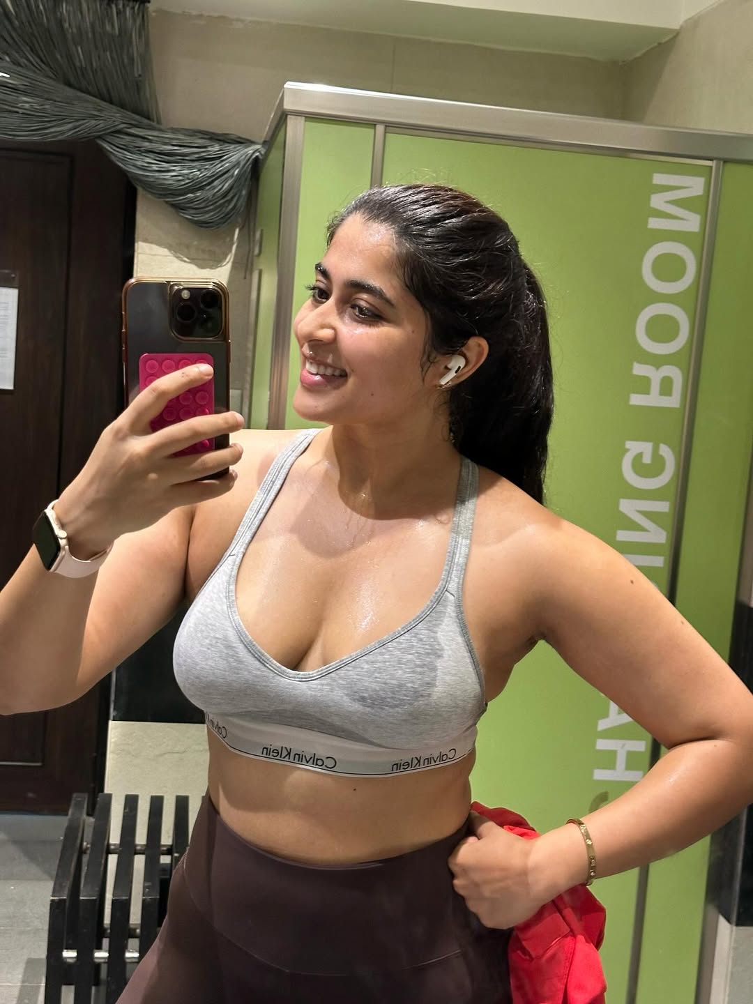 This dynamic image of Nikita Sharma captures her infectious energy and dedication to fitness in full swing. Sporting a sleek navy workout top and black leggings, she exudes confidence and joy, even after an intense gym session. The subtle sheen of sweat on her skin reflects her hard work and commitment to maintaining a healthy lifestyle.