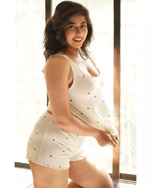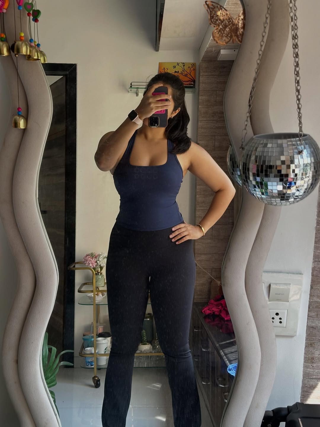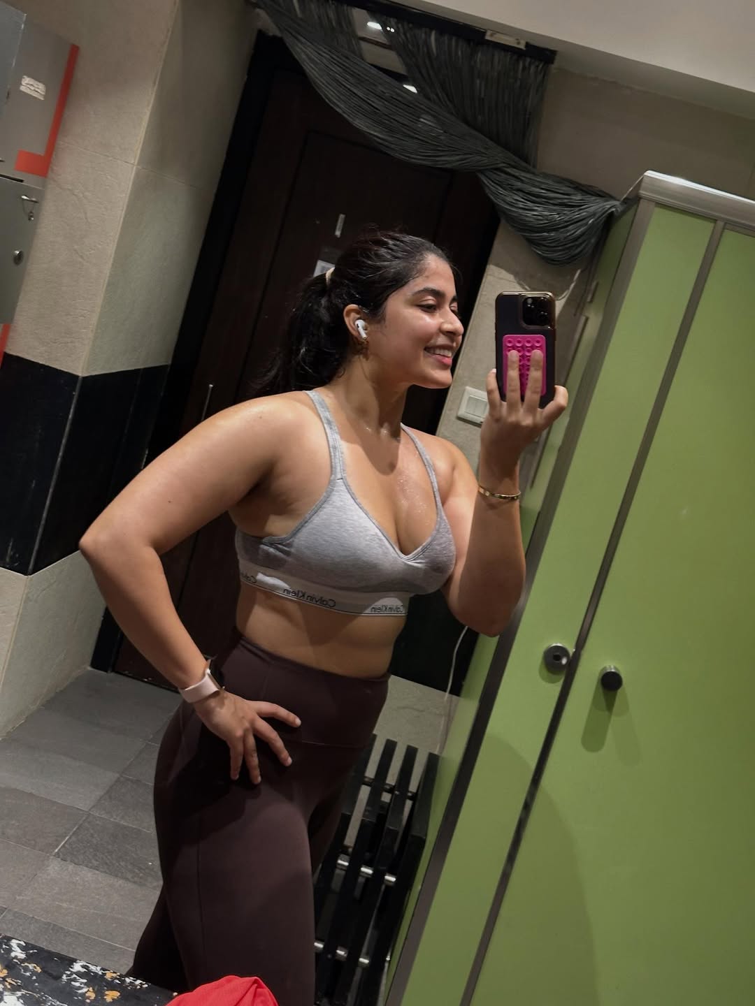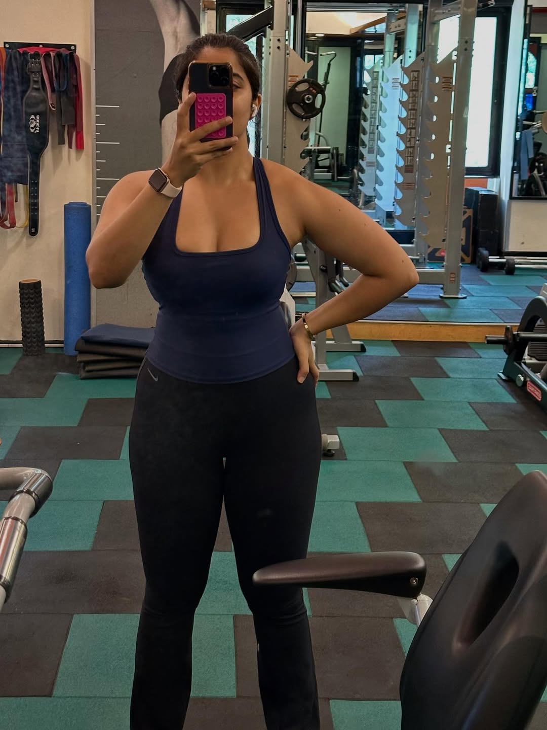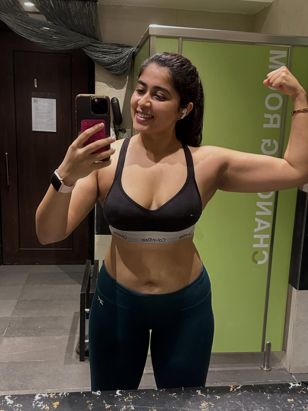 This dynamic image of Nikita Sharma captures her infectious energy and dedication to fitness in full swing. Sporting a sleek navy workout top and black leggings, she exudes confidence and joy, even after an intense gym session. The subtle sheen of sweat on her skin reflects her hard work and commitment to maintaining a healthy lifestyle.