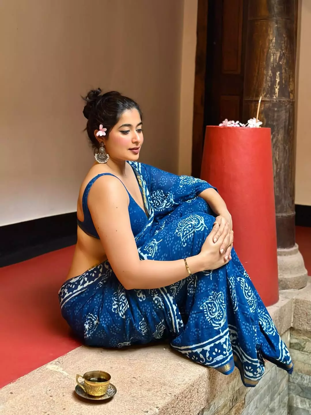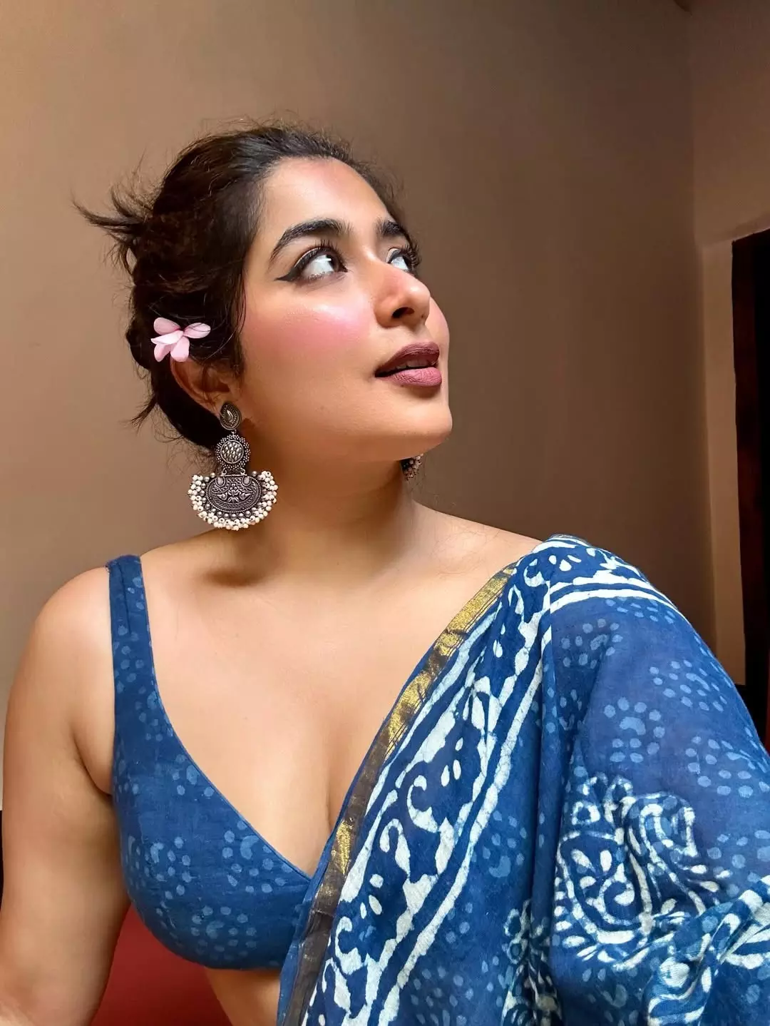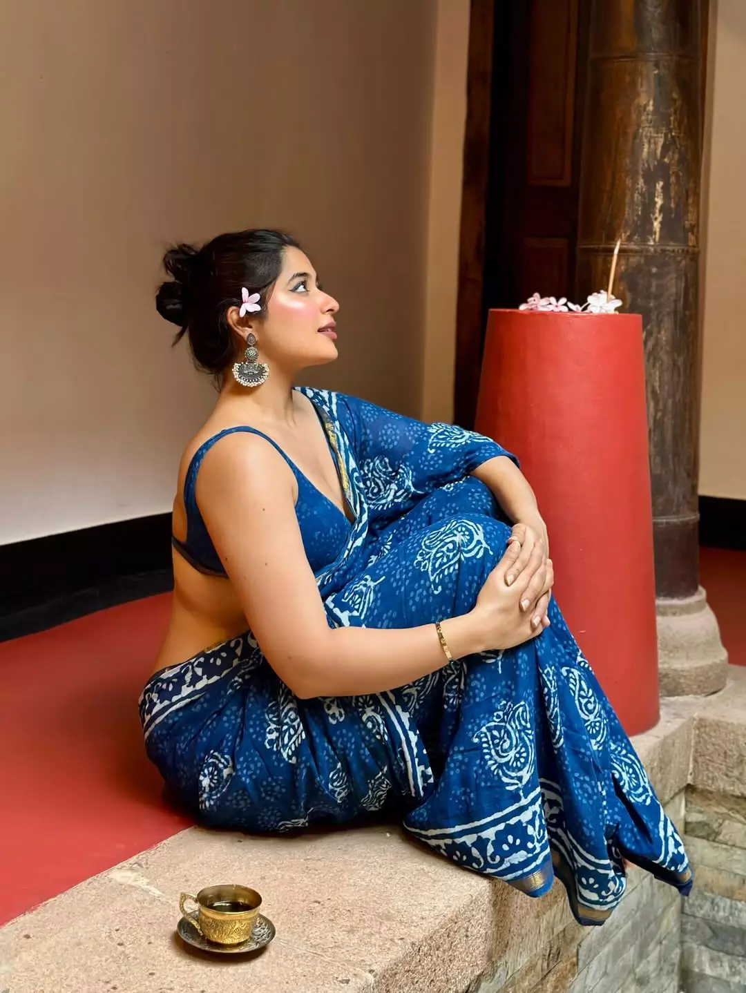In a recent post, Nikita looked effortlessly elegant in a blue saree featuring white block prints and a delicate gold border.