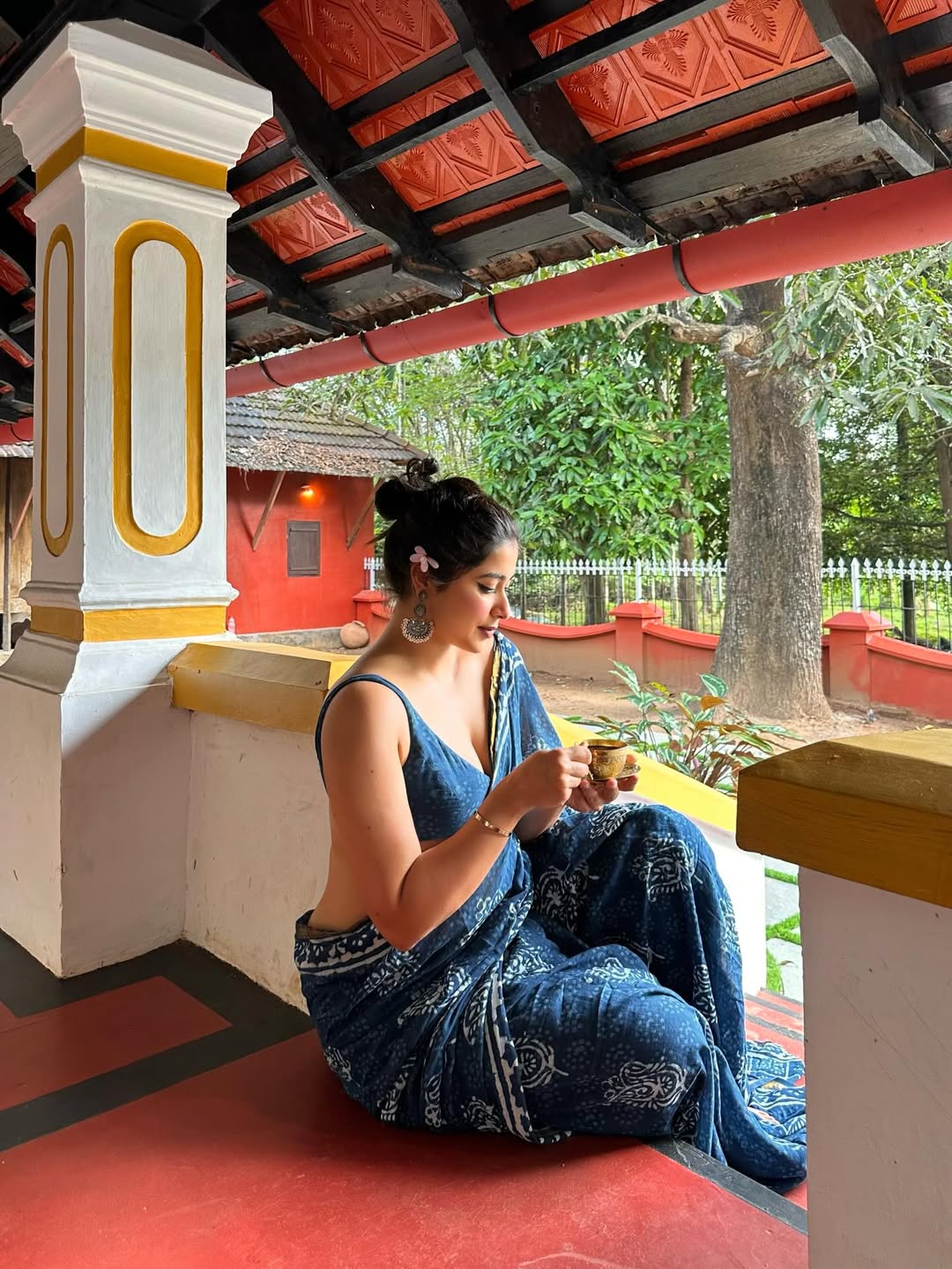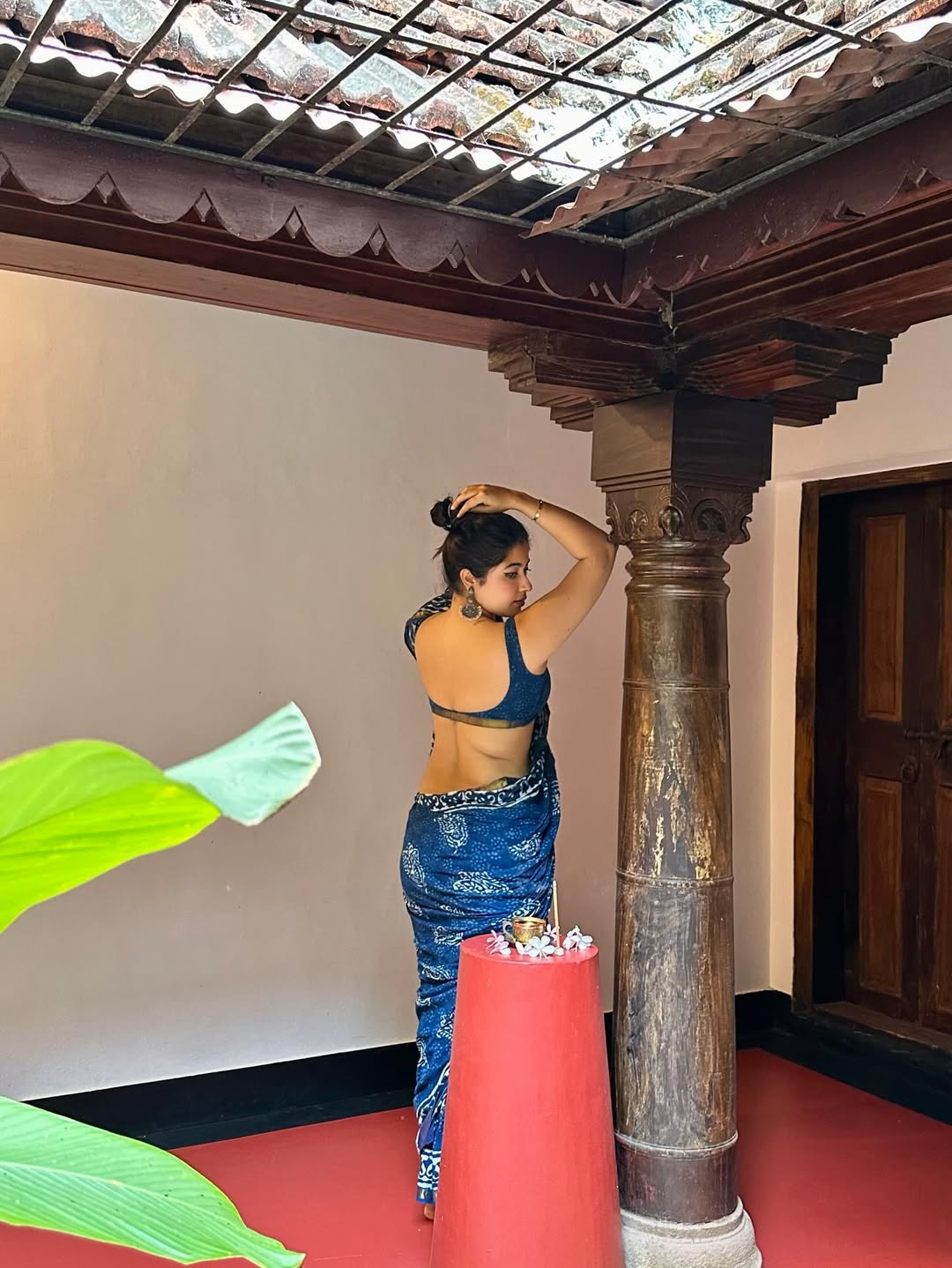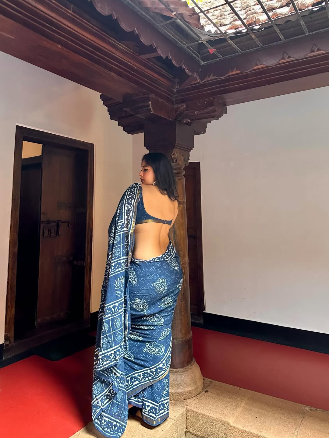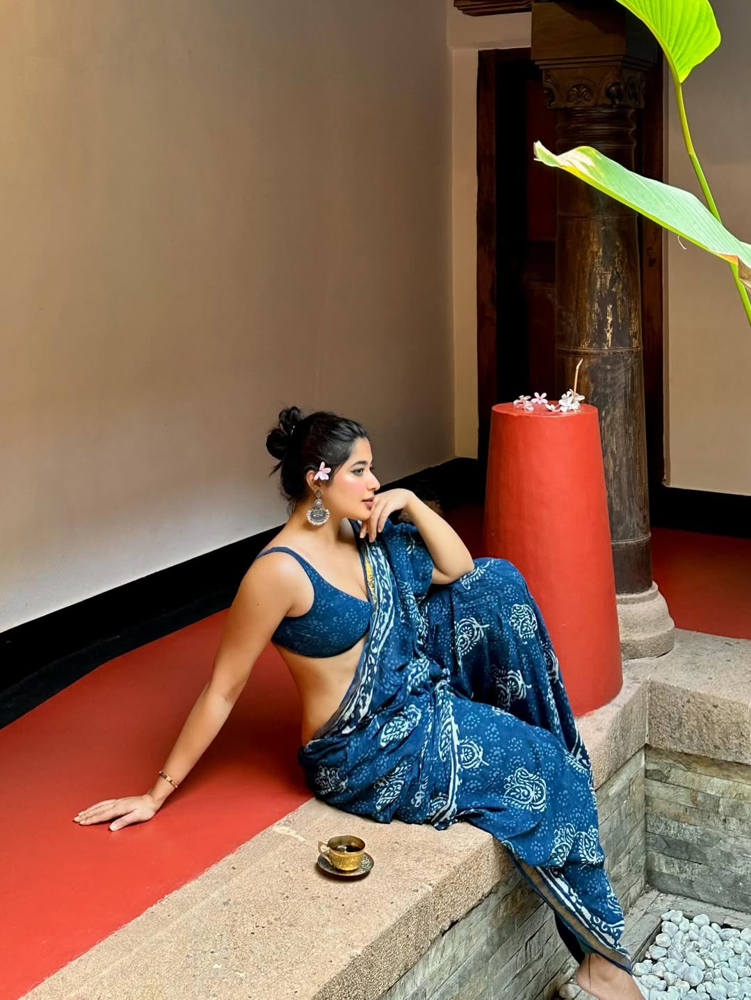 In a recent post, Nikita looked effortlessly elegant in a blue saree featuring white block prints and a delicate gold border. The ensemble beautifully blends classic charm with modern aesthetics, reflecting her knack for making traditional wear feel fresh and relatable. Her thoughtful choice of design studios highlights her eye for detail and appreciation for craftsmanship.