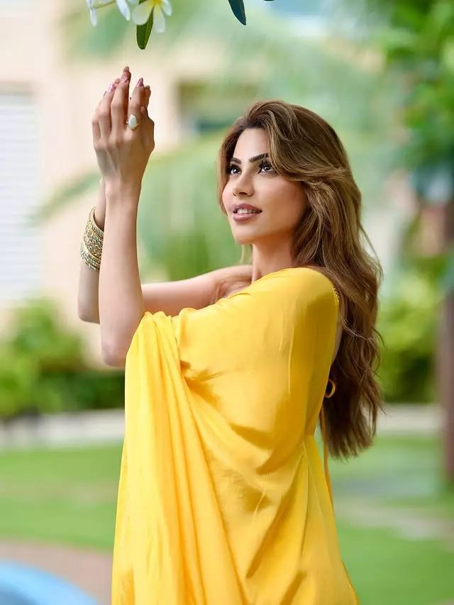 In this captivating picture, Nikki looks radiant in a bright yellow saree paired with a stylish, embellished blouse featuring a cute heart-shaped detail. She accessorizes with golden bangles, statement rings, and perfectly styled wavy hair, exuding elegance with a hint of playful glamour. Her soft makeup and glossy lips add the perfect finishing touch. Nikki�s bold fashion choices always inspire her fans to embrace colour and confidence.